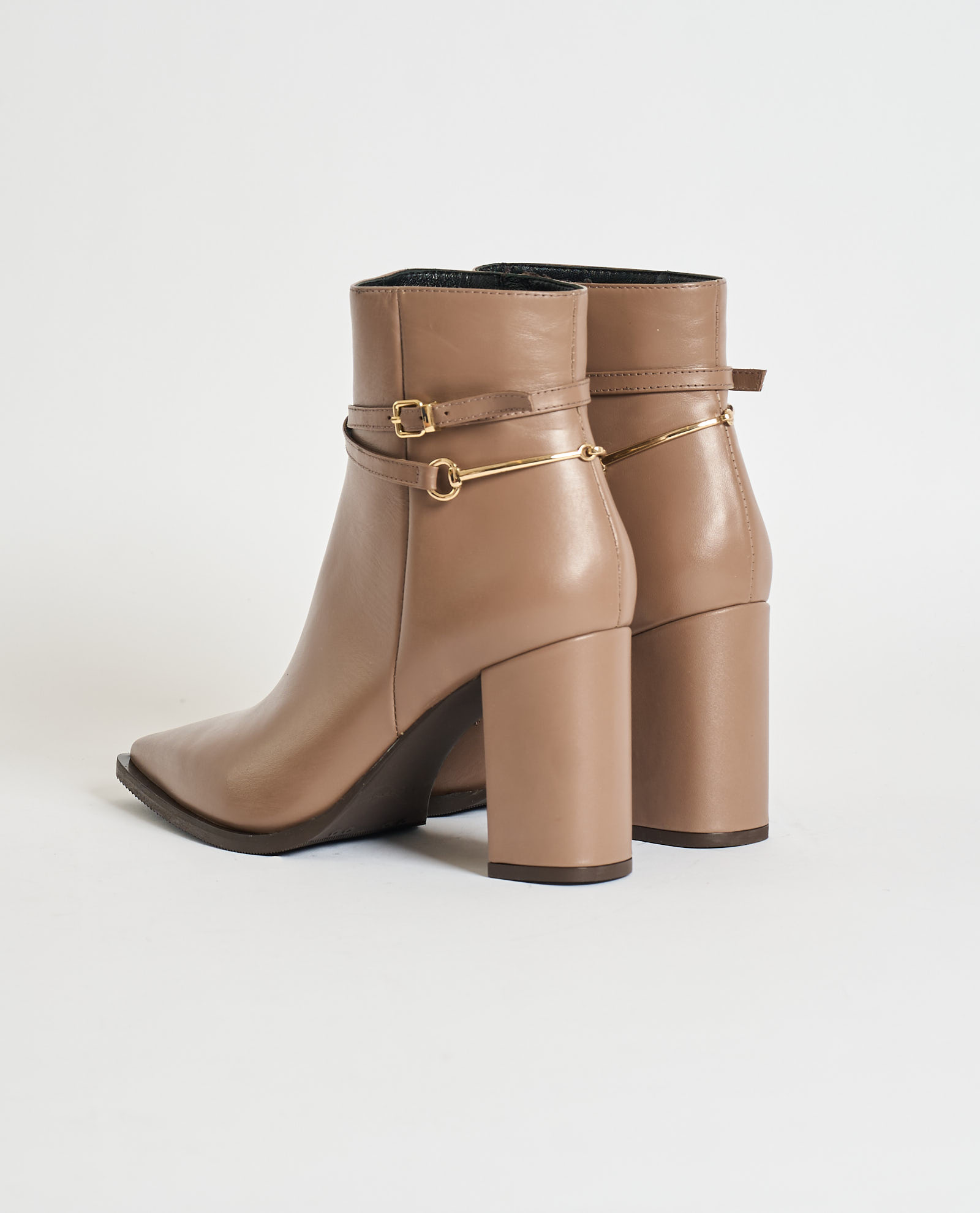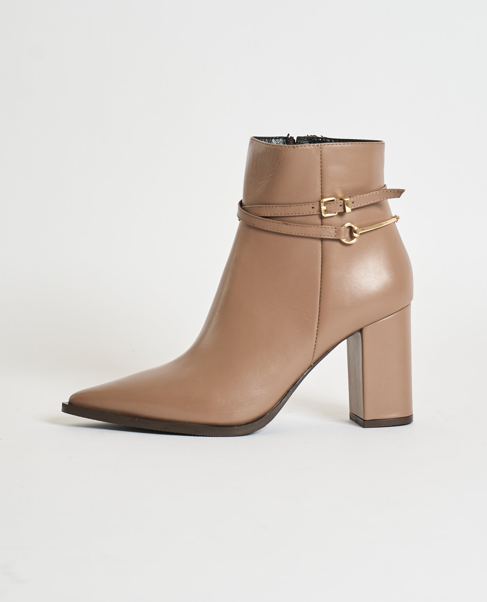 Women's booties by Albano made of smooth leather and Made in Italy. Inner zip closure, adjustable side strap with gold buckle, pointed toe. 80mm heel