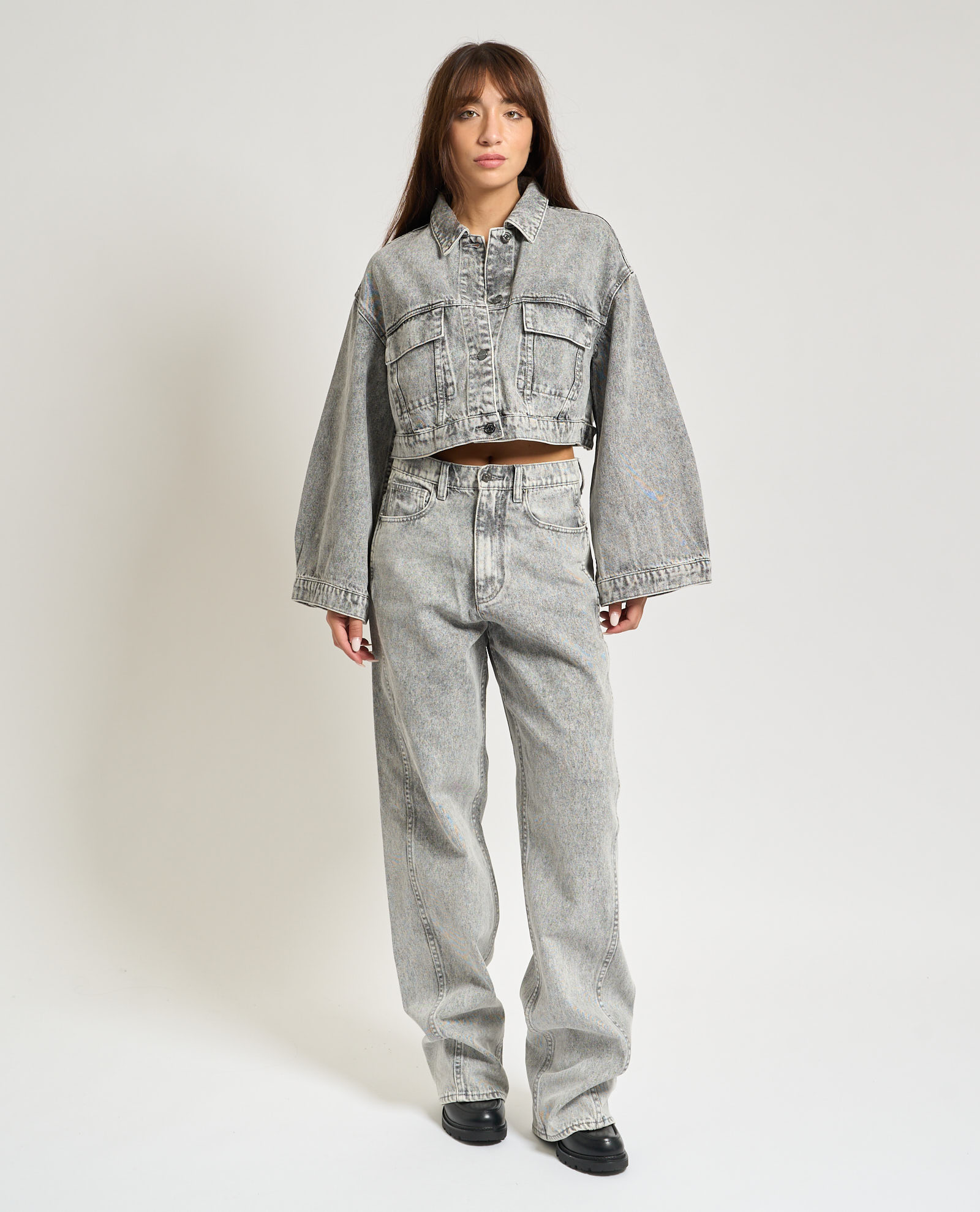 Armani Exchange women's relaxed fit jeans in grey wash, 5-pocket model. Model wears size 26 and is 165cm tall