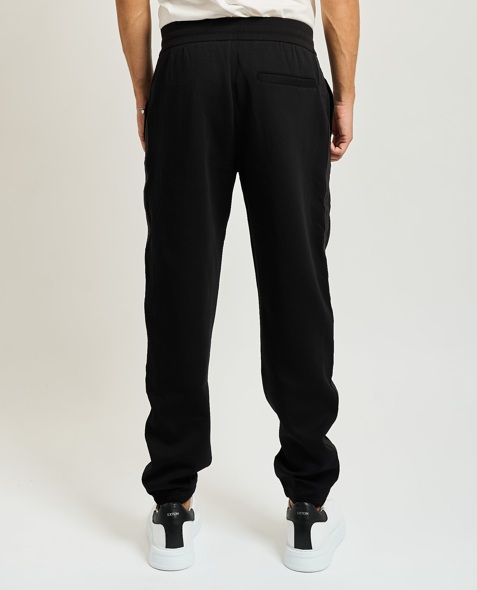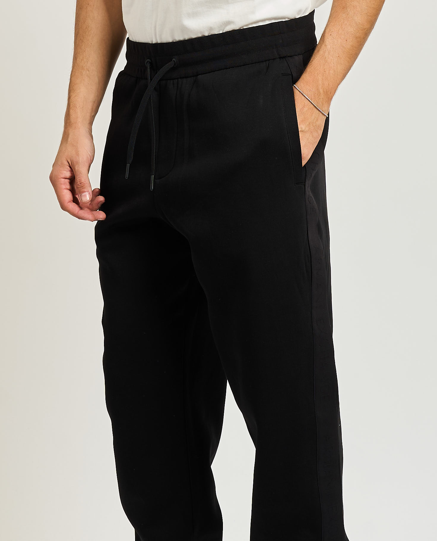 Men's Armani Exchange pants with side bands, regular fit, elasticated waist with adjustable drawstring, side welt pockets, A|X branded tone-on-tone band detail applied along the sides. The model wears size M and is 185cm tall