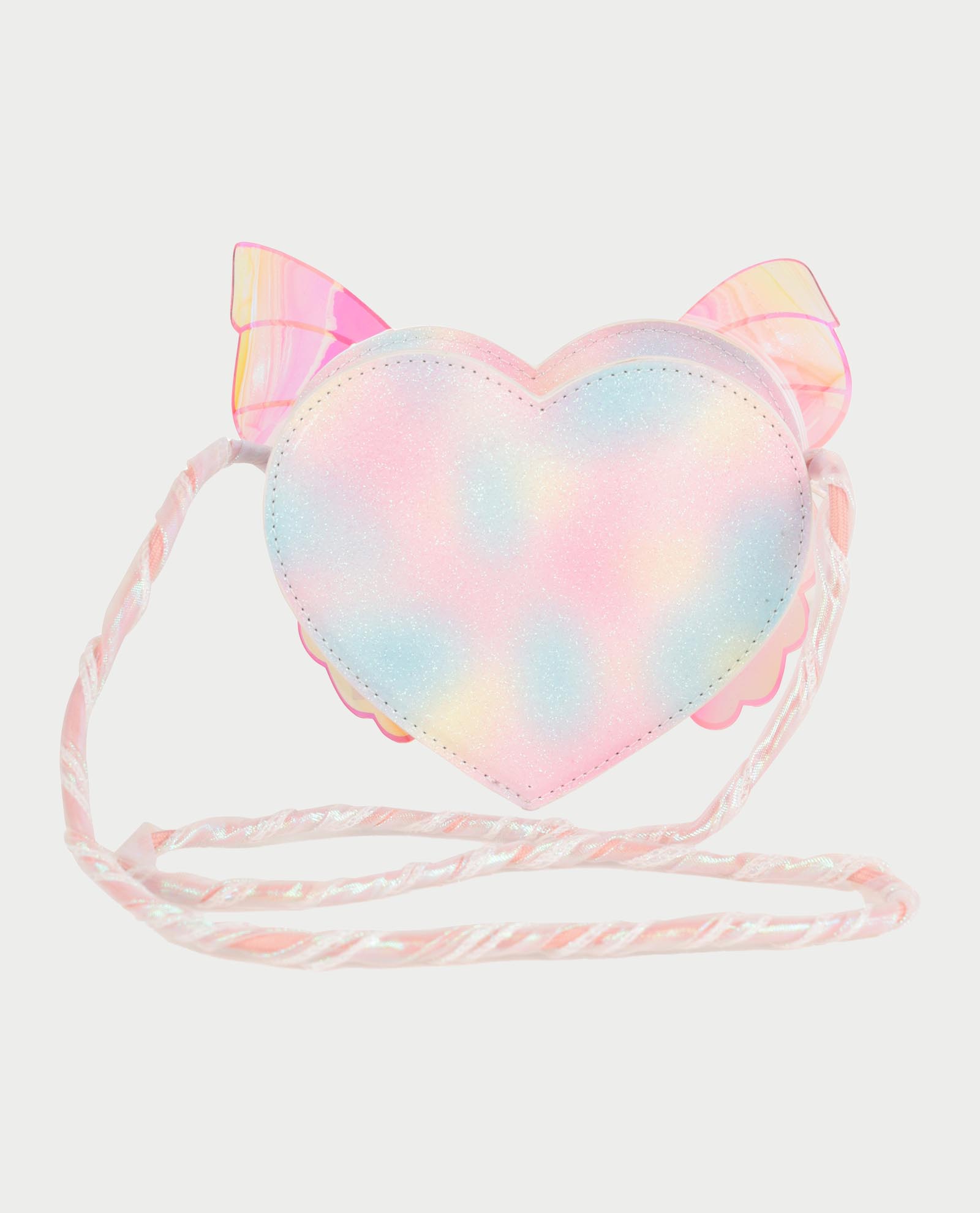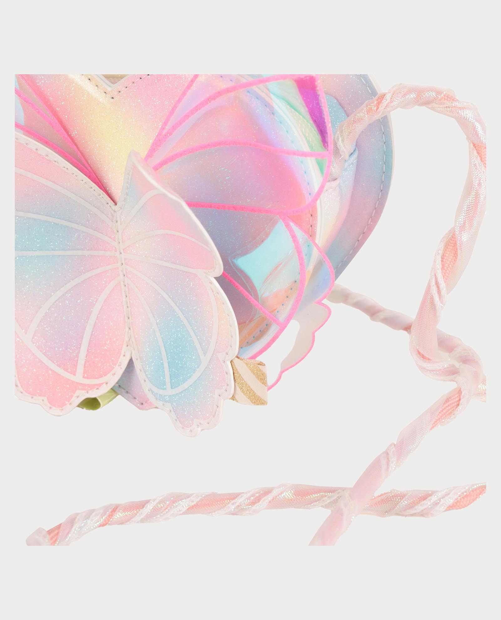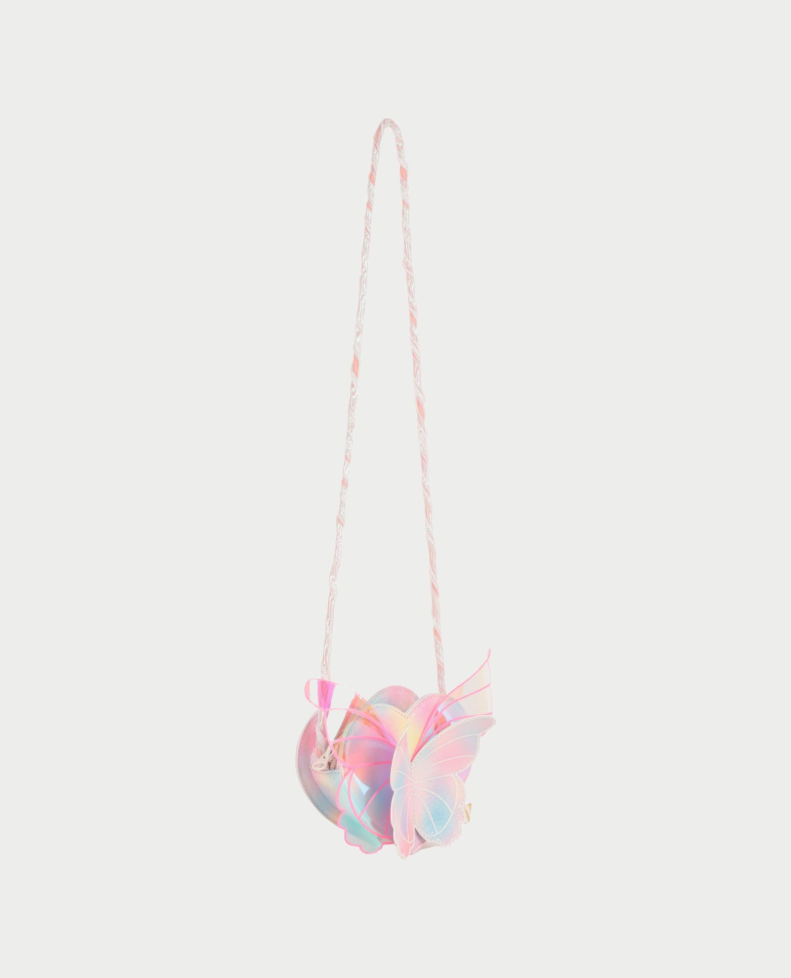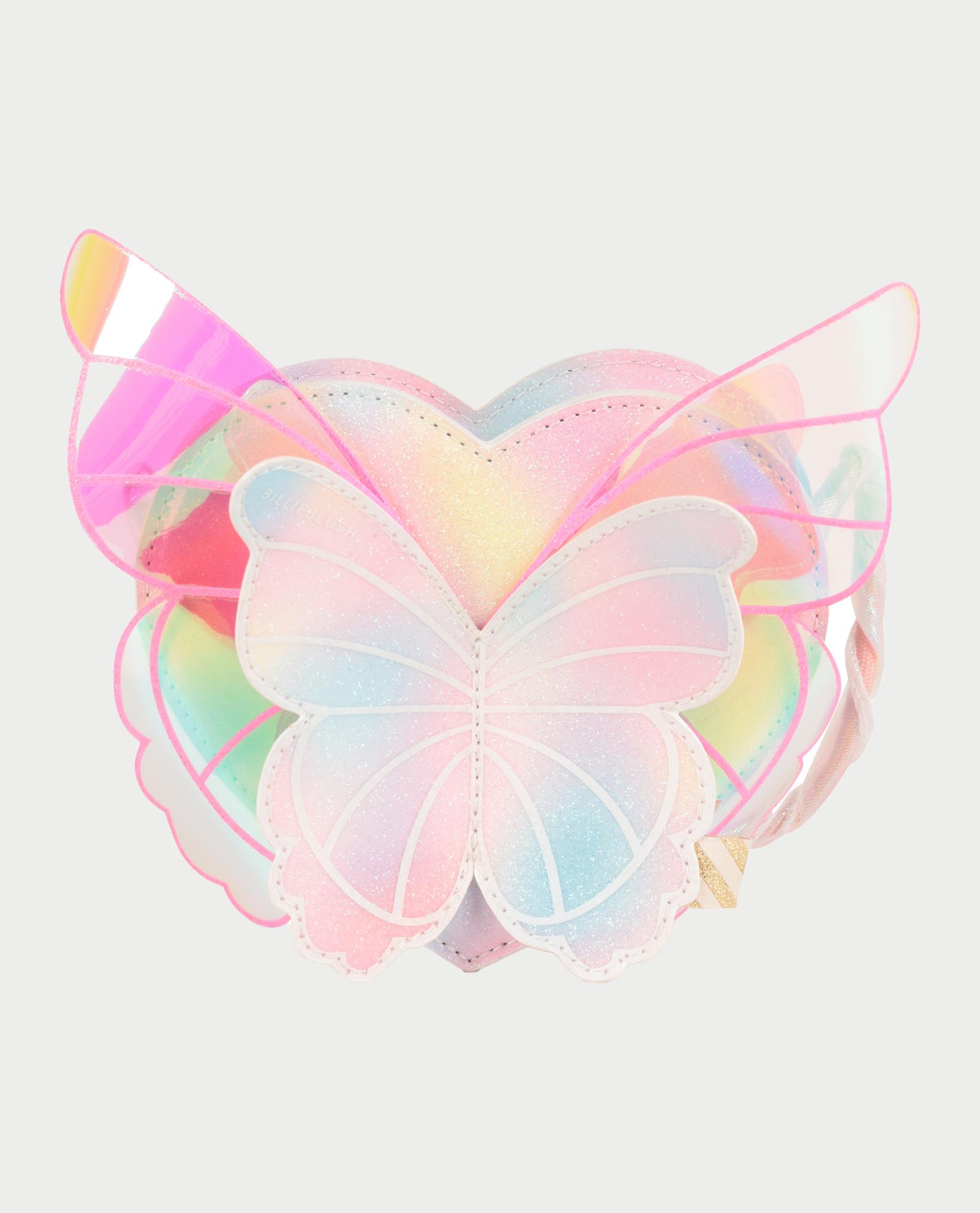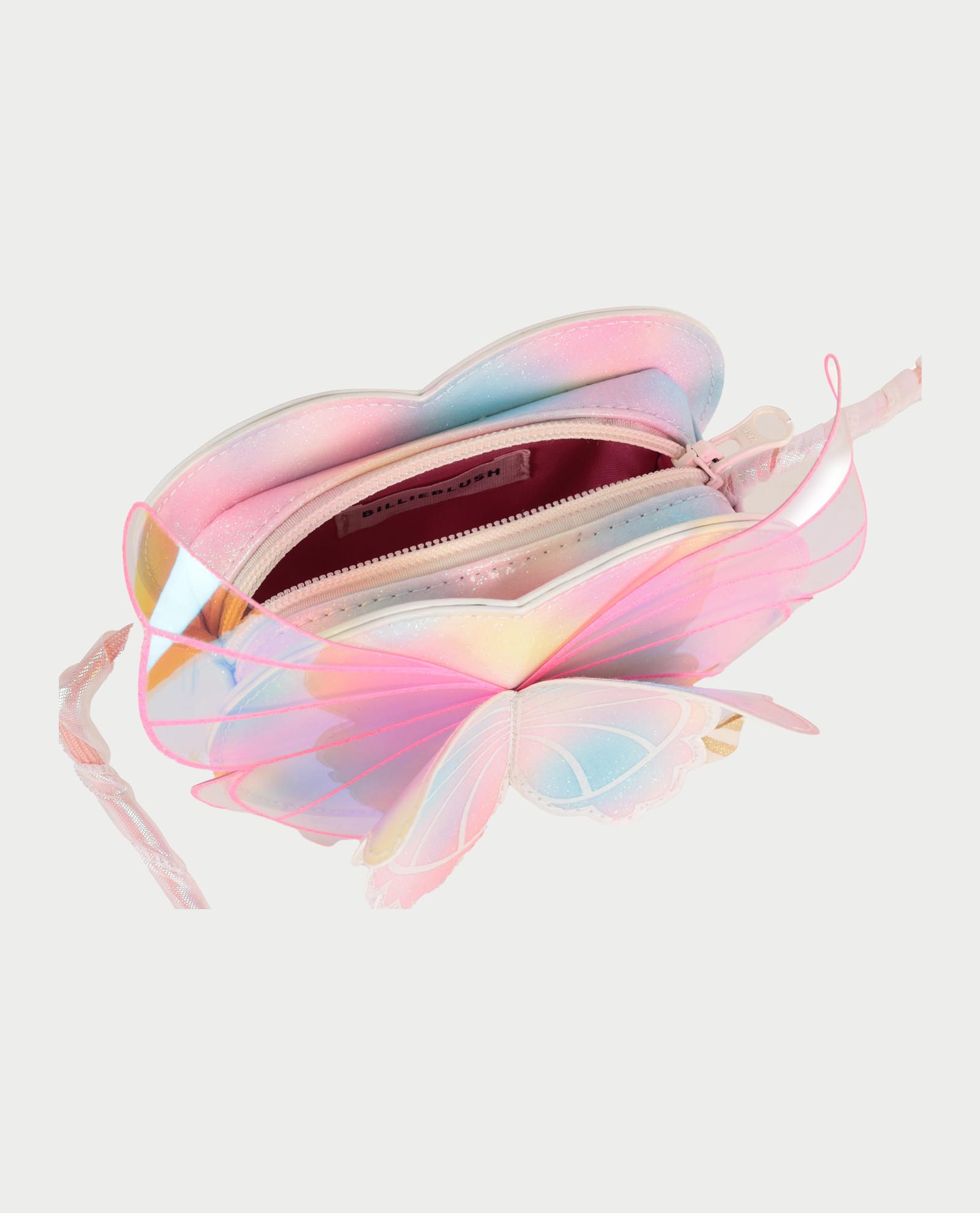 Billieblush handbag, adorned with multicolored sequins and shiny polyvinyl chloride with reflections. The double-layer Butterfly illustration and fantasy strap give a dynamic touch.