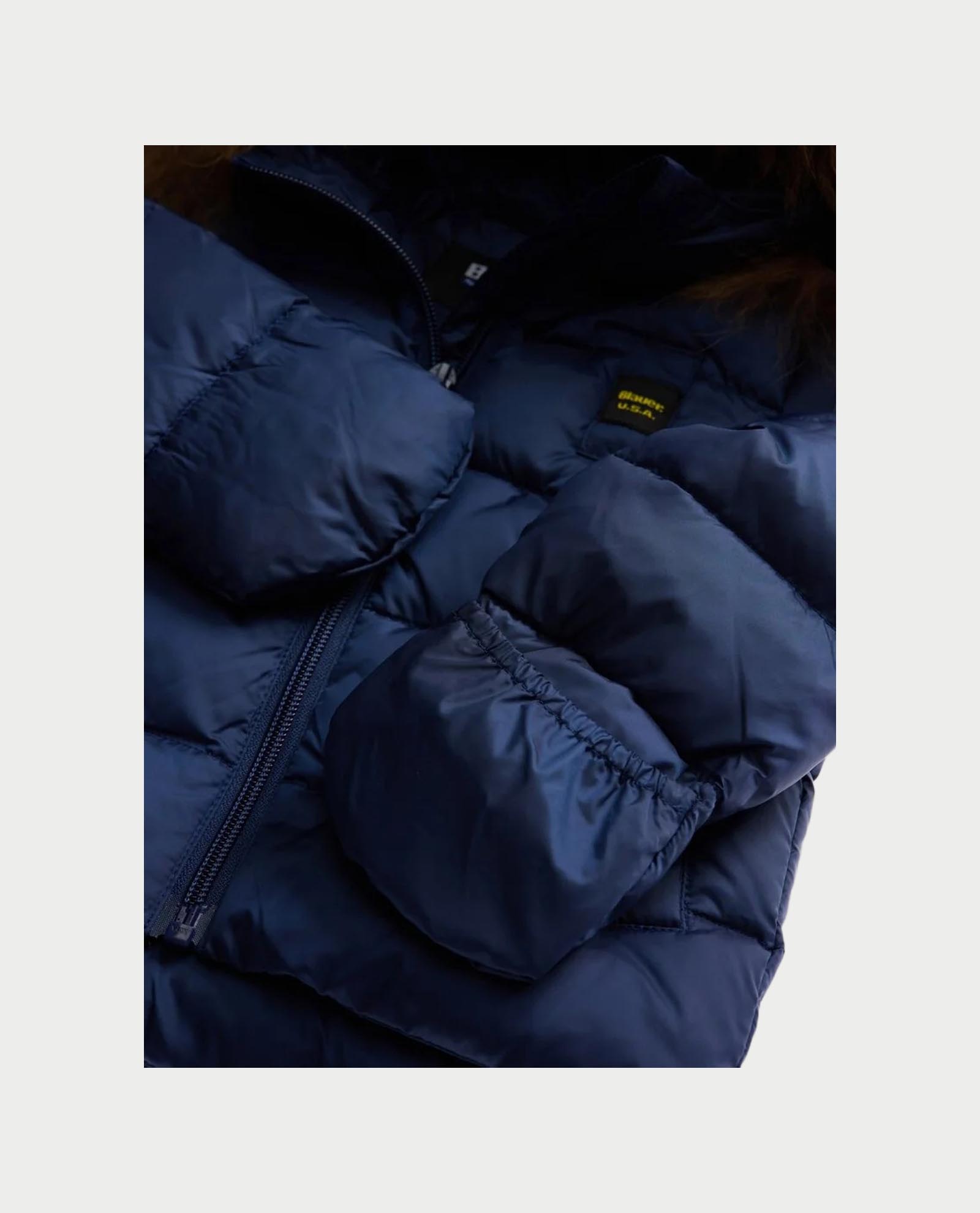 Blauer-branded down jacket for newborns made of shiny nylon with horizontal quilting. Fixed hood with drawstring and fur trim, full zip closure and pockets. Logo patch. Regular fit.