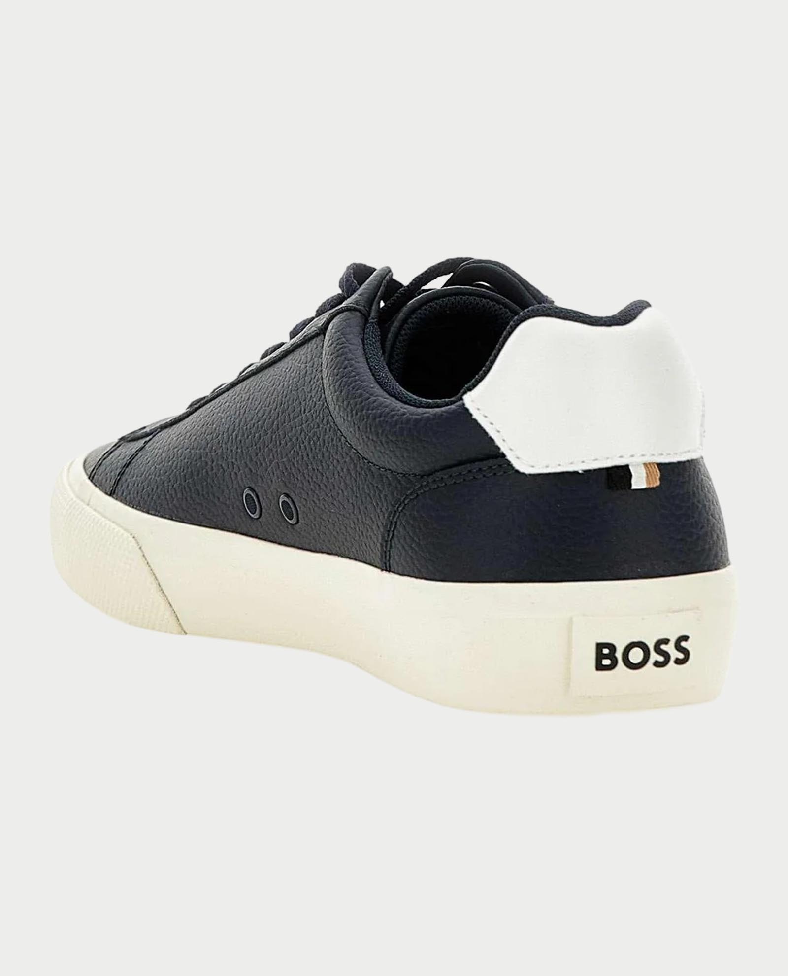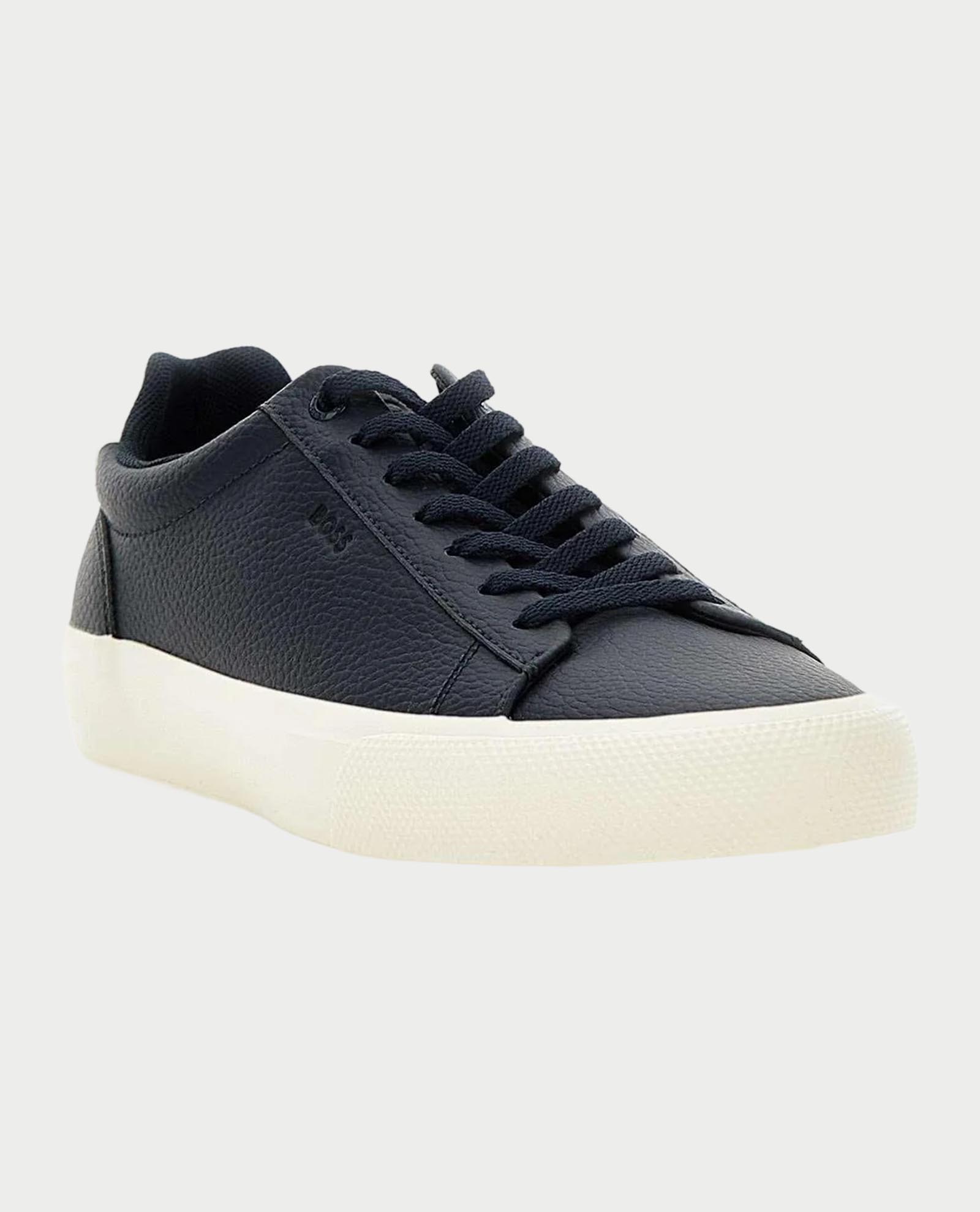Men's low-top sneakers by Boss with a synthetic upper covered in a hammered finish. Lace-up, round toe, rubber sole, contrasting heel, logo, and trim.