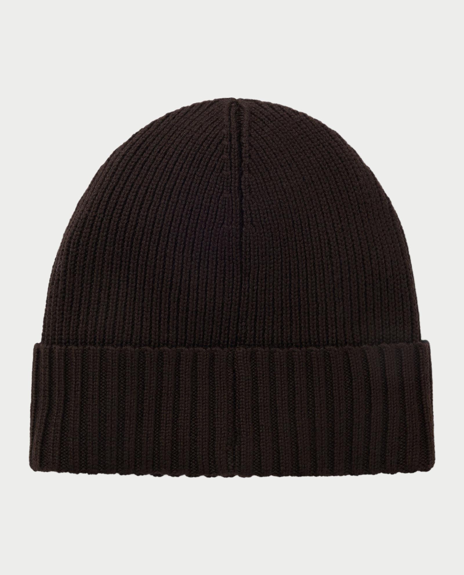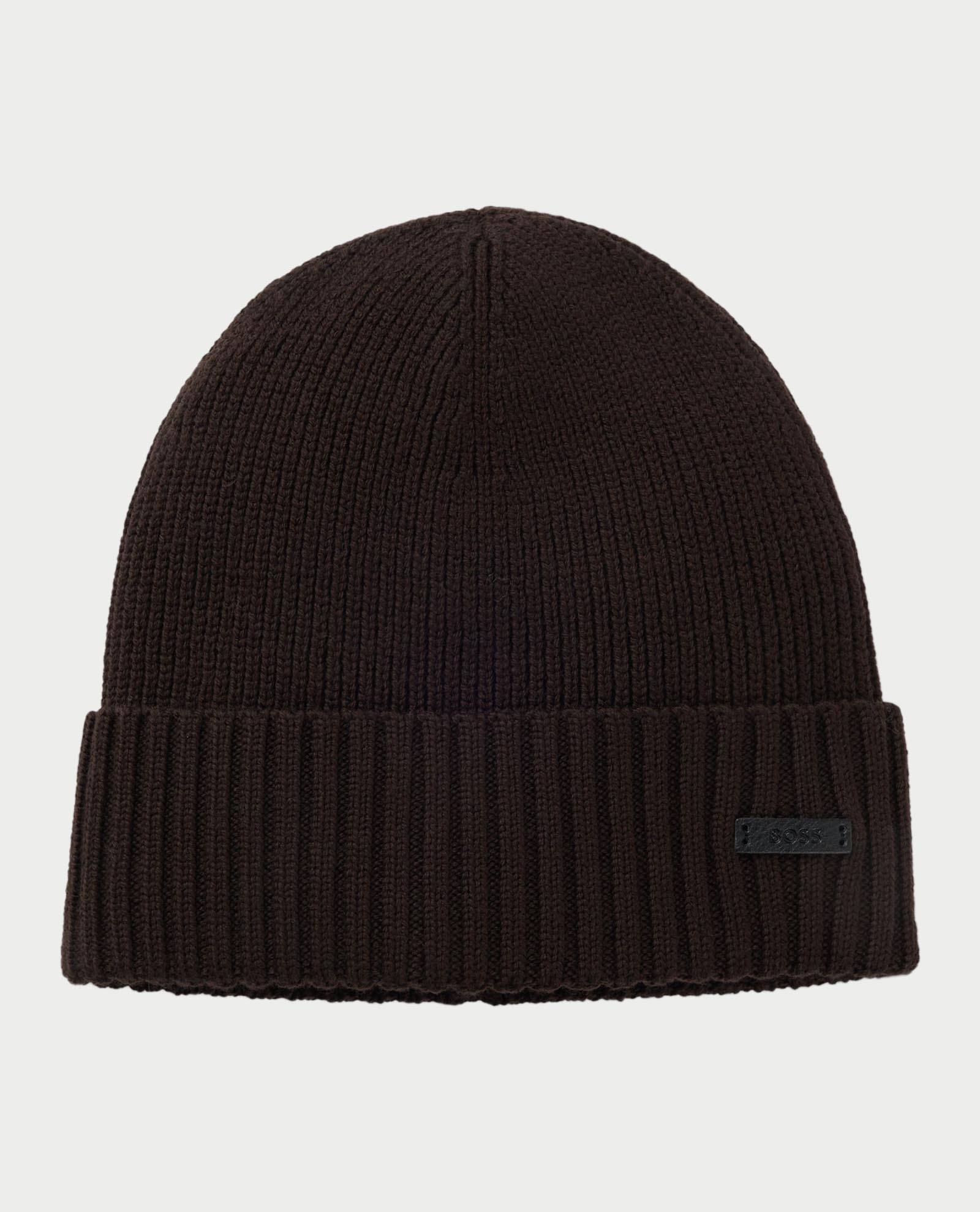 Boss beanie Fati model with all-over ribbed construction and faux leather logo tag.