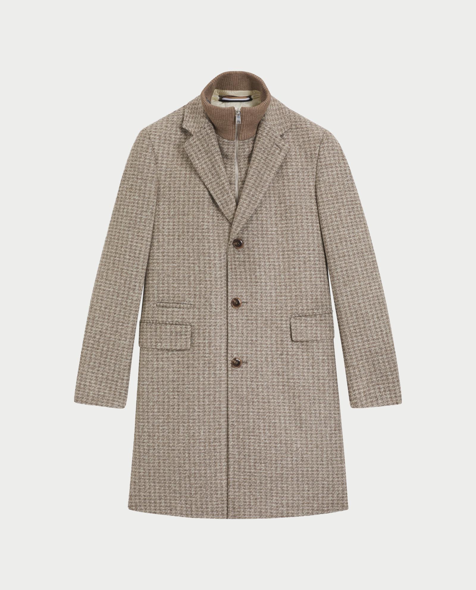 Men's coat by Boss from the Black line in soft stretch wool blend. Classic lapels, 3-button closure, light padding, removable zipped interior, back vent. The model wears an M and is 1.85m tall