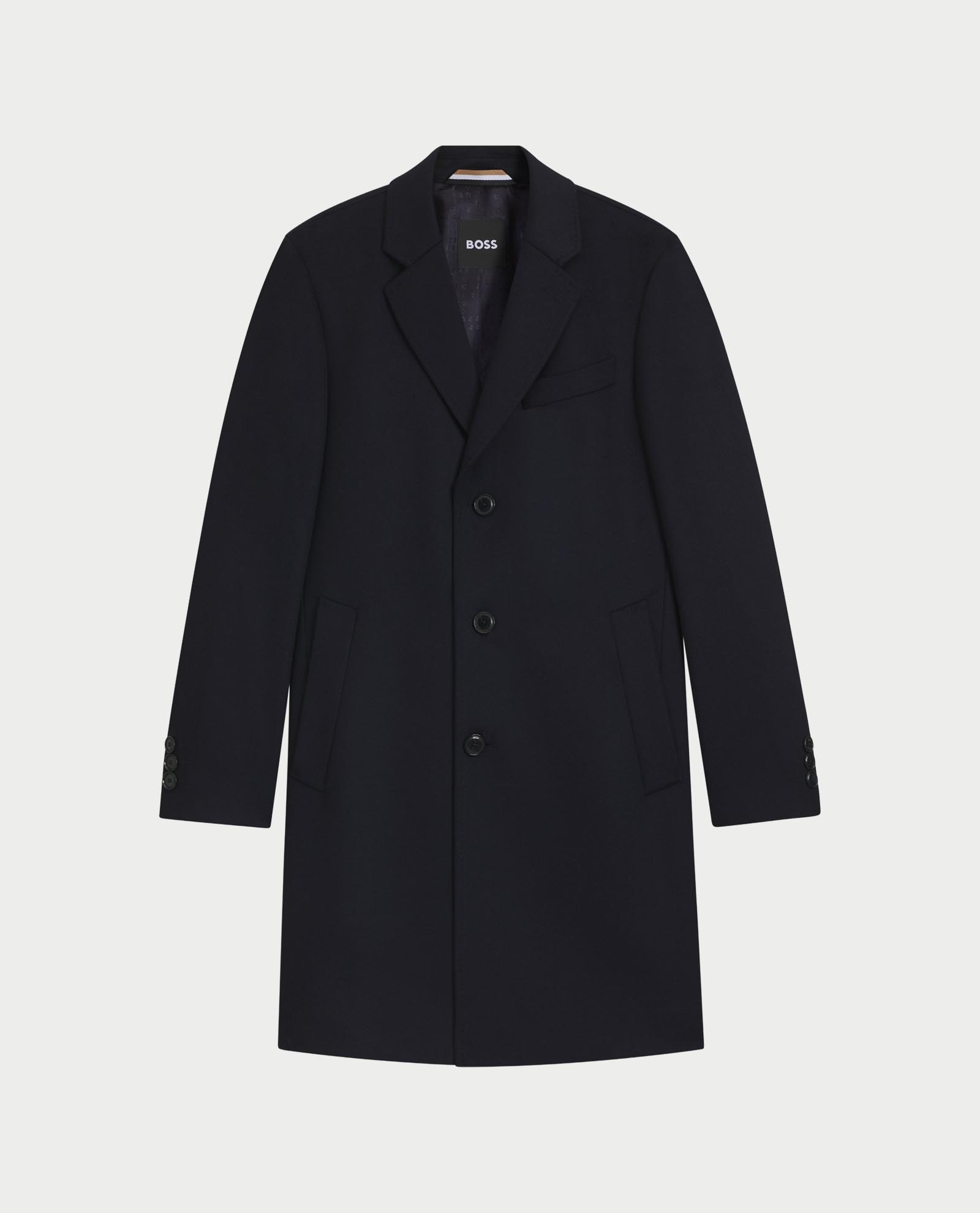 Men's long coat by Boss from the Black line in wool and cashmere blend. Classic lapels, 3-button closure. Chest and side pockets. Back vent, fully lined. Slim fit. The model wears an M and is 1.85m tall