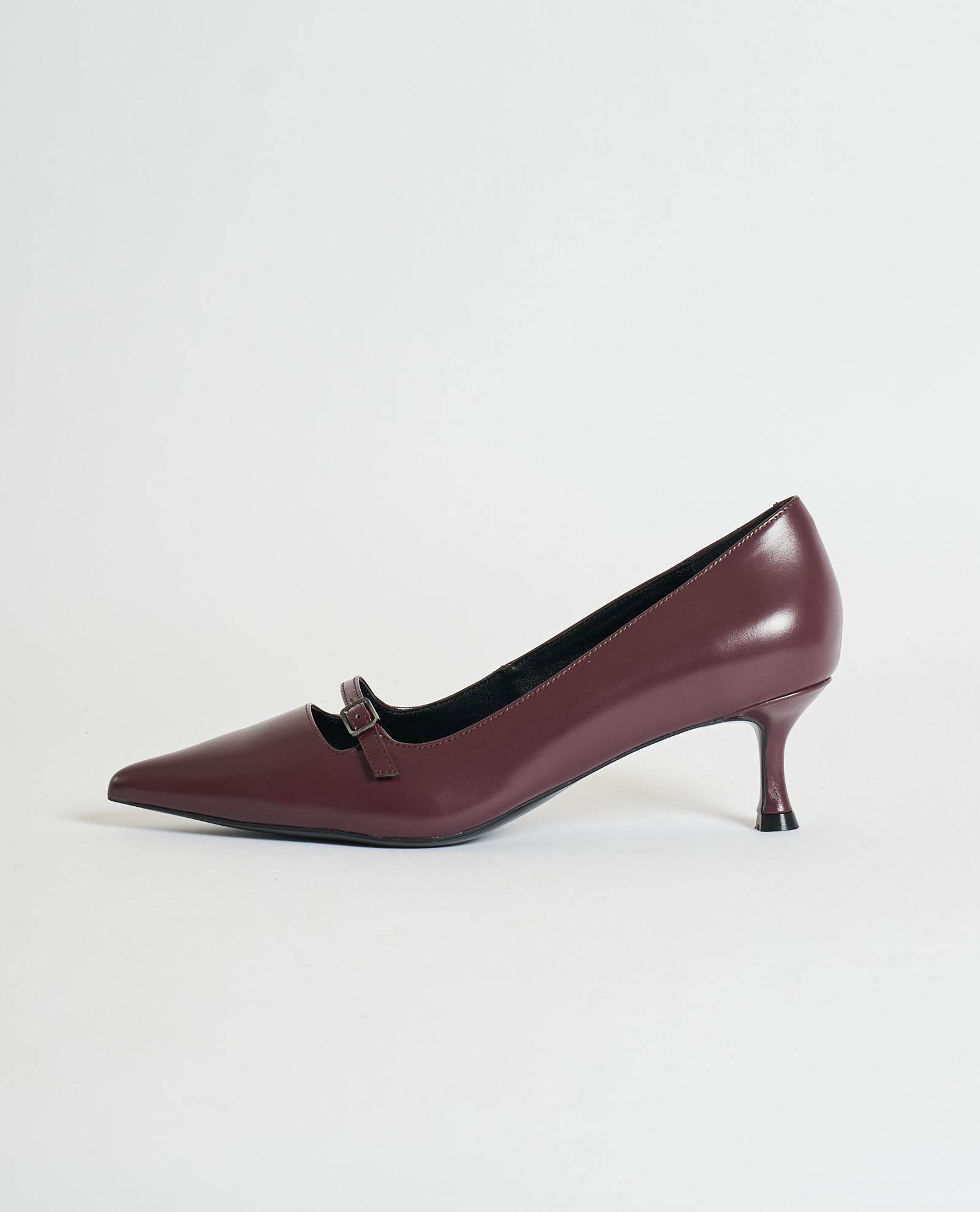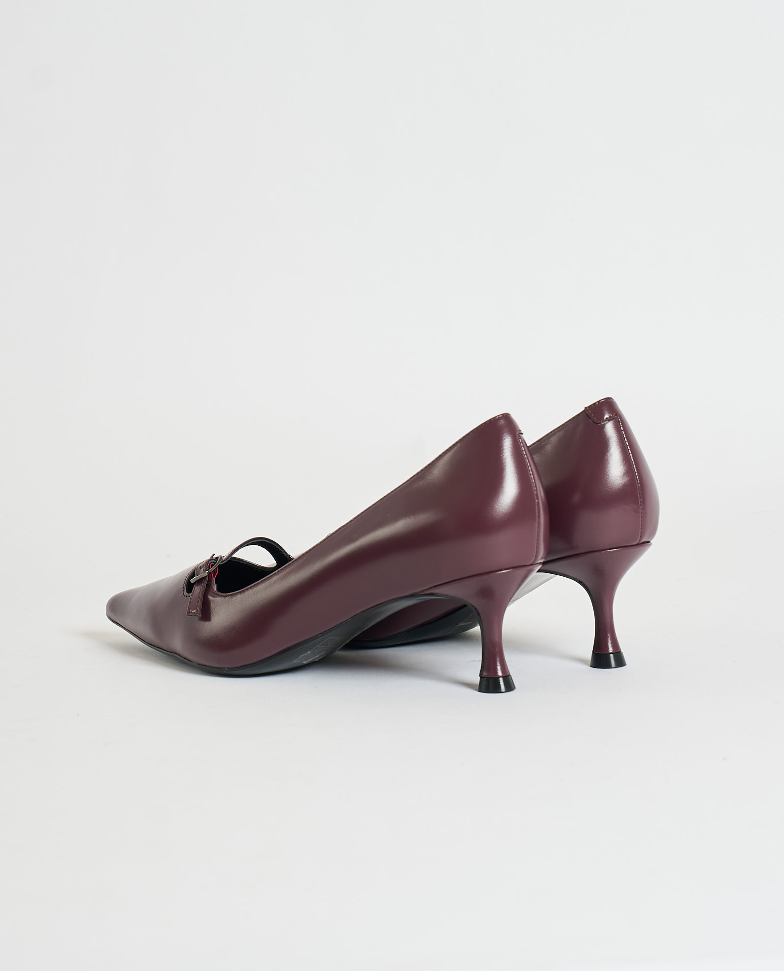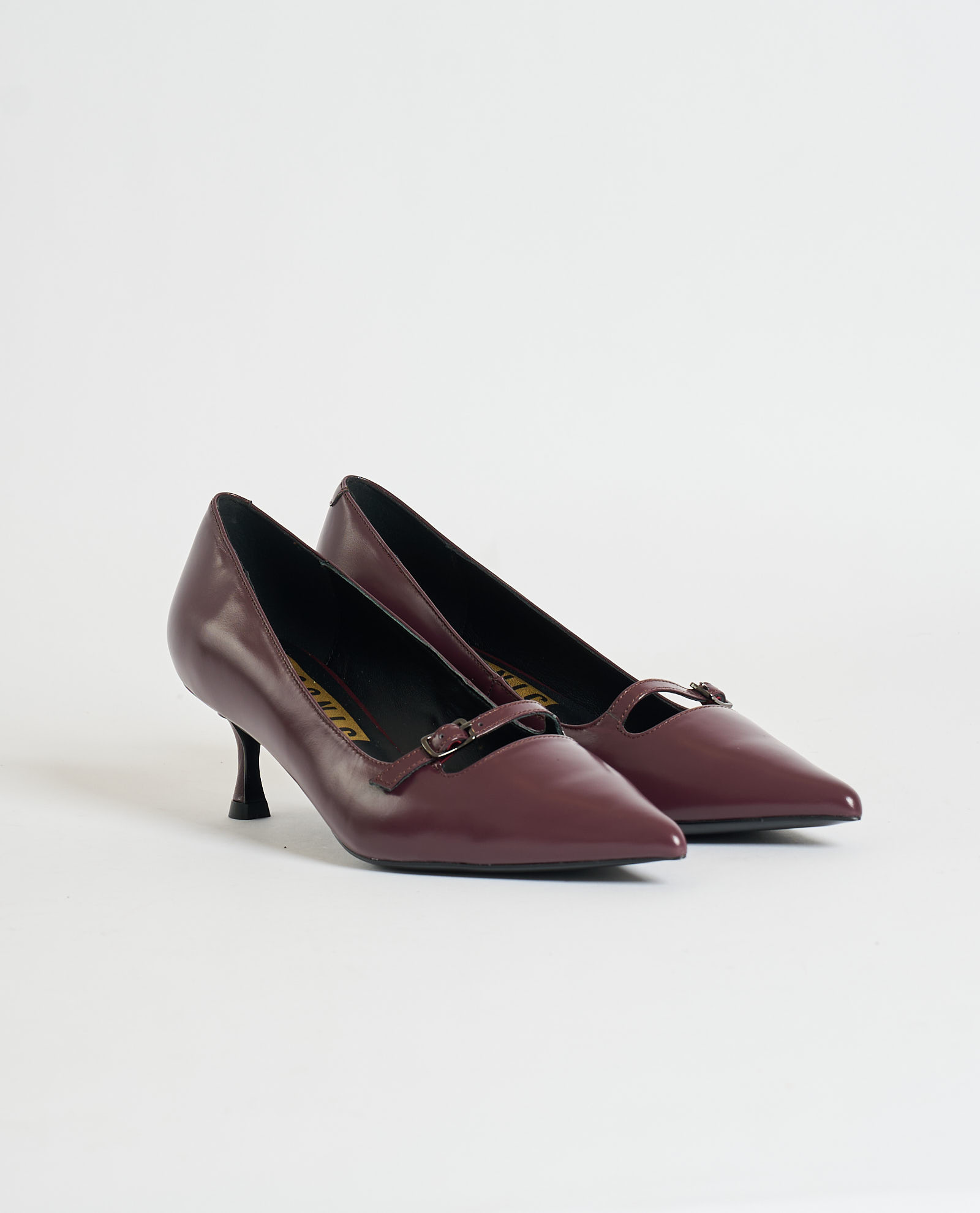 Chiconic leather pumps with slightly squared toe, adjustable strap on instep and covered heel. Heel height 5 cm