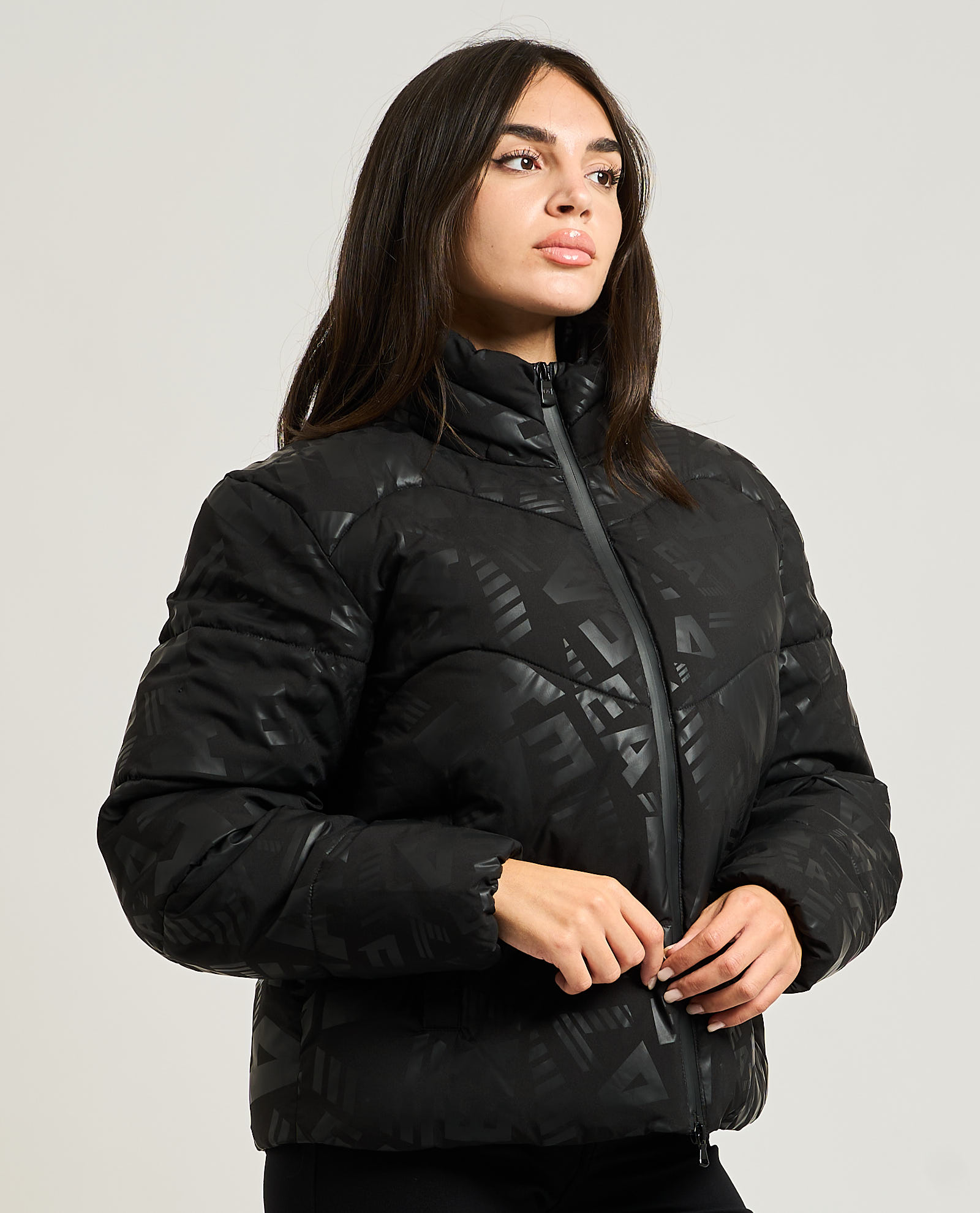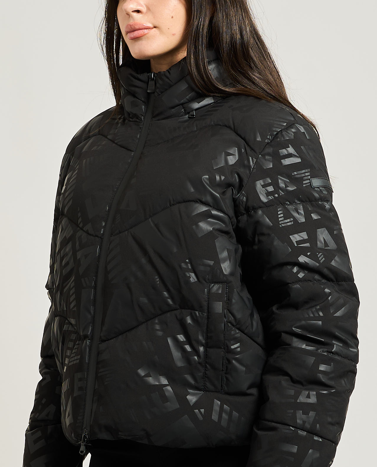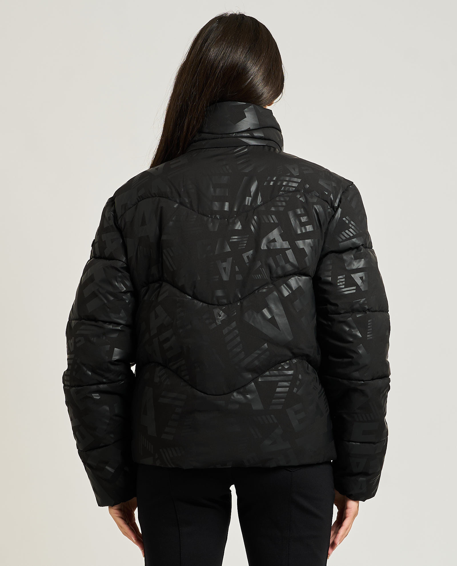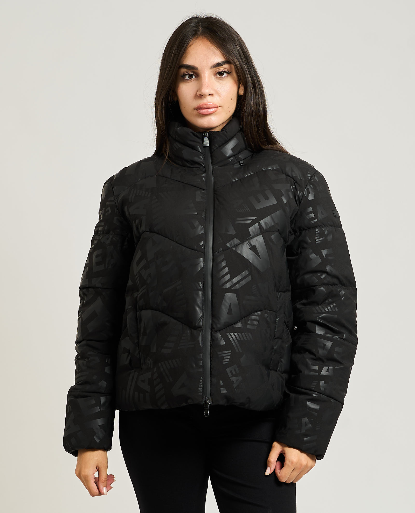 Padded women's jacket by EA7 made of nylon. High neck with hidden hood, full-zip closure, side pockets, wave quilting, all-over monogram pattern. Regular fit. The model wears size S and is 1.65m tall