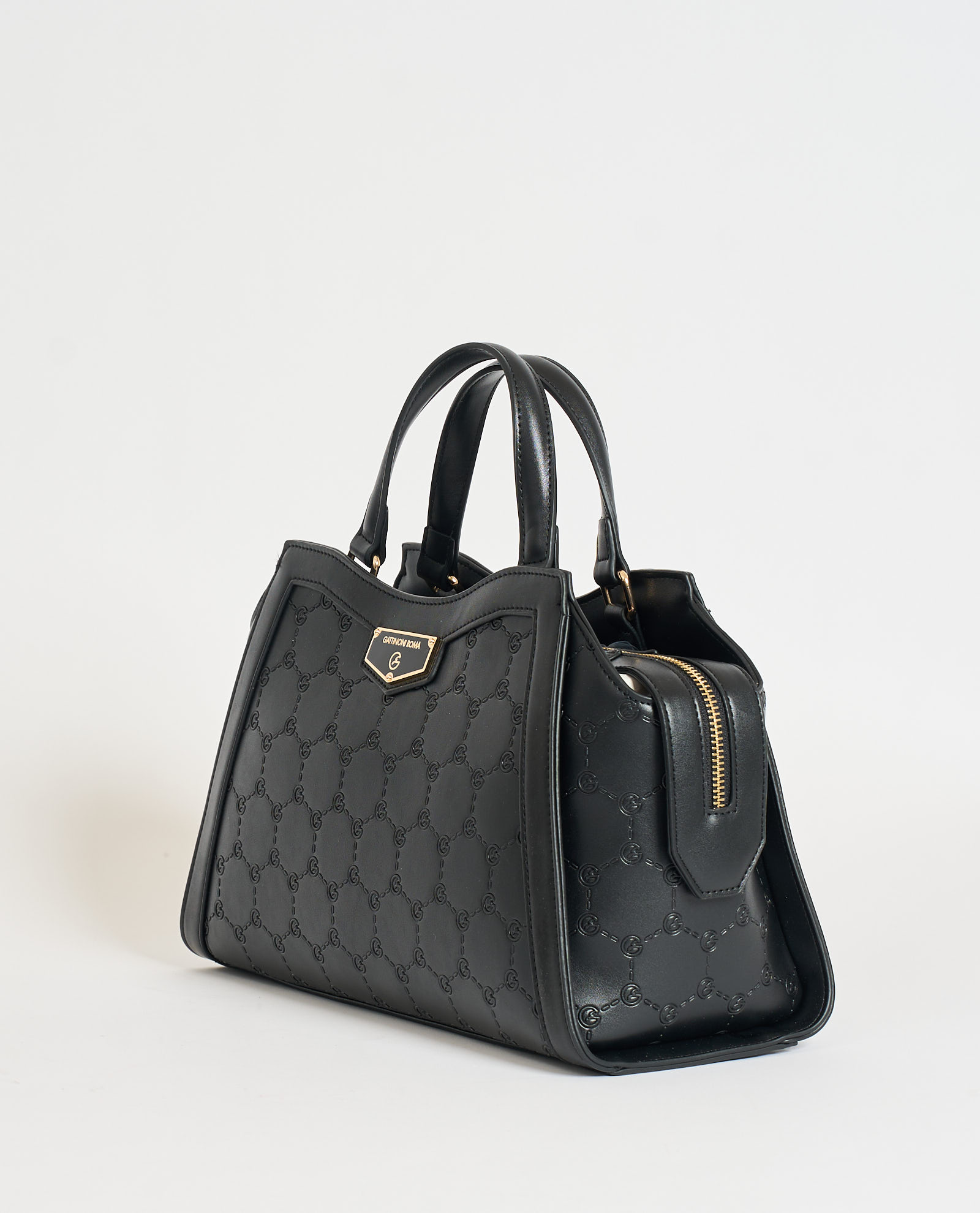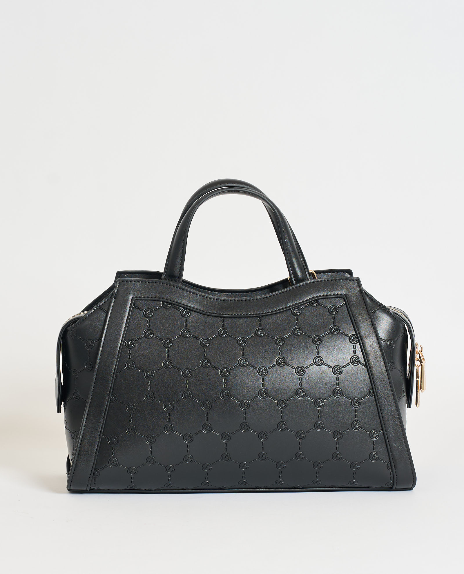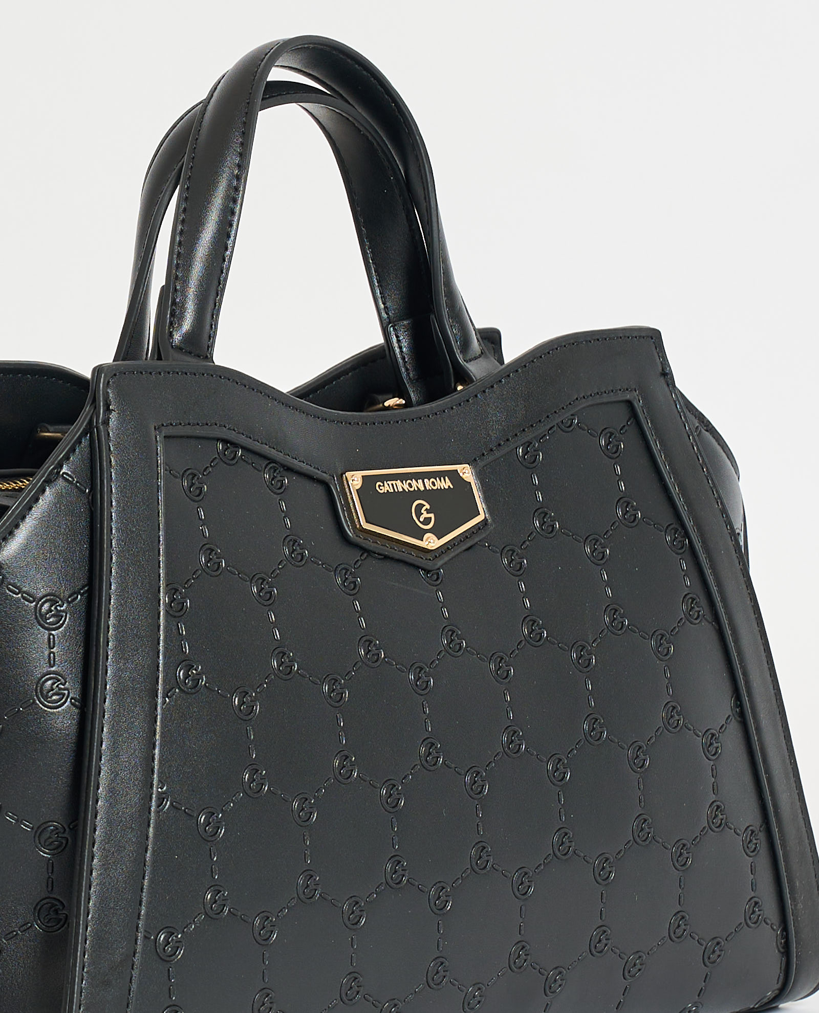 Women's handbag by Gattinoni made of eco-leather with trapezoid shape. Double fixed handle, all-over logo pattern, main zip opening, logo tag.