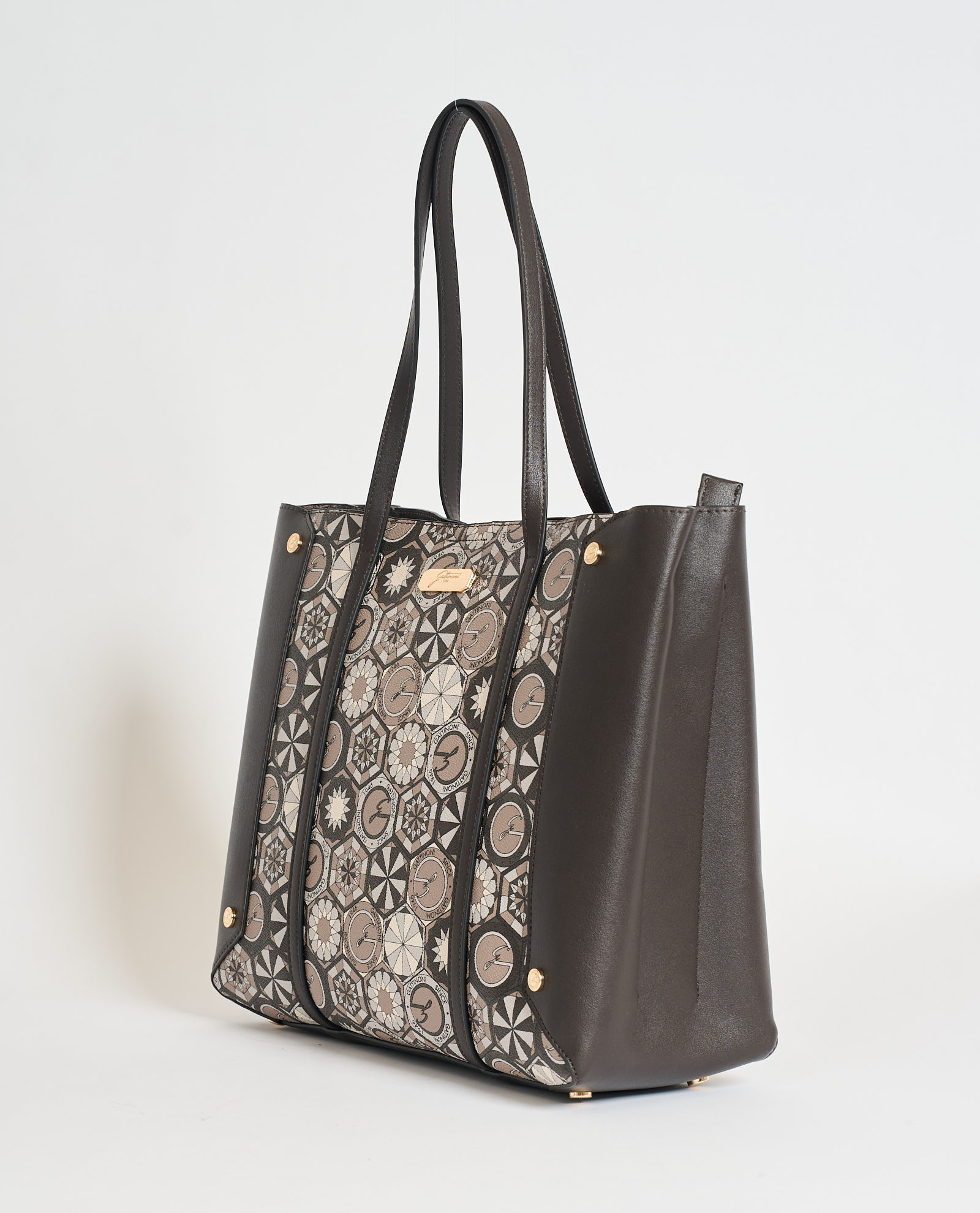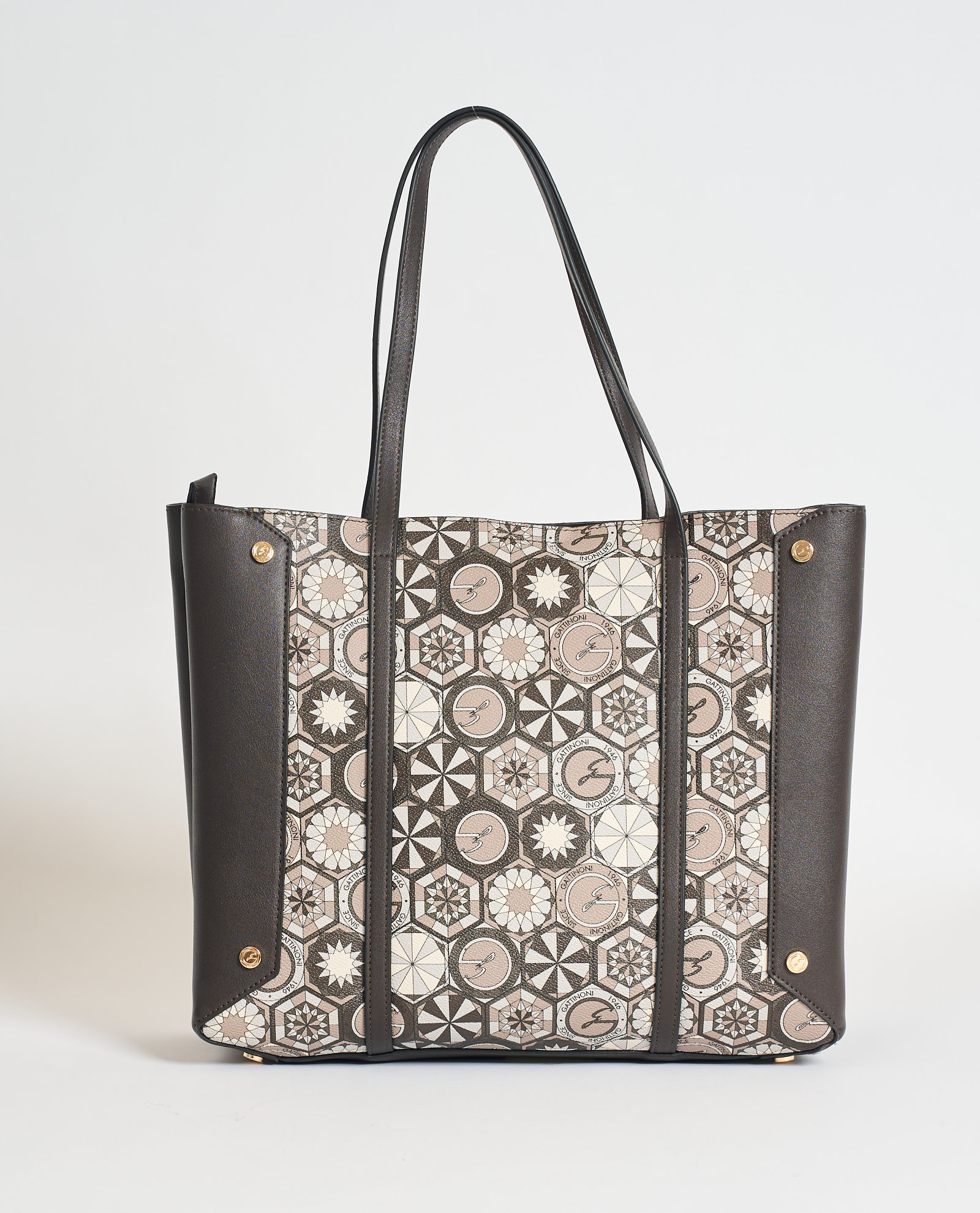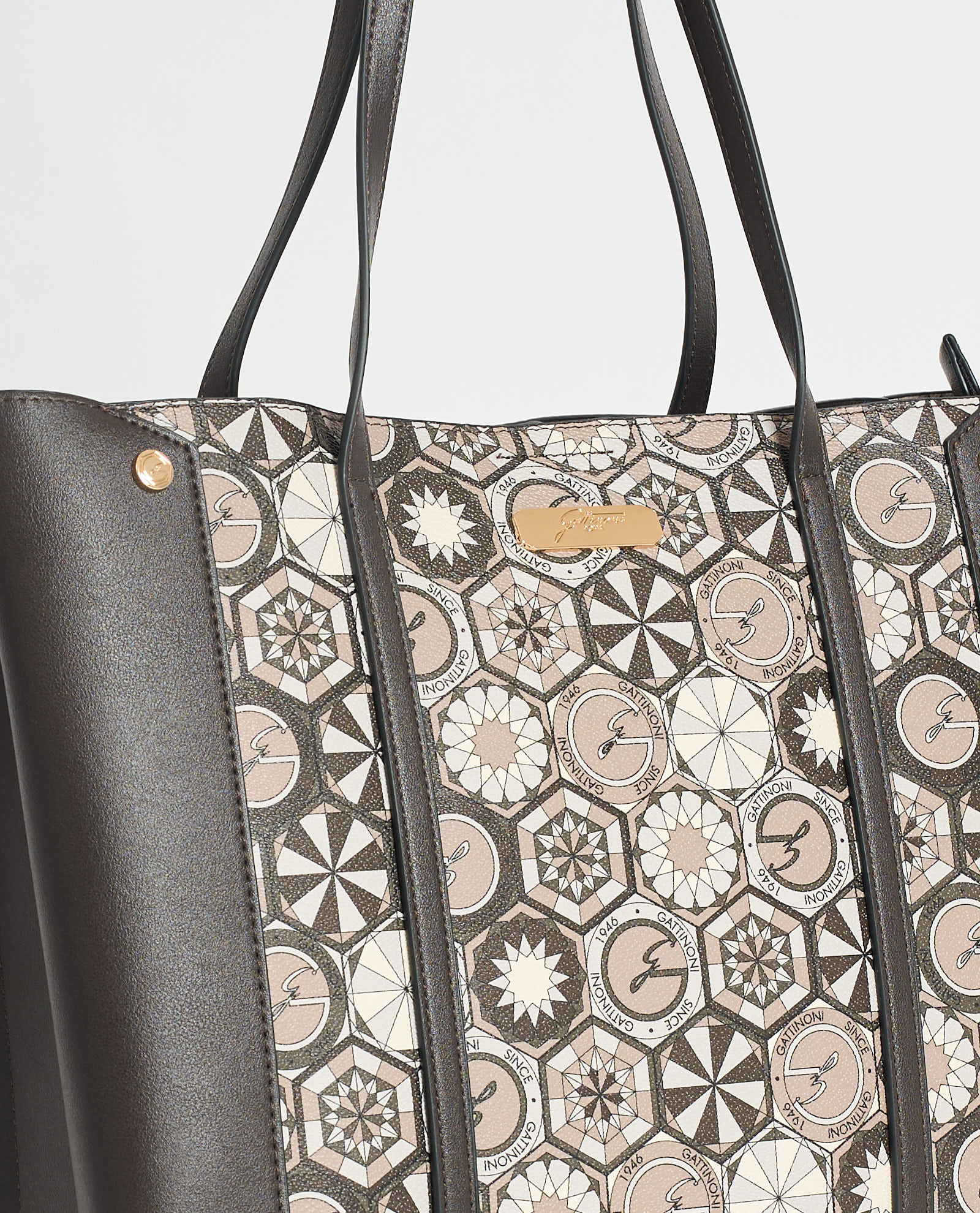 Large women's shopper bag by Gattinoni made of eco-leather. Contrasting band with iconic Teodosia pattern, double non-removable handle. Zip closure and logo tag. Measurements: 36x31x13cm