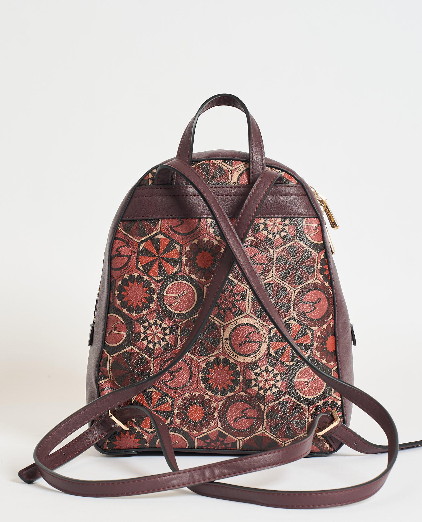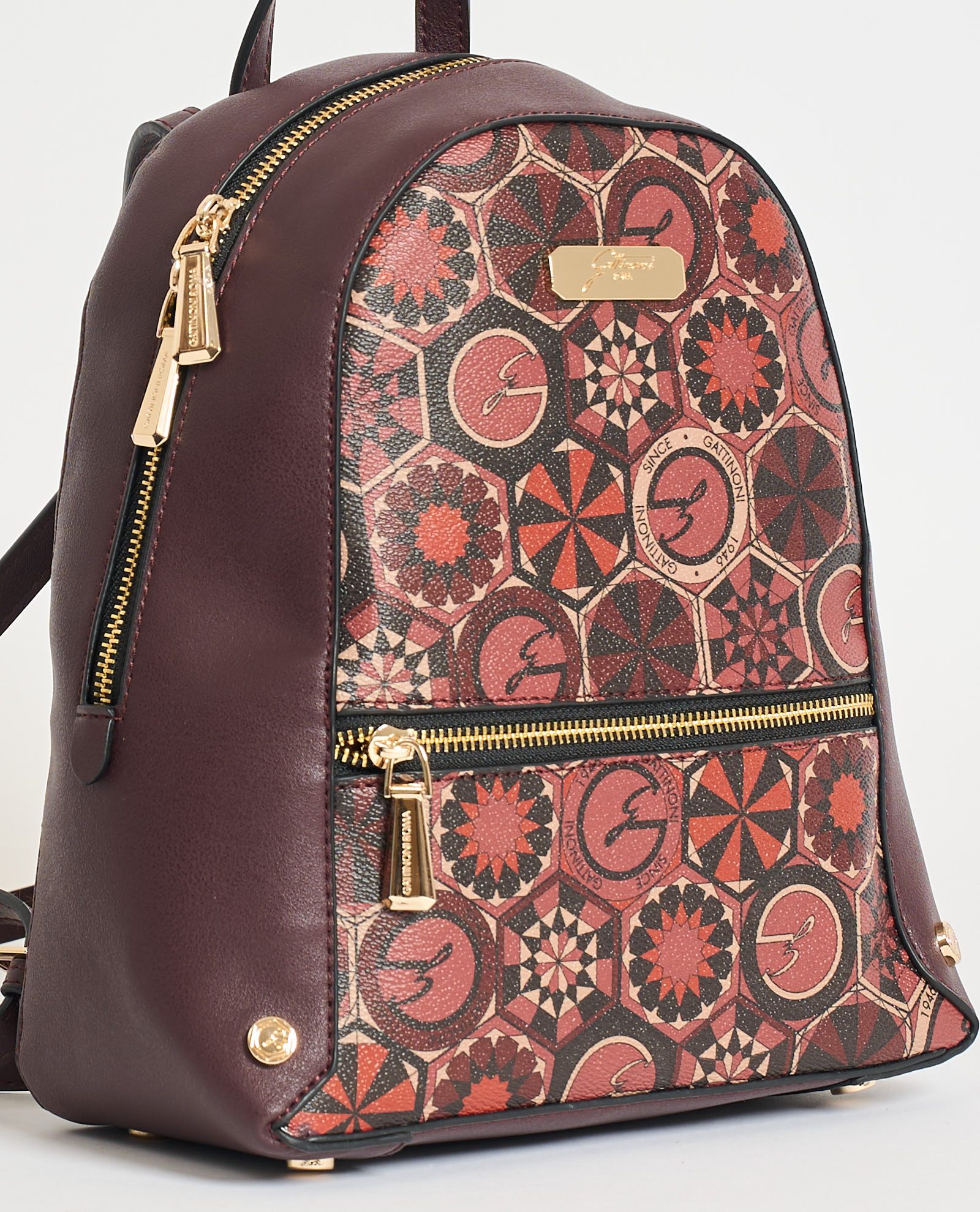 Women's backpack by Gattinoni made of eco-leather with iconic Teodosia print. Front pocket and main zip opening, adjustable shoulder straps. Dimensions: 23x11x26cm