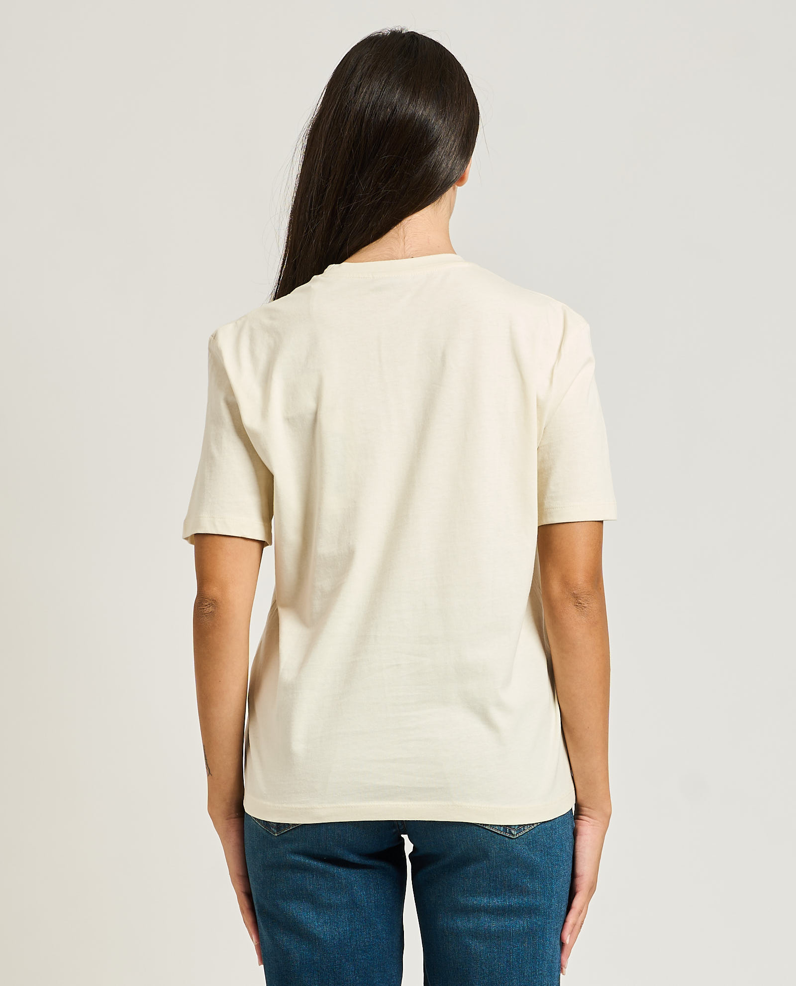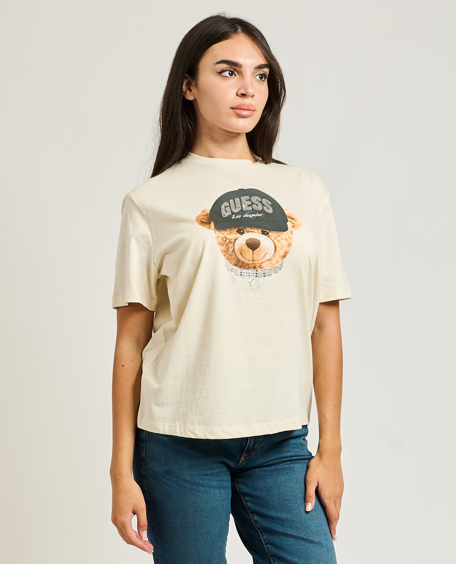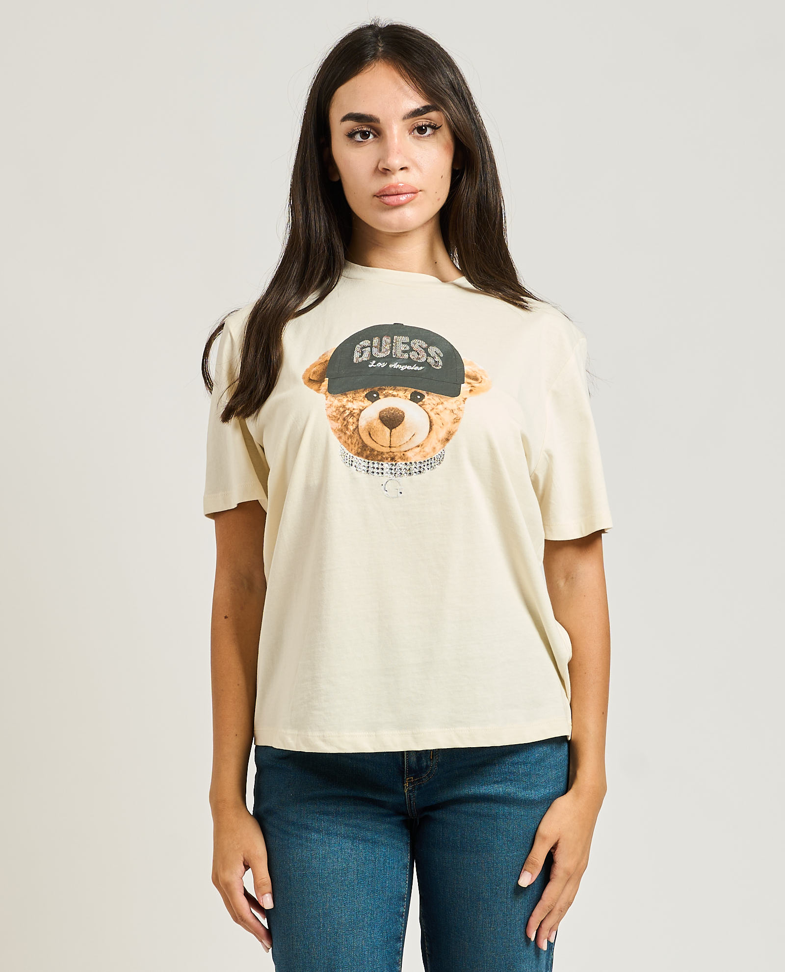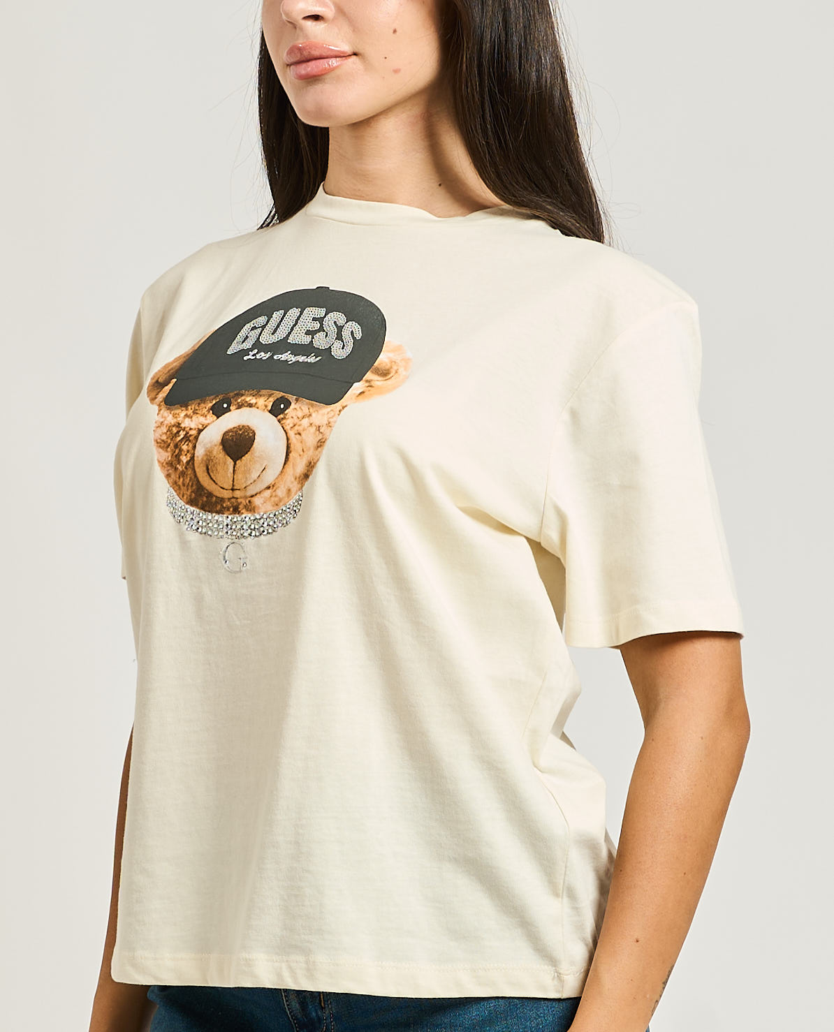 Guess women's cotton T-shirt. Crew neck, short sleeves, bear print on the front. Regular fit. The model is wearing a size S and is 1.65 m tall.