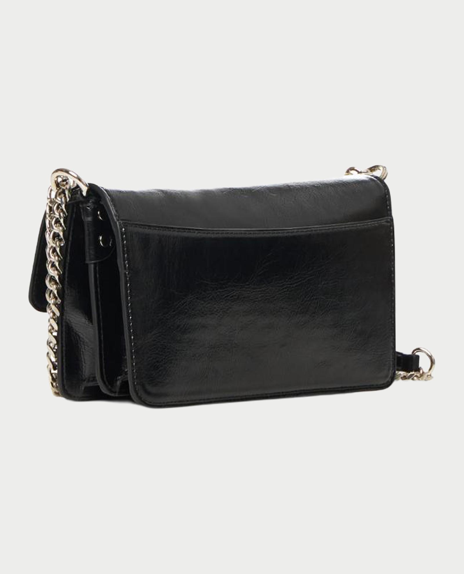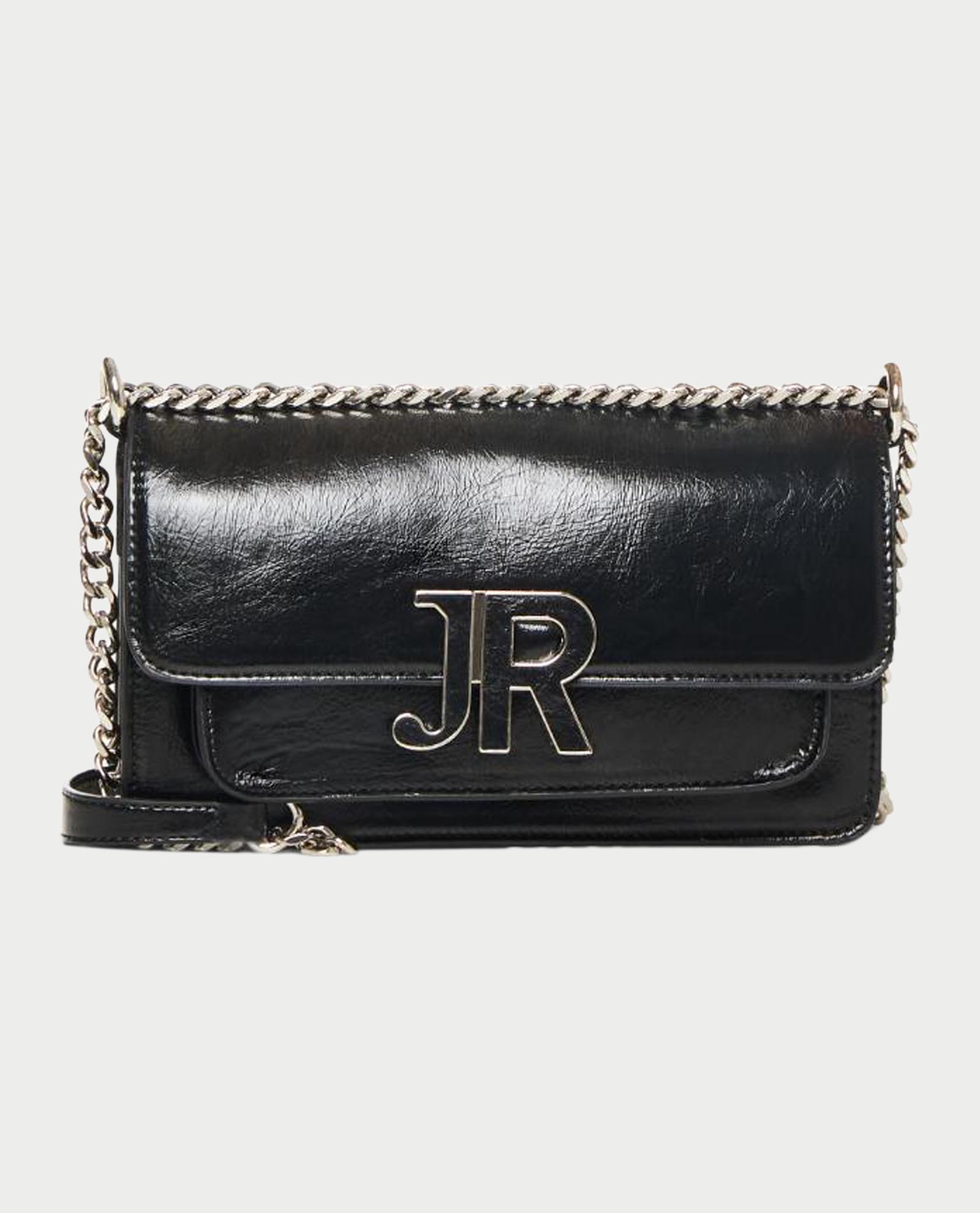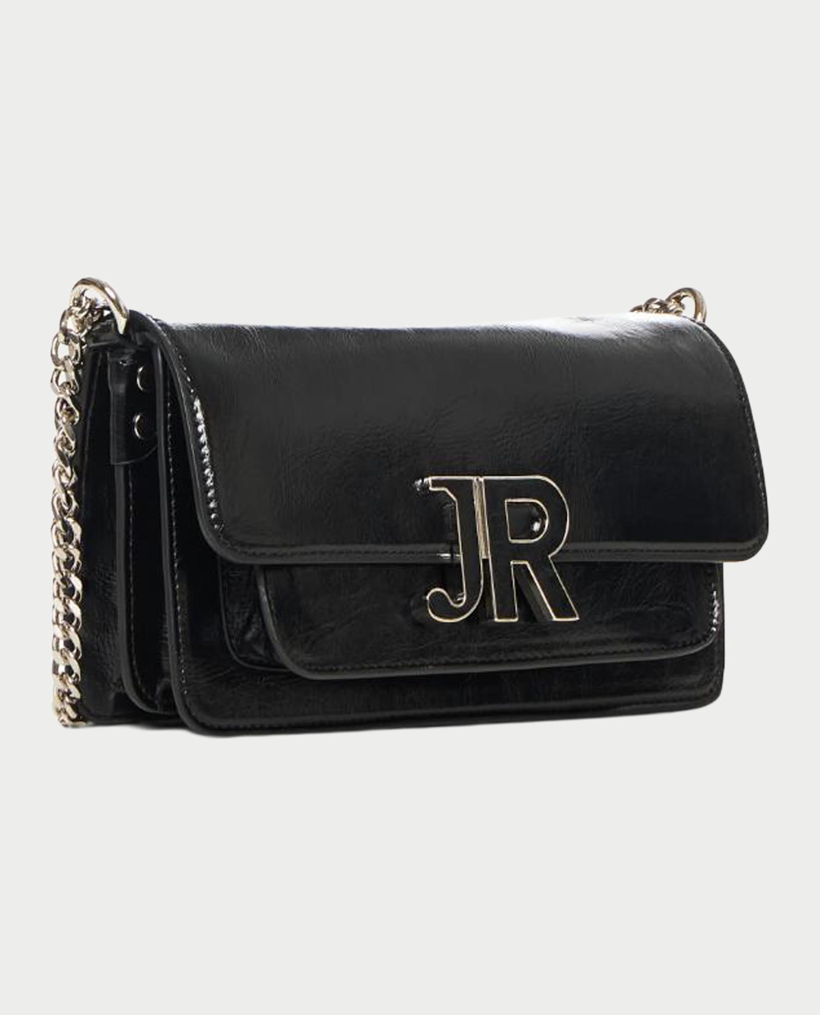John Richmond's medium-sized women's shoulder bag is crafted from glossy faux leather and features a compact design. It features a front flap closure with a magnetic button and a large metal JR logo. Dimensions: 14x26x10cm