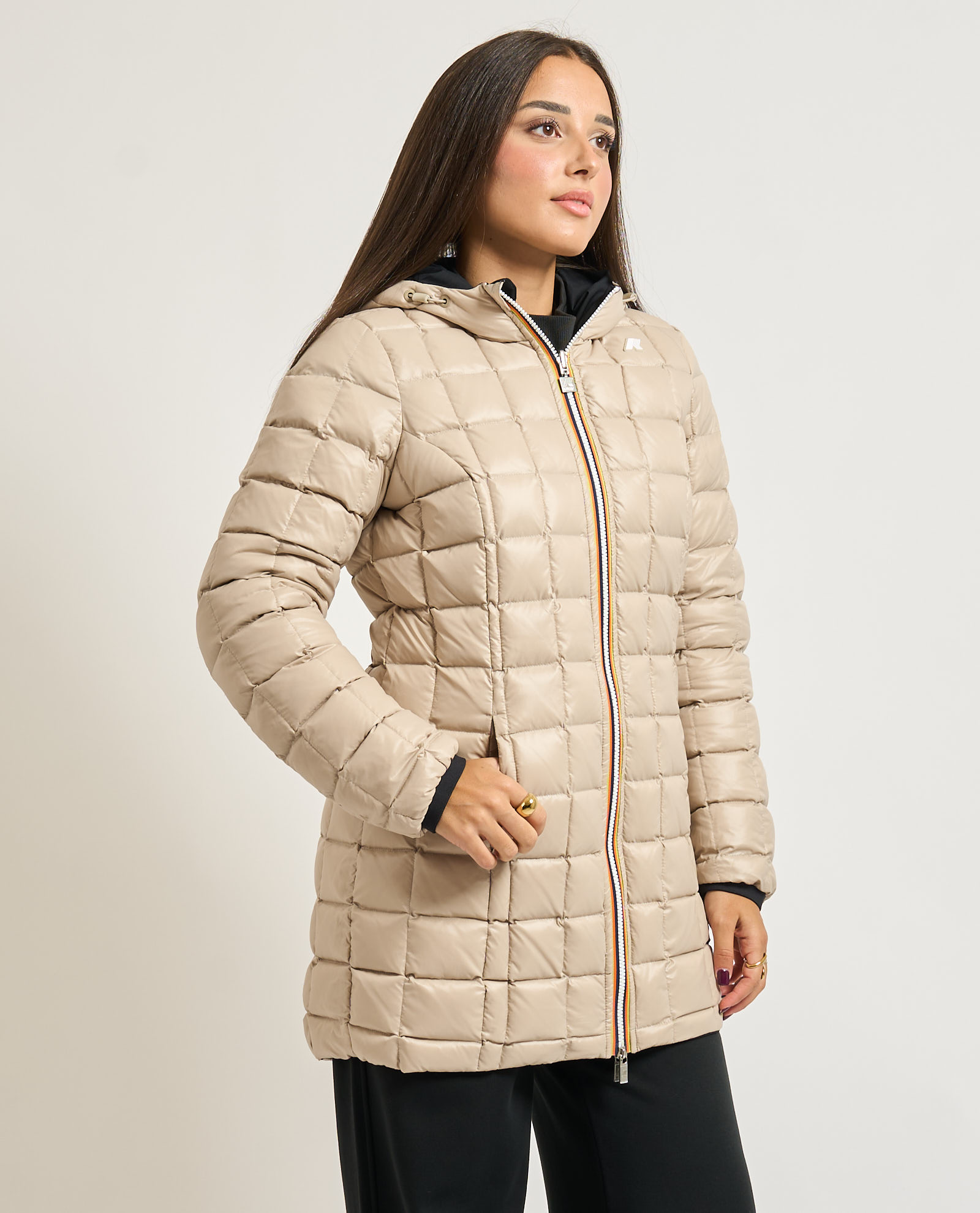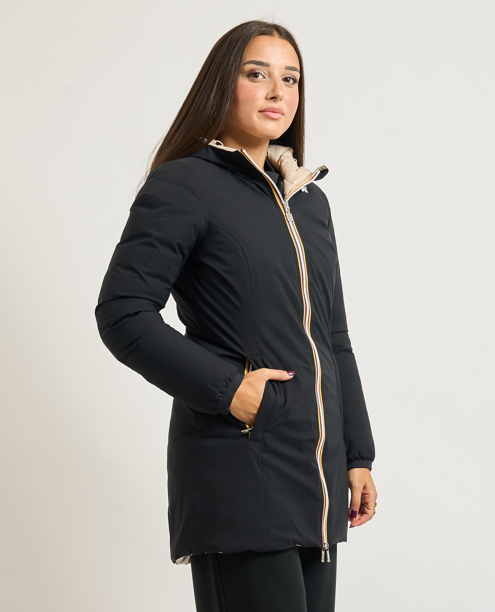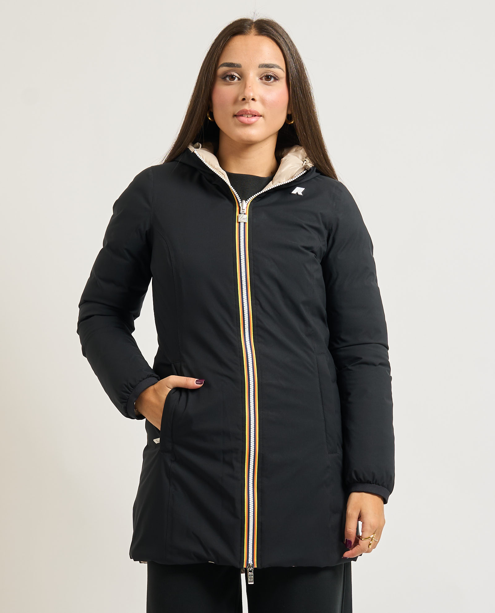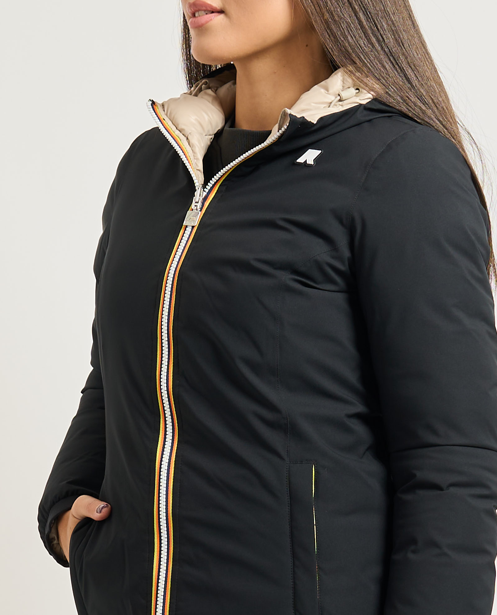 K-Way women's reversible 3/4-length jacket in stretch waterproof, water-repellent, windproof, and breathable fabric. Down padding for high warmth. Hood, full zip closure. Slim fit. The model is wearing a size S and is 1.70 m tall.