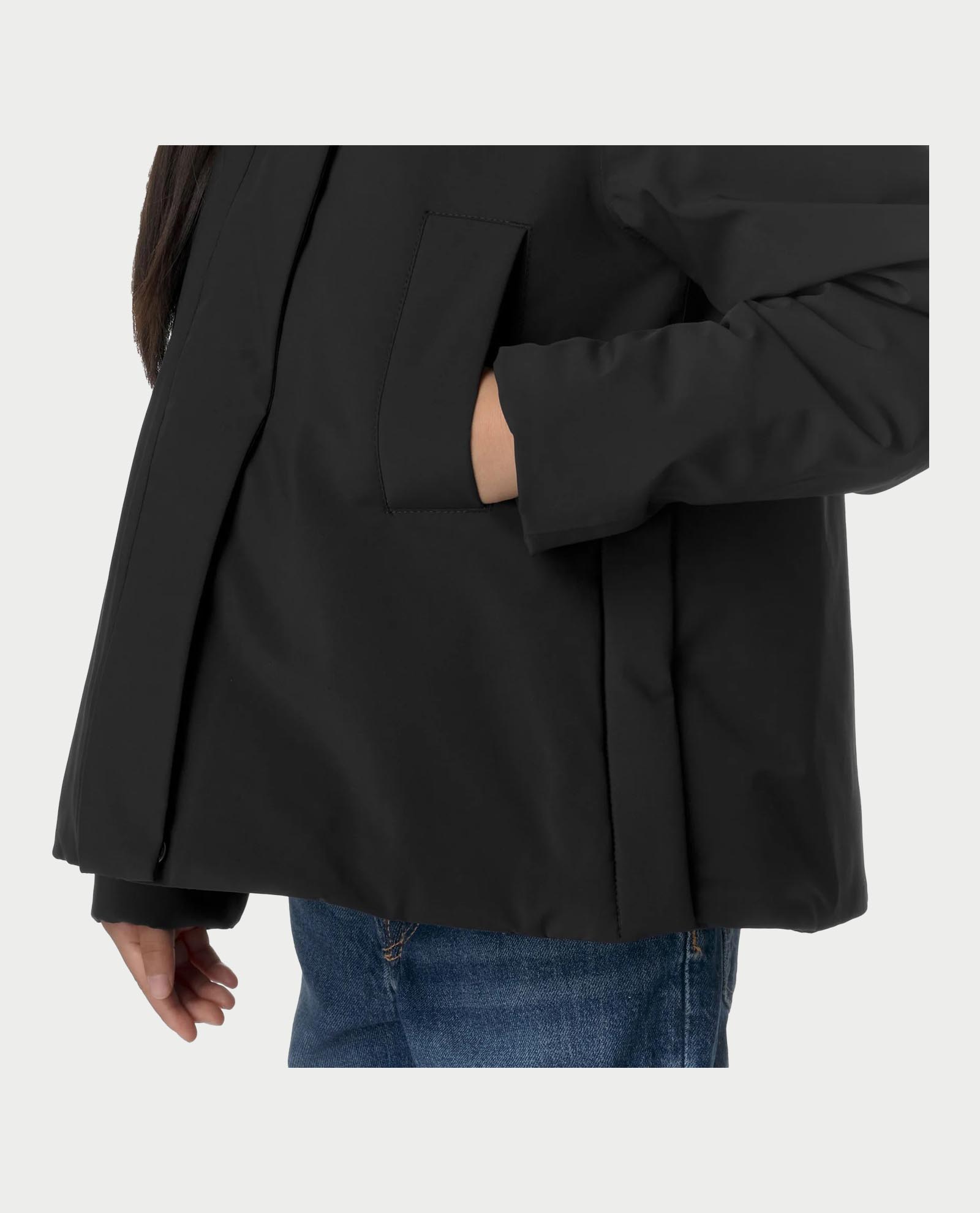 Girls' short jacket Marlette by K-way in waterproof and windproof fabric. Medium warmth level. High collar, fullzip closure with covering flap. White silicone logo. Regular fit.