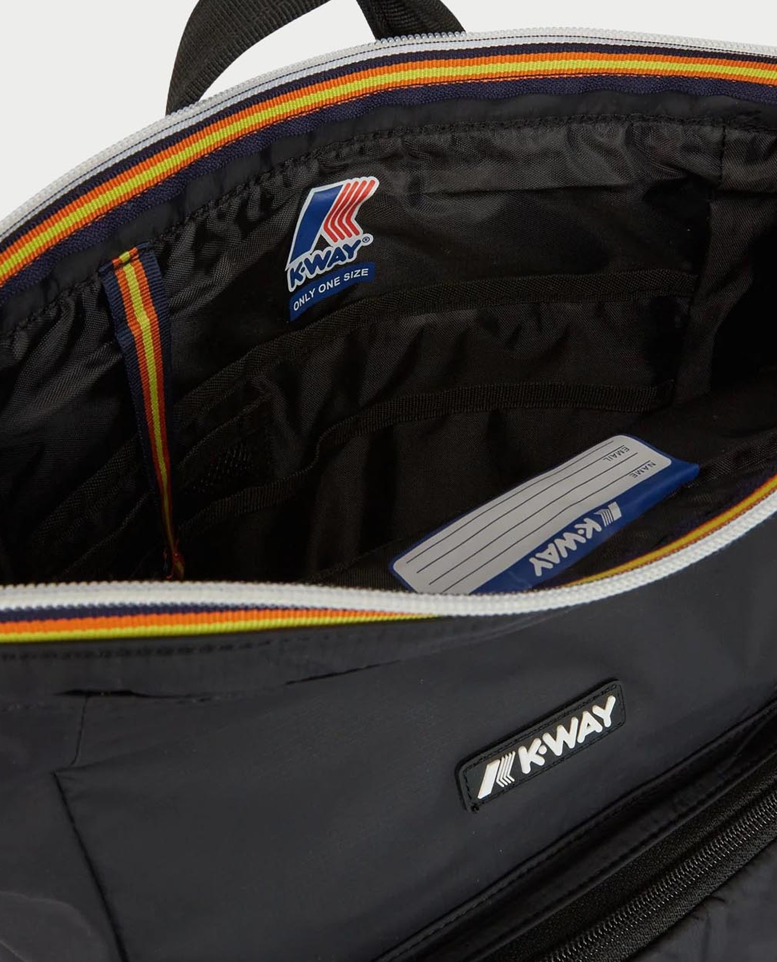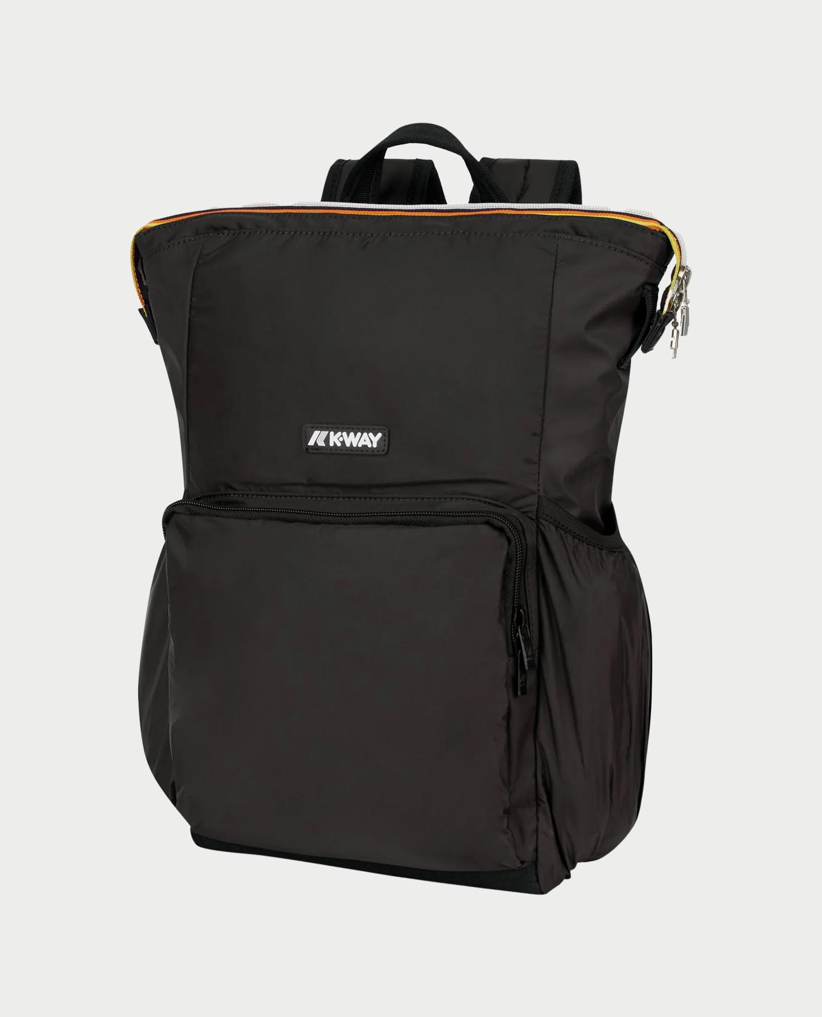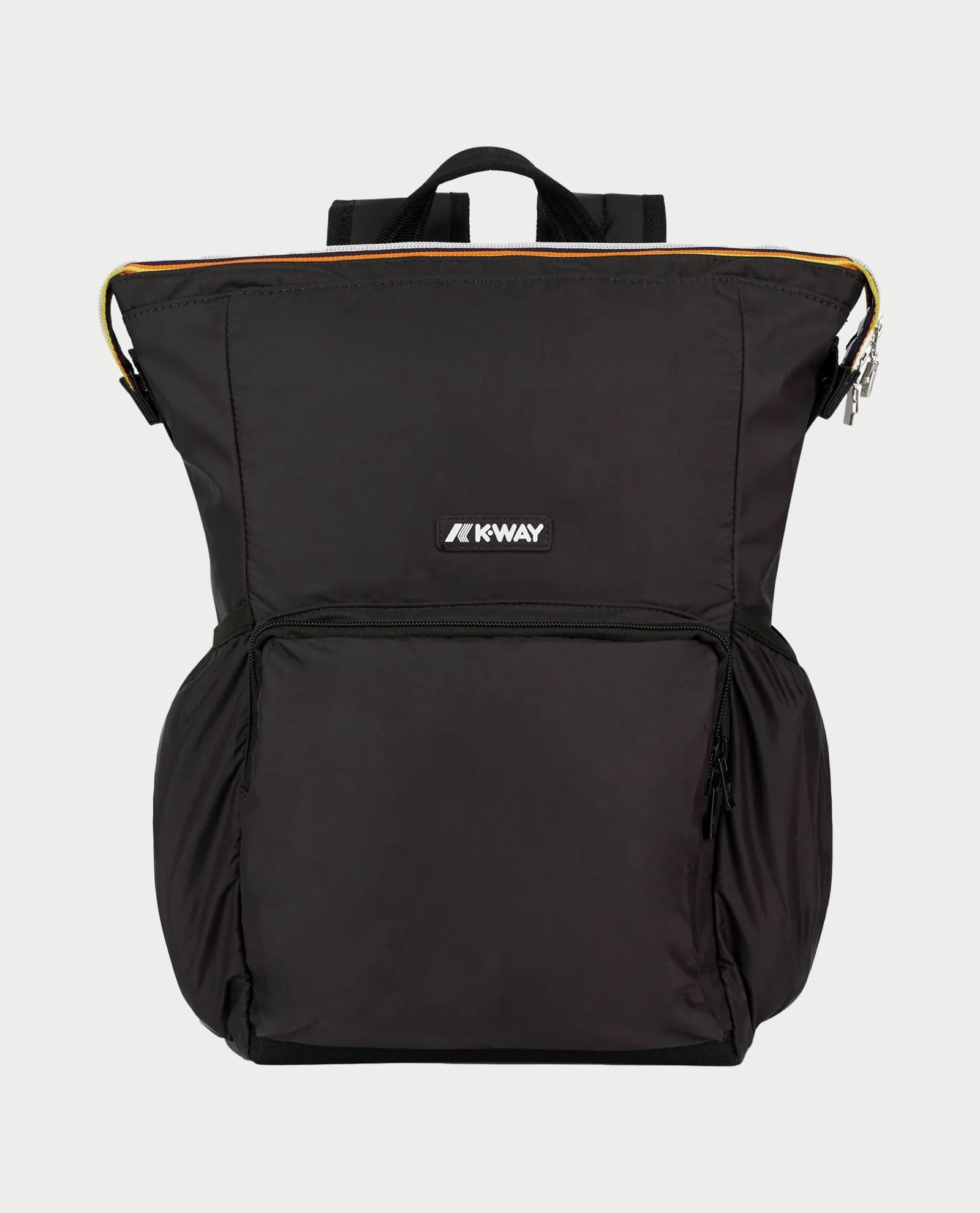 Unisex K-Way backpack in waterproof, water-repellent, and windproof ripstop fabric. Smart pockets and adjustable shoulder straps. 2mm webbing handle, padded back. Front pocket and main zip opening. Multifunctional internal compartments. White silicone logo. Dimensions: 36x23x11cm