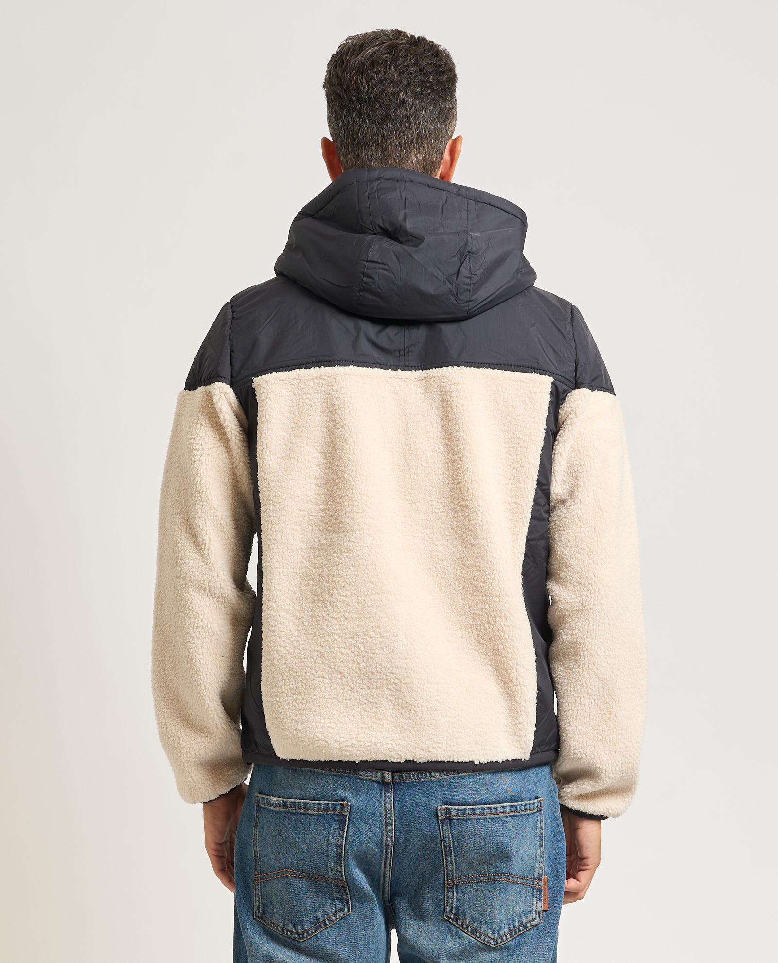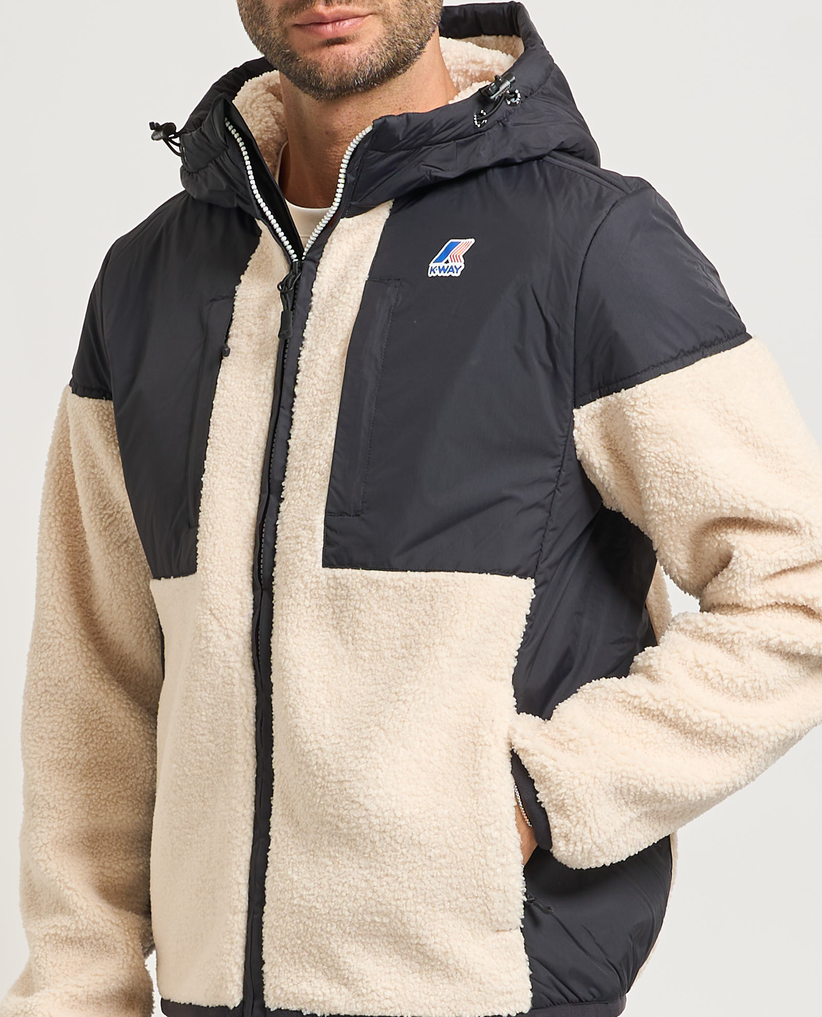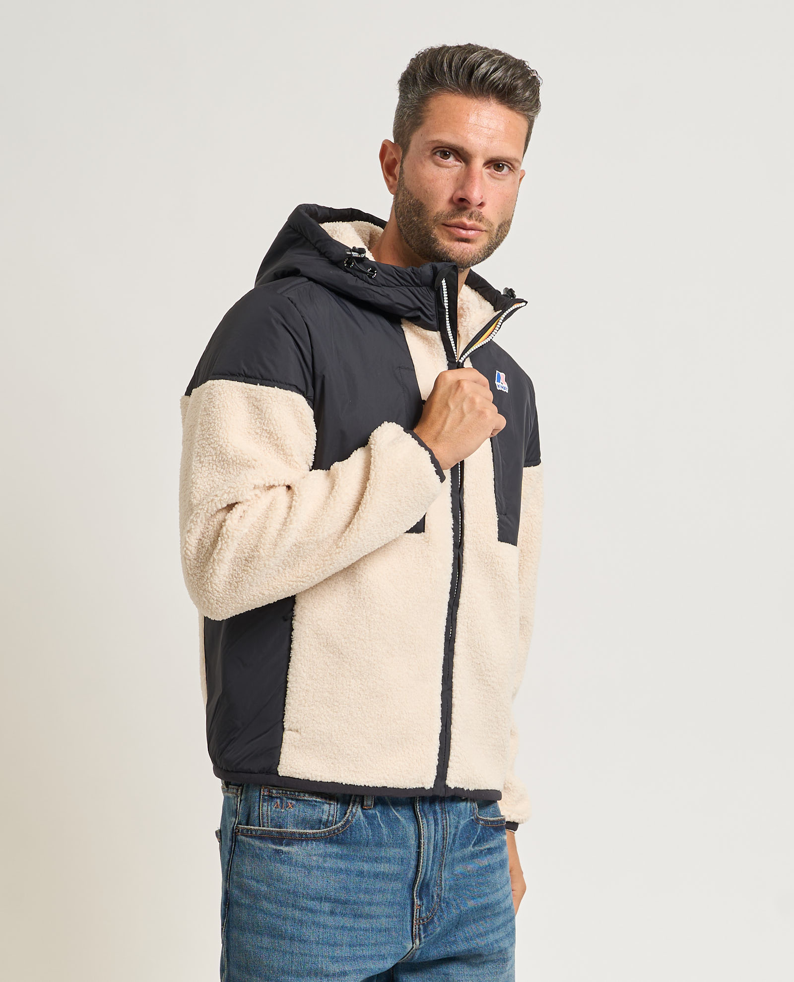 Unisex sweatshirt Samson by K-way in sherpa effect fabric and waterproof, water-repellent, windproof, breathable ripstop nylon inserts. Medium warmth level. Adjustable hood with drawstring, fullzip closure and pockets. Regular fit.