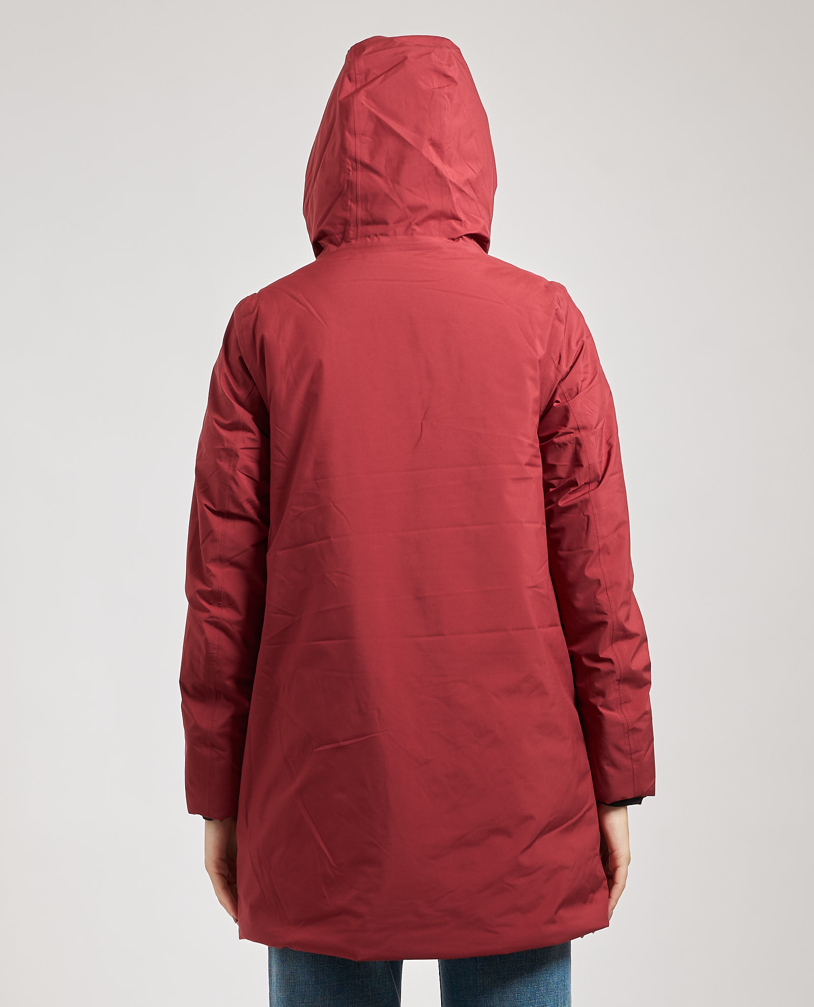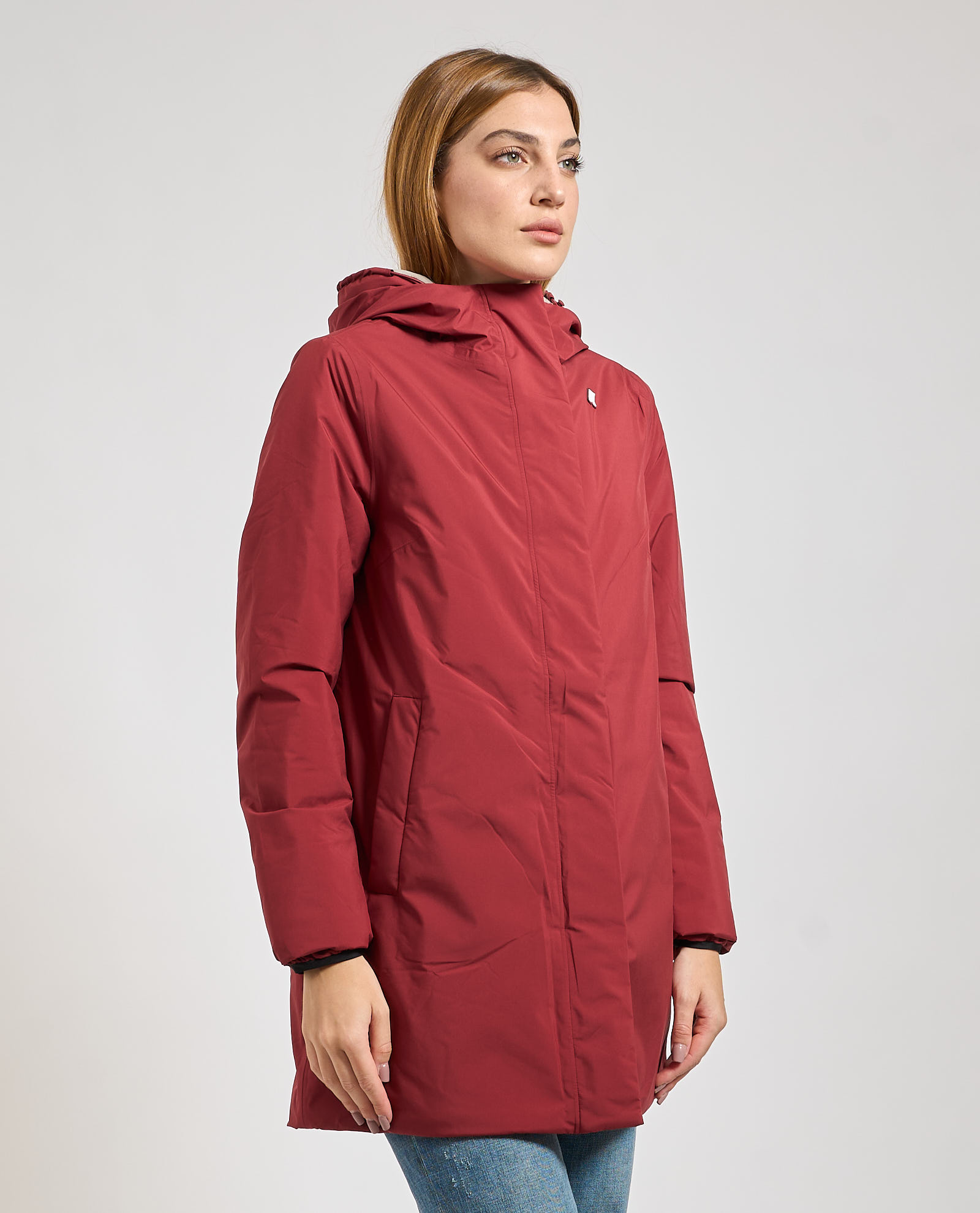 K-way Sophie women's medium length jacket made of waterproof and windproof fabric. Medium thermal level. Non-removable hood, zip closure. Regular fit.