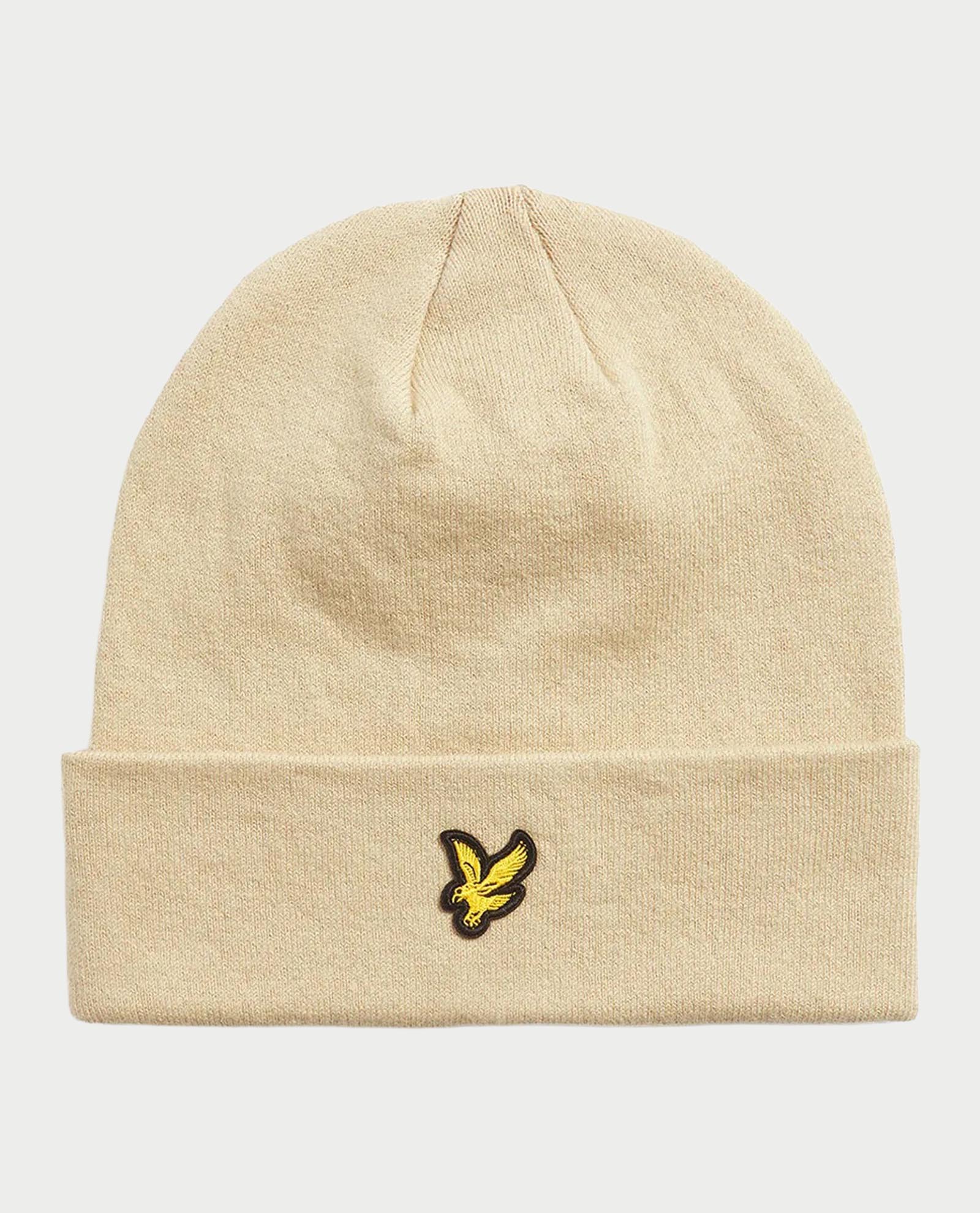 Lyle & Scott merino wool blend beanie with contrasting cuff and logo.