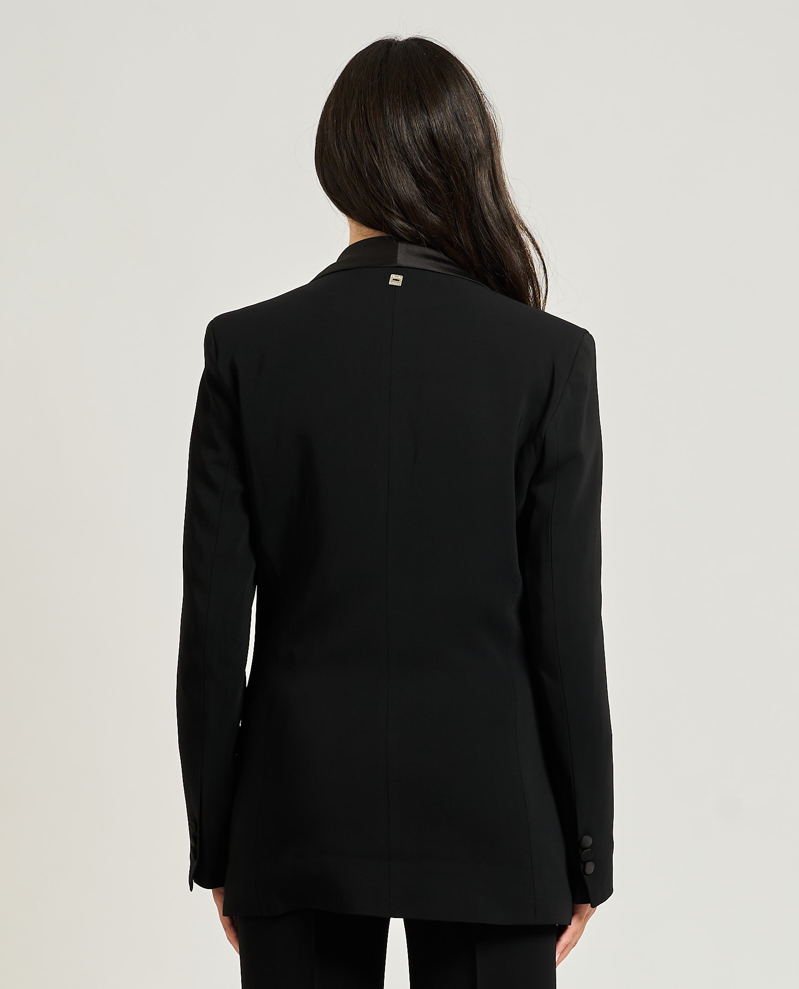 Women's tuxedo blazer by Manila Grace in stretch cotton. Shawl collar in glossy satin, one-button closure, flap pockets, logo charm on back. The model wears size 40IT and is 1.65m tall