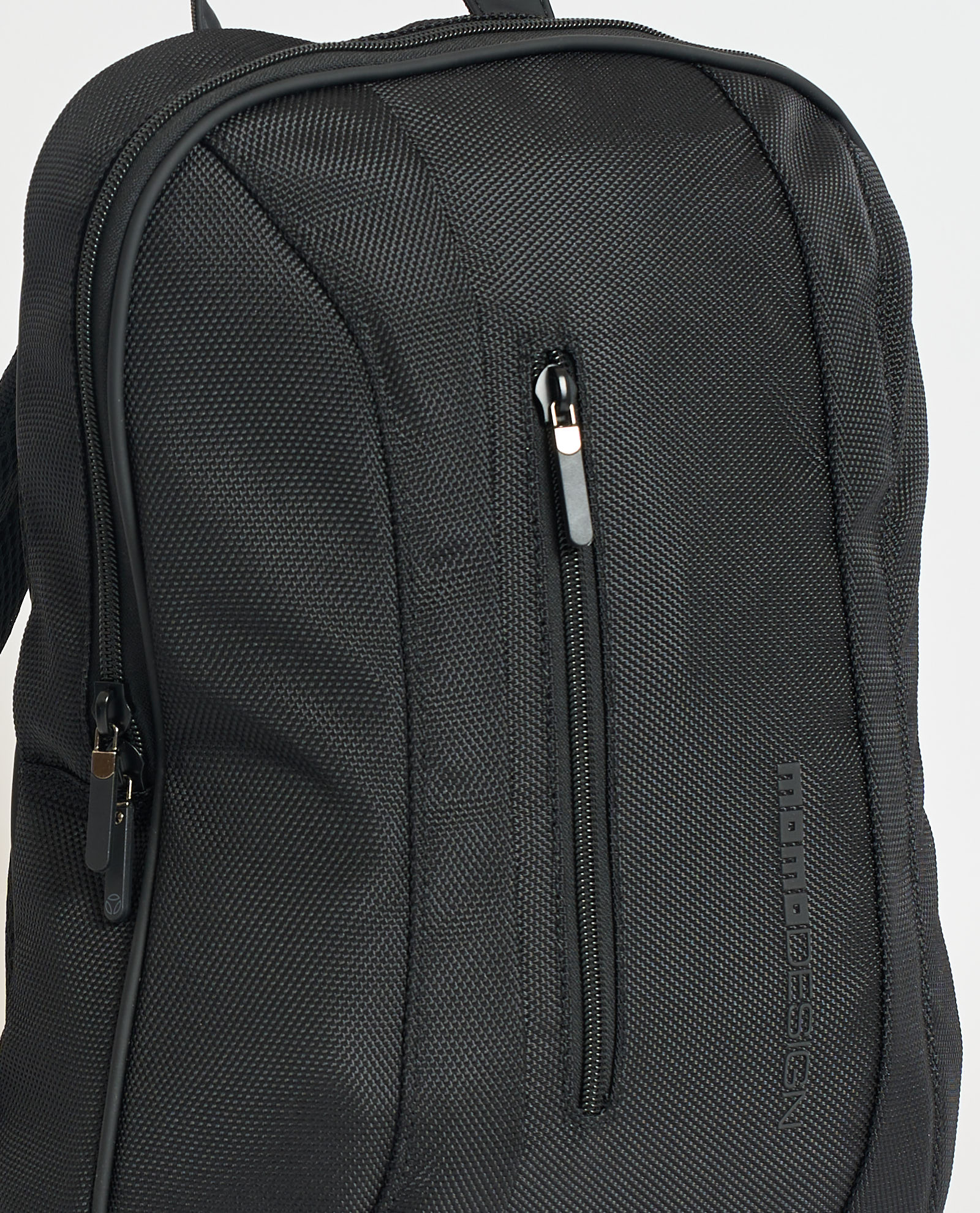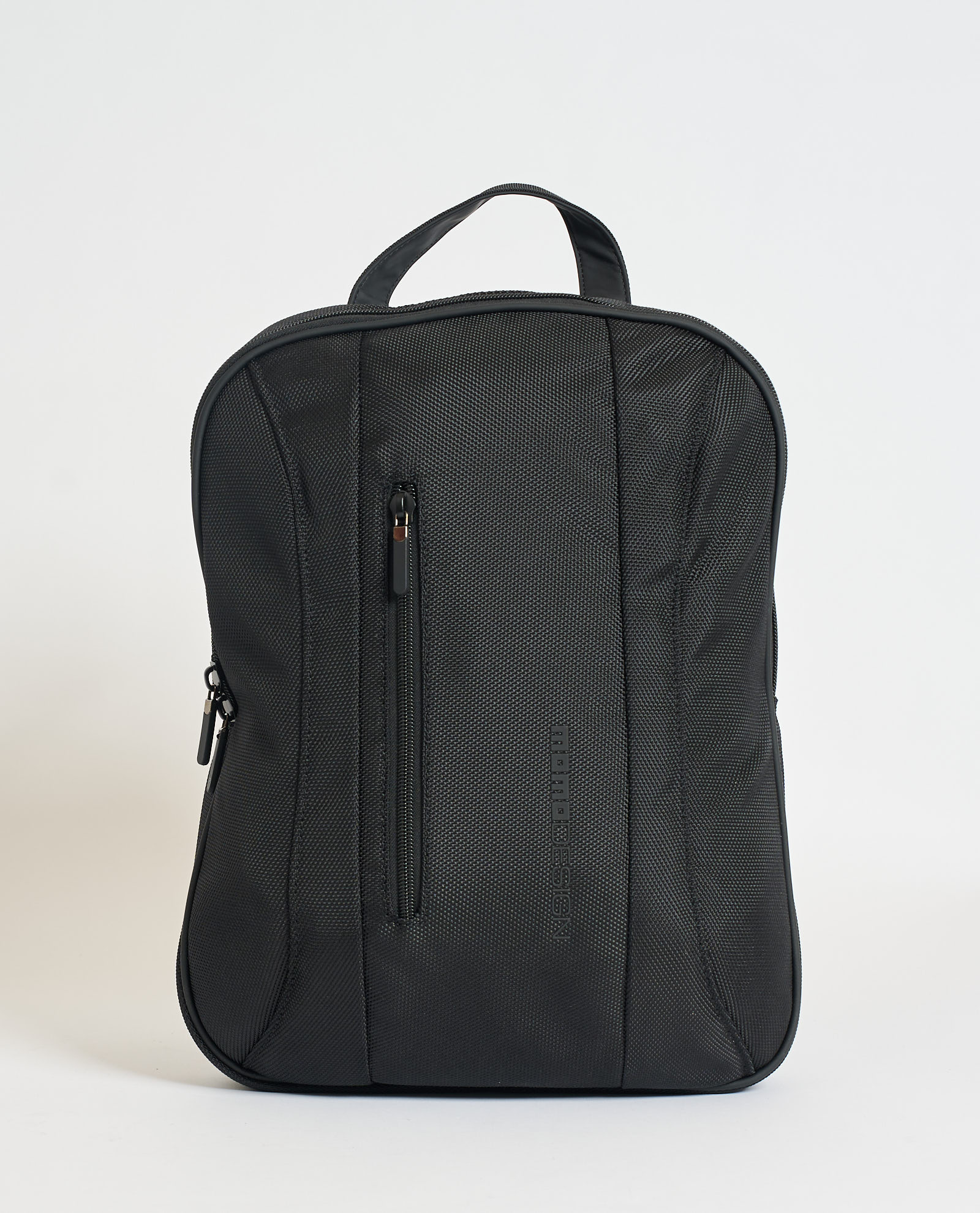 Momodesign backpack model with front zippered pocket and logo. DIMENSIONS 26 L x 39 H x 16 D