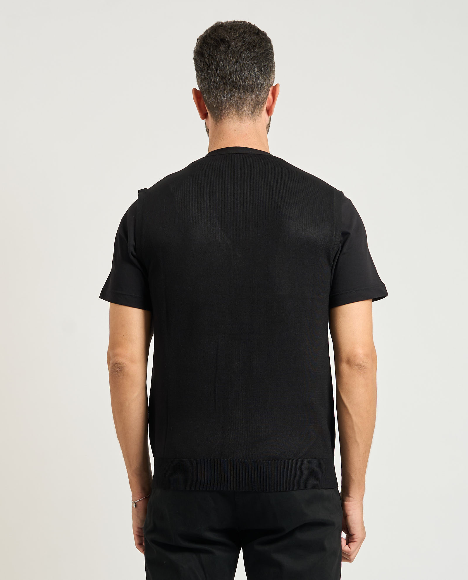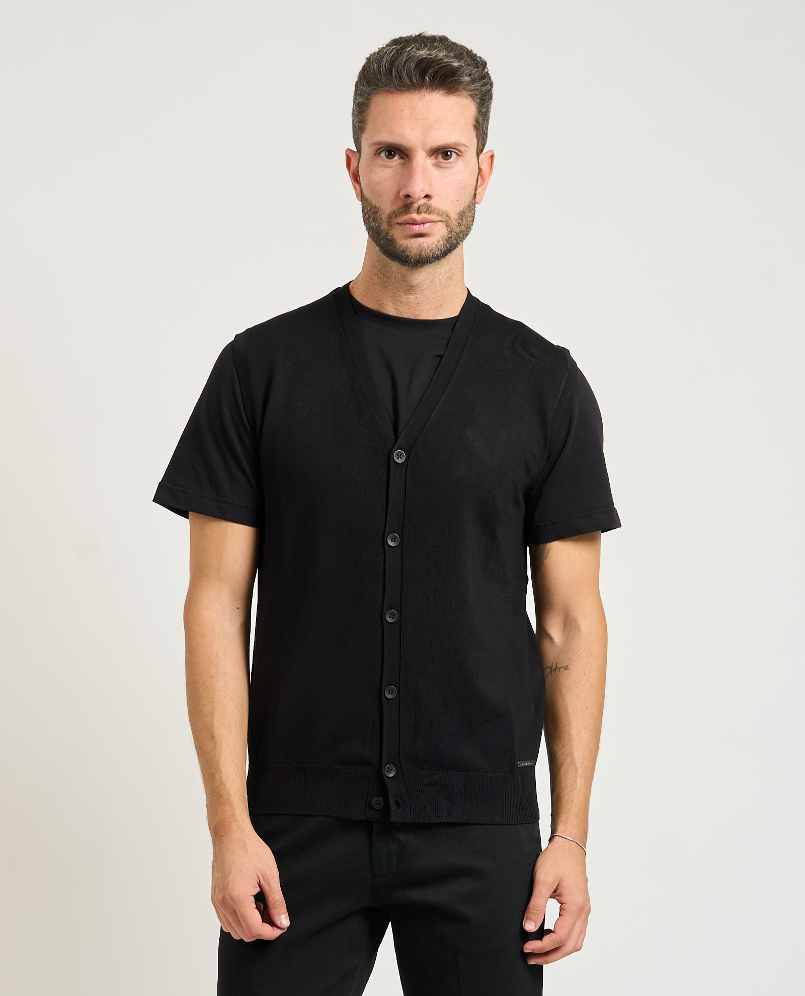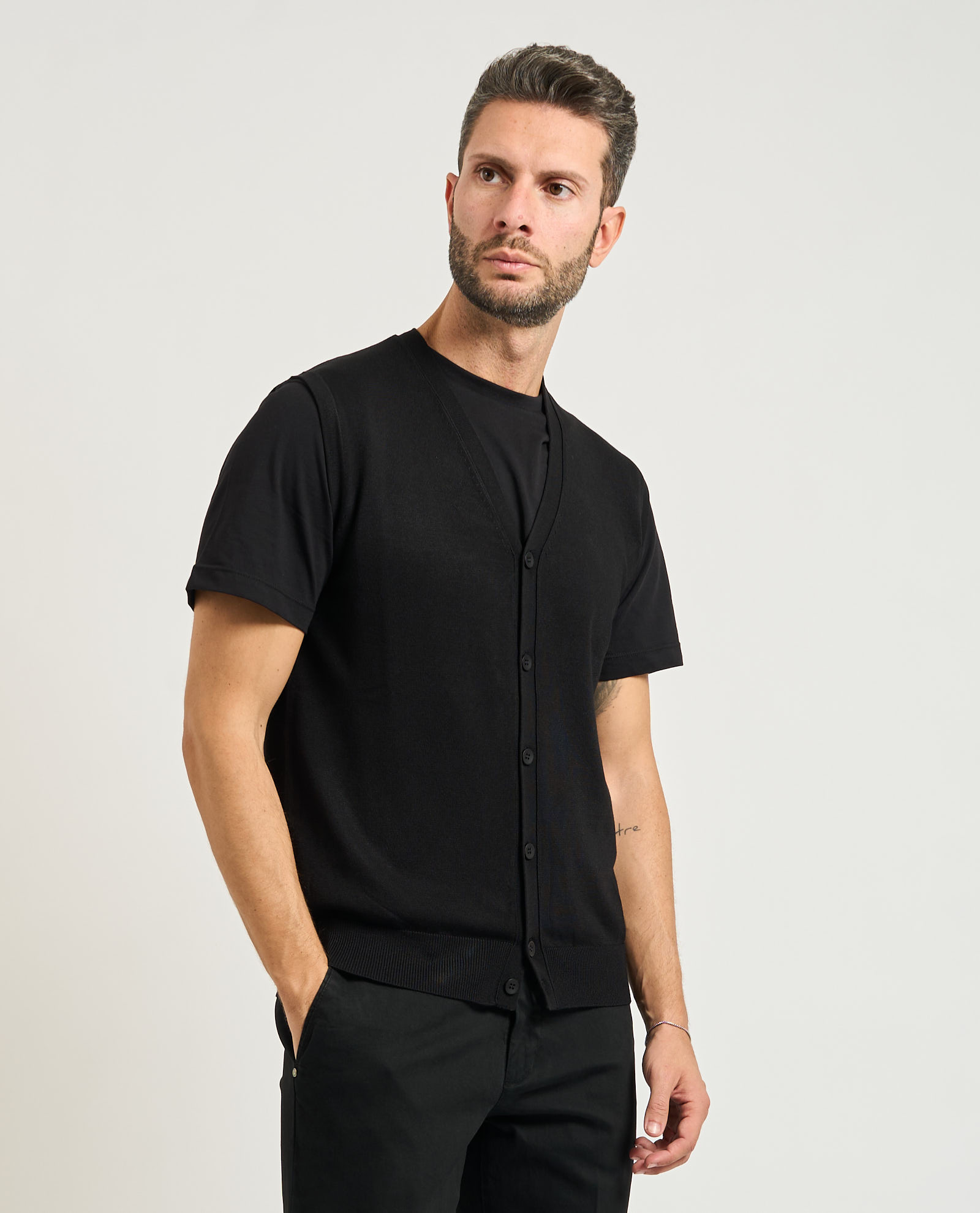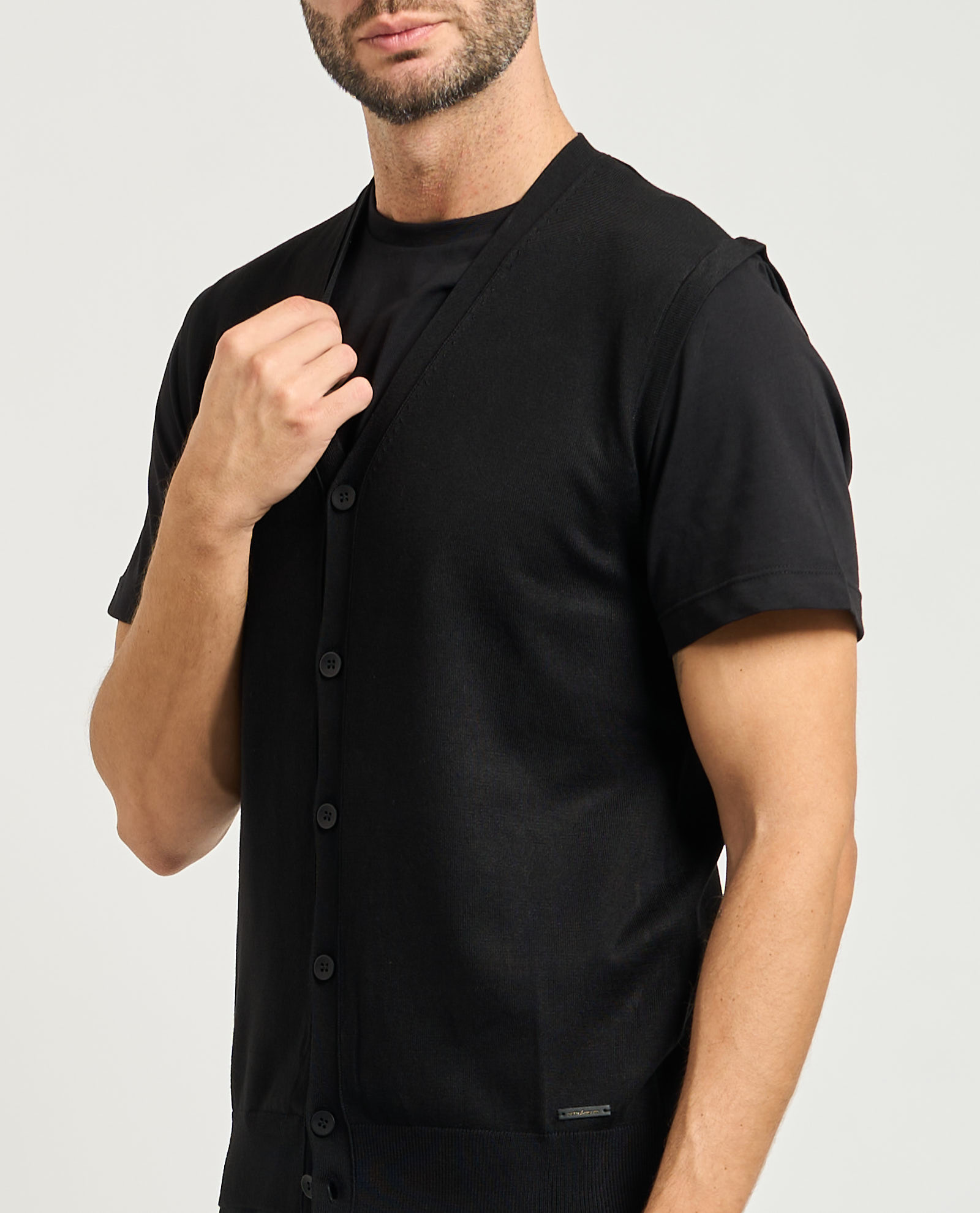Men's vest by Sette/Mezzo in mixed fabric. V-neck, main button closure, ribbing on bottom. Regular fit. Model wears size M and is 1.85m tall