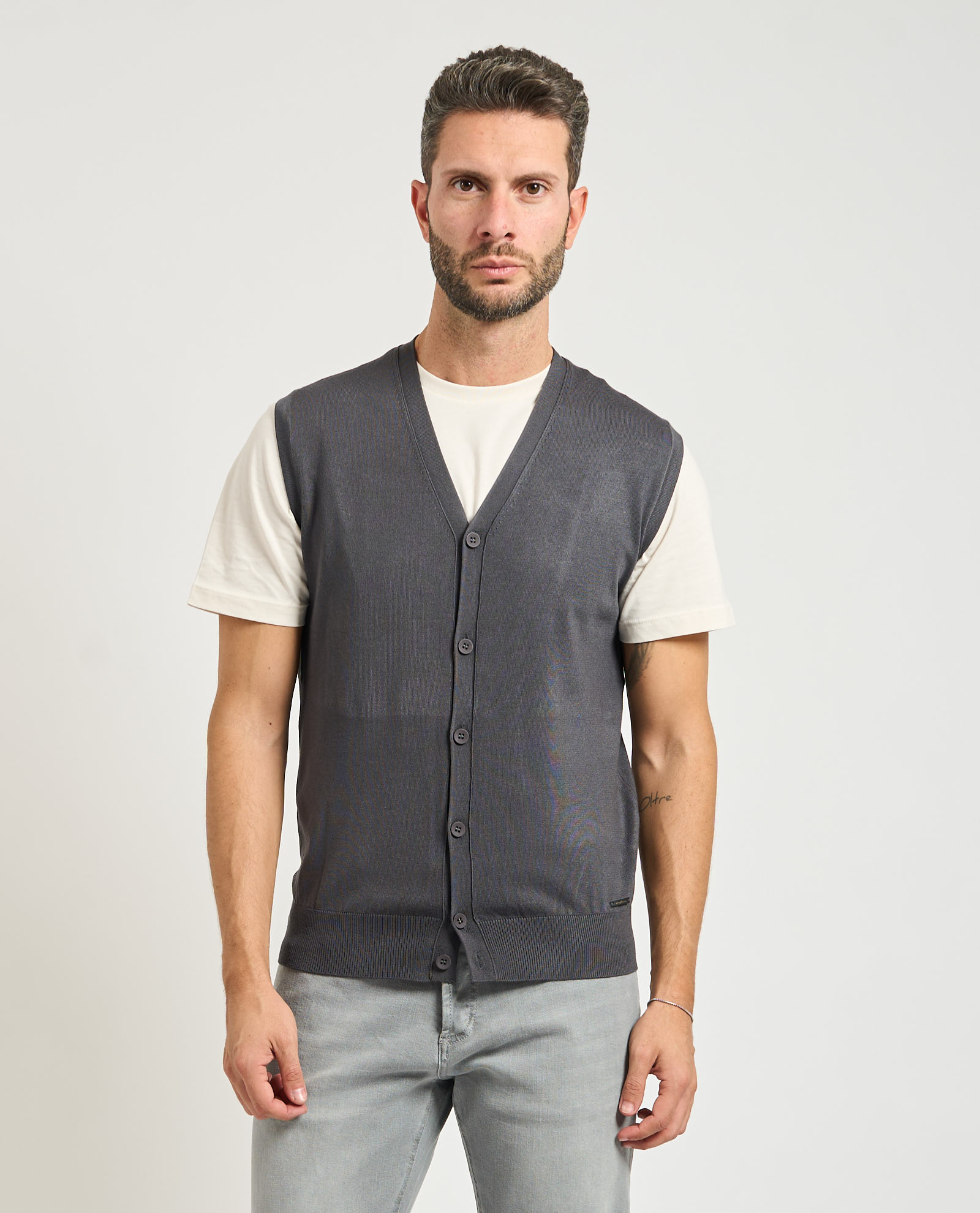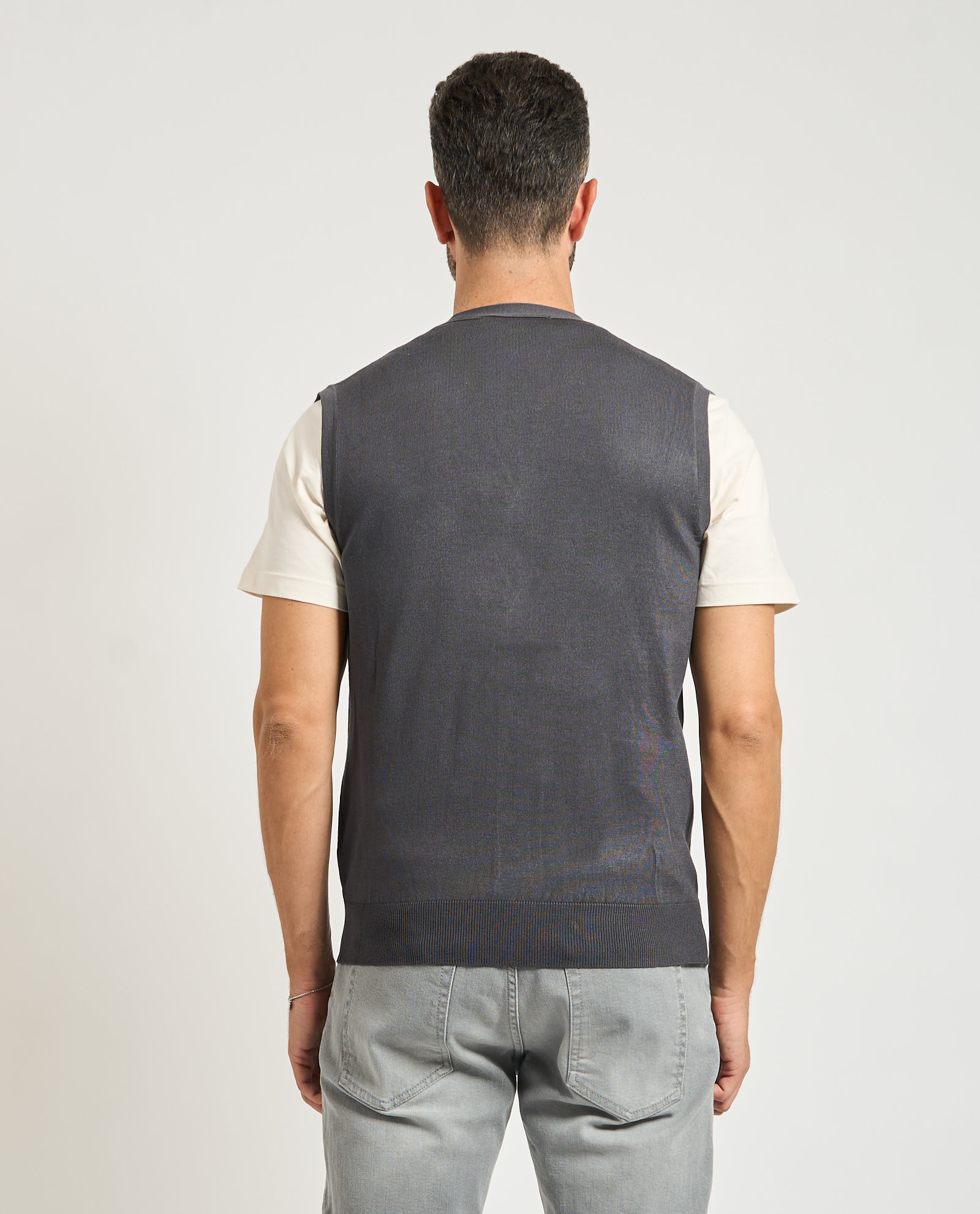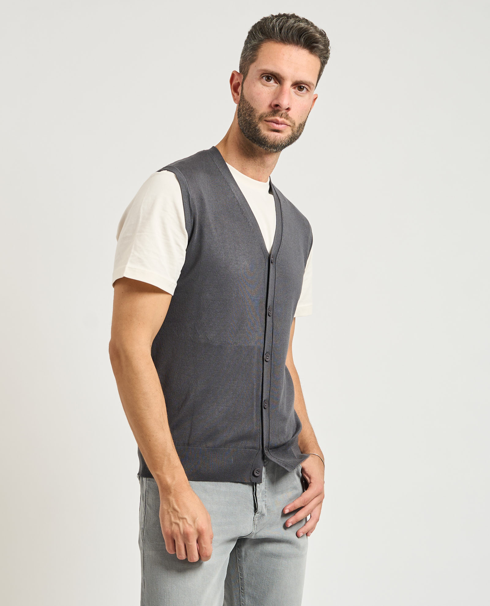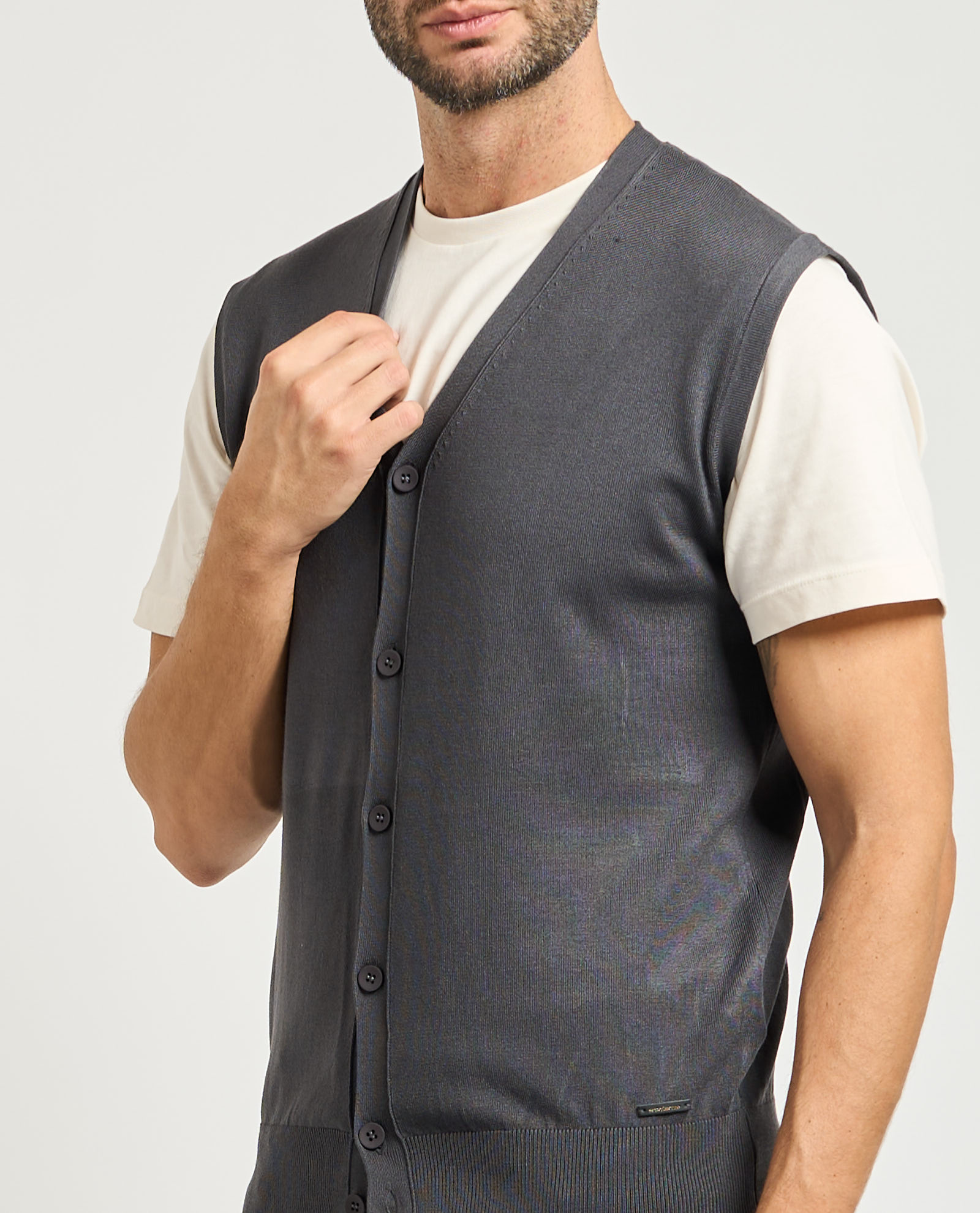 Men's vest by Sette/Mezzo in mixed fabric. V-neck, main button closure, ribbing on bottom. Regular fit. Model wears size M and is 1.85m tall