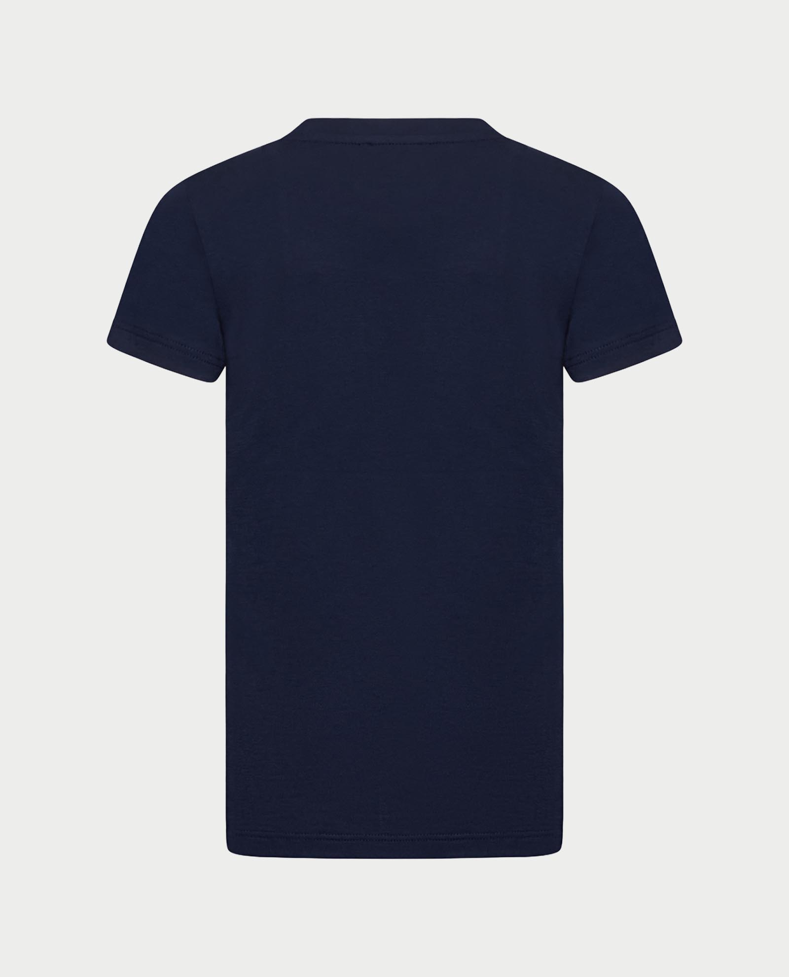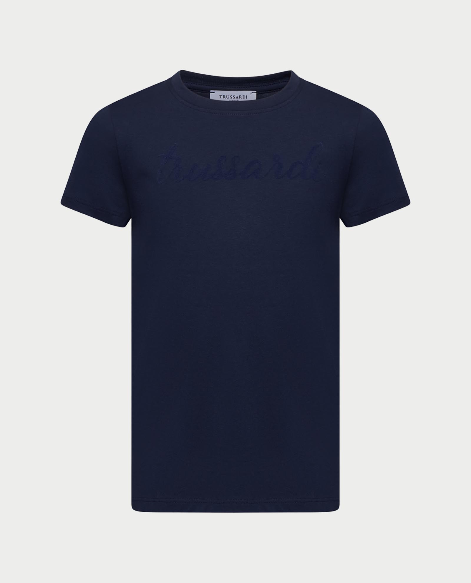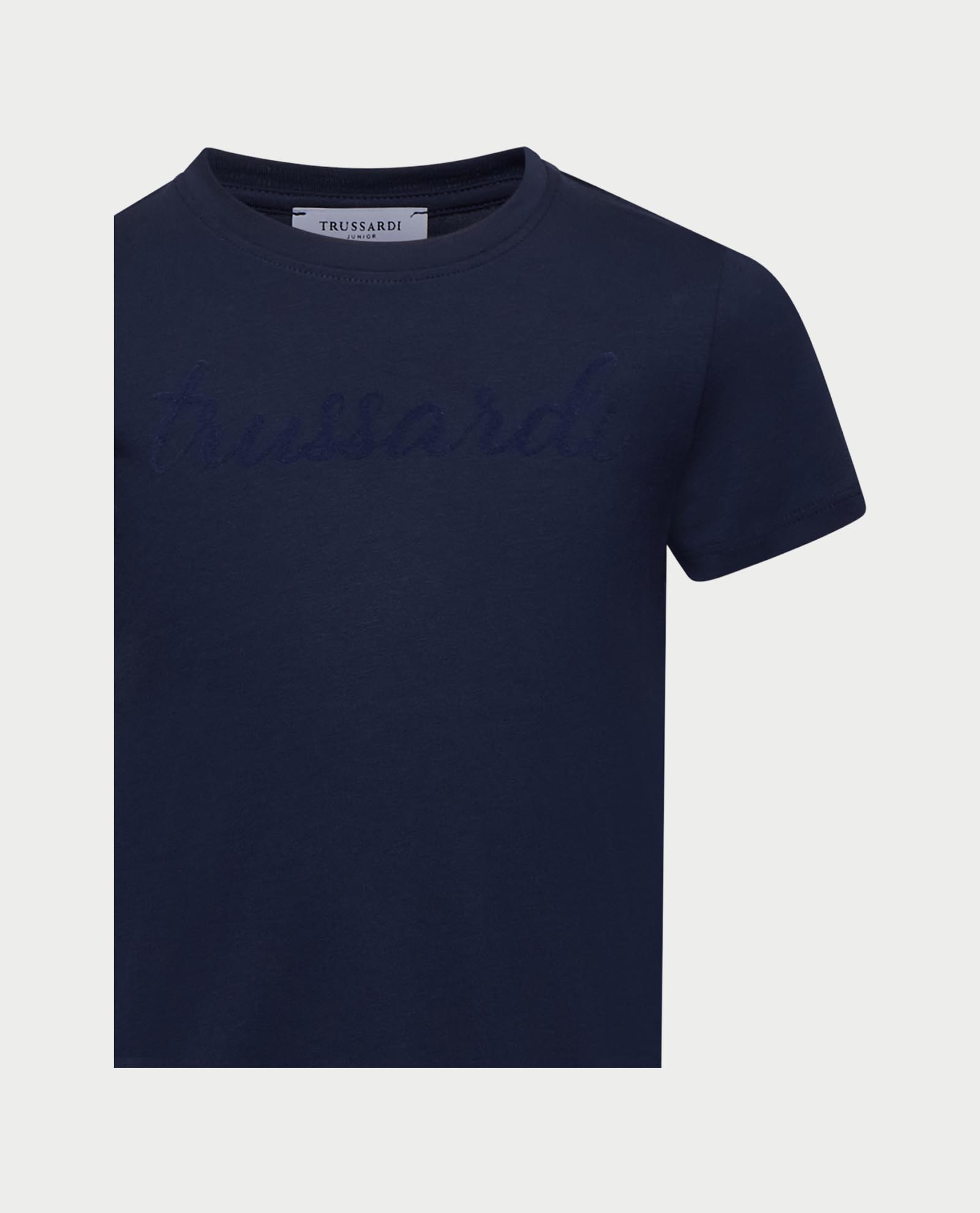 Trussardi boys' cotton t-shirt with short sleeves and ribbed crew neck. It is decorated with velvet logo on the front.