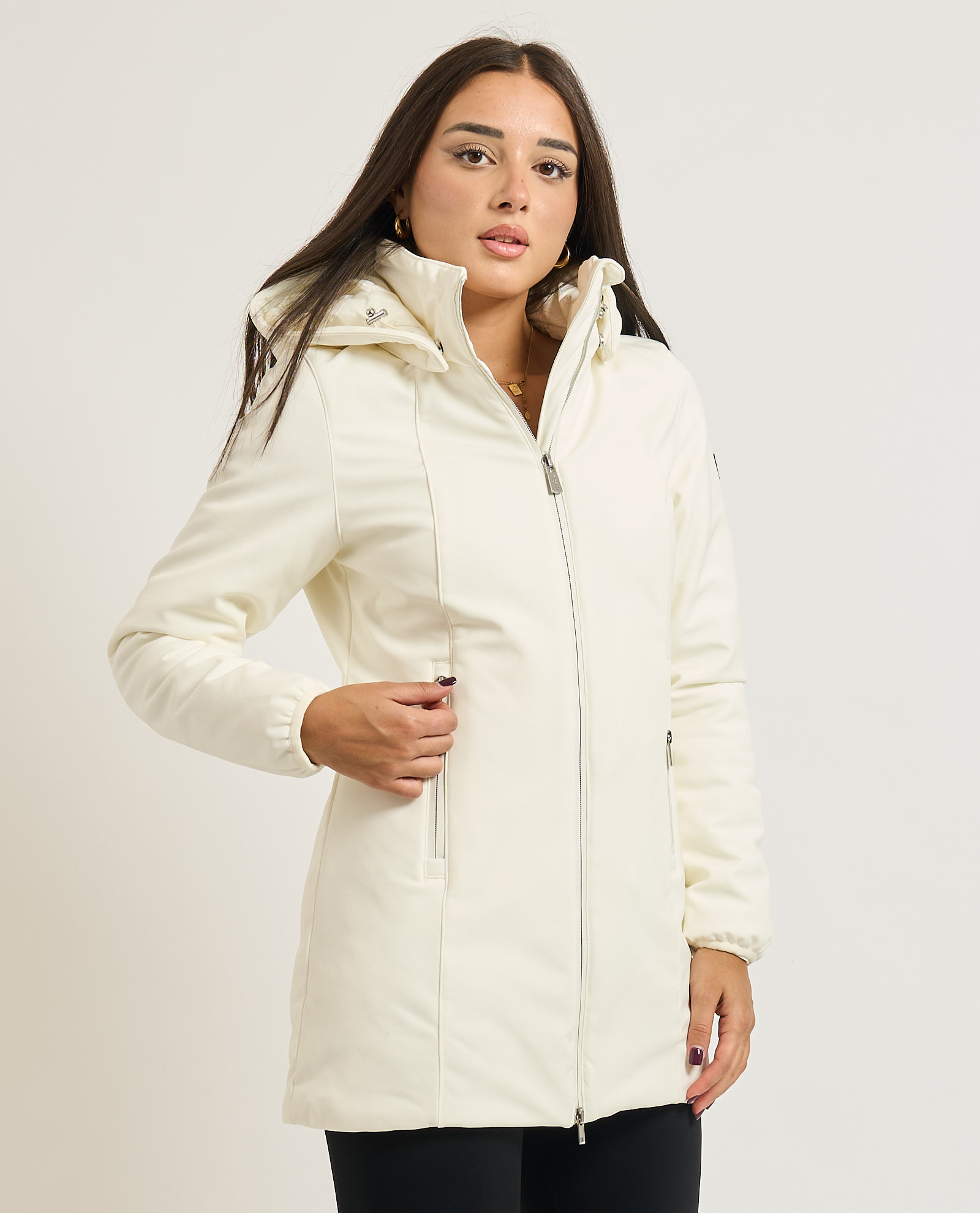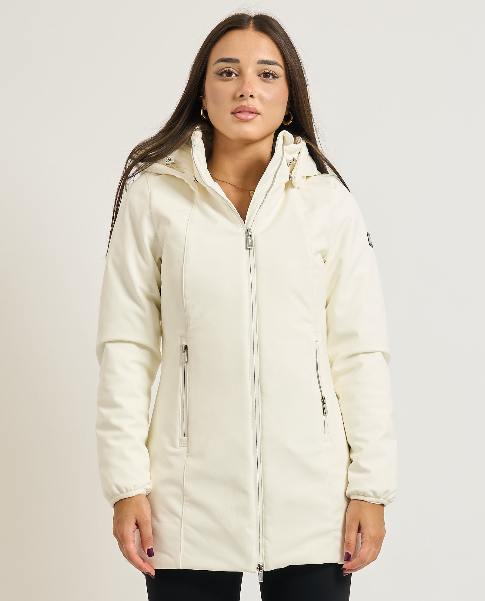 Yes Zee women's jacket with internal quilting model, hood, full zip closure and pockets with zip closure. Model wears size S and is 165cm tall