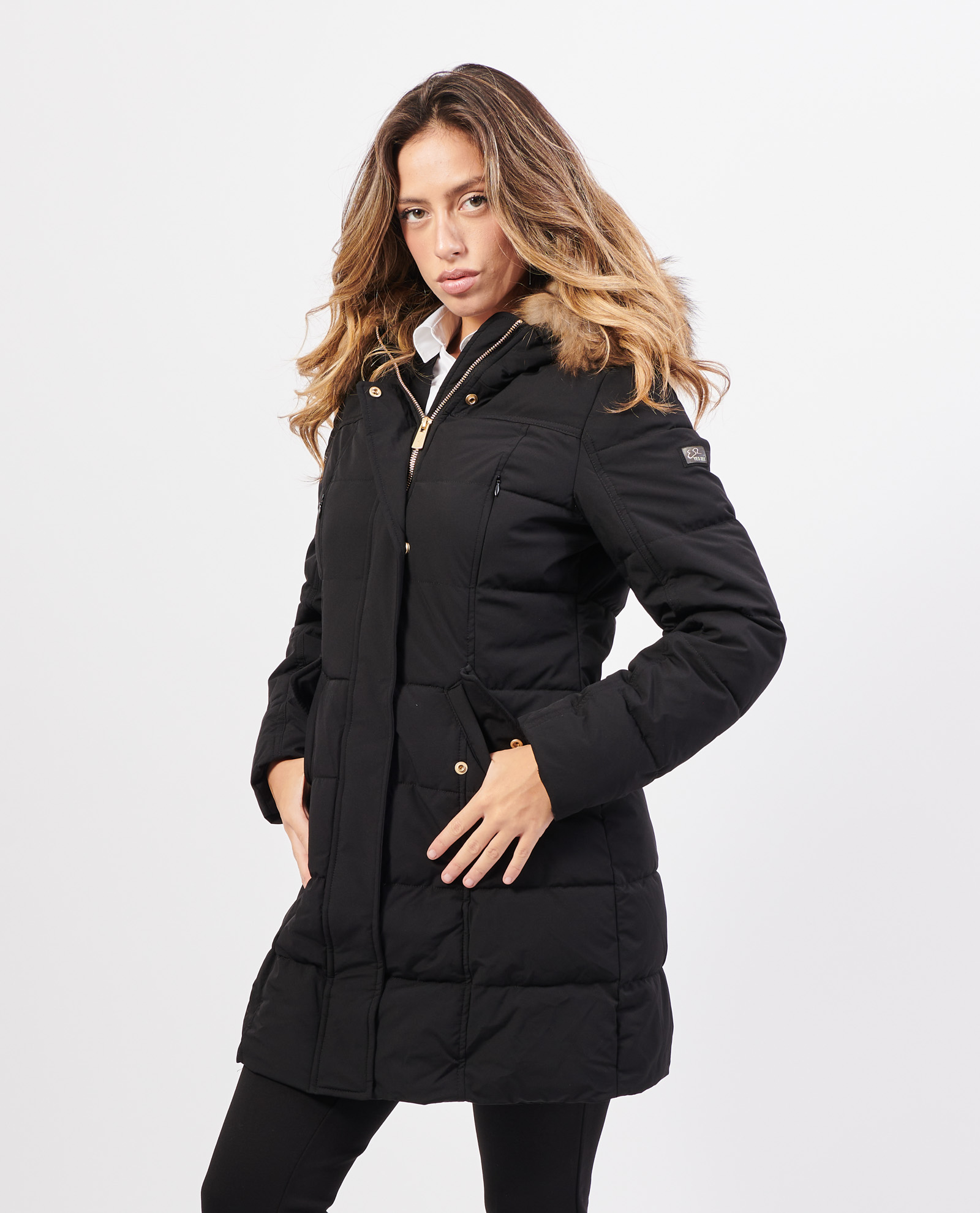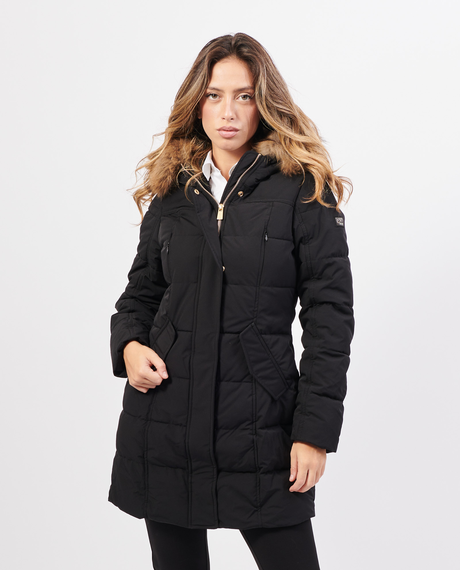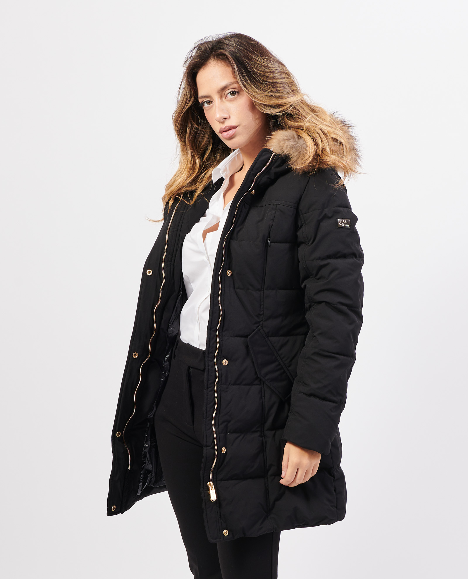 Yes Zee women's long quilted jacket with fur hood, hidden zip and button closure, 2 side pockets and 2 on the chest, logo on the arm. Model wears size S and is 165cm tall