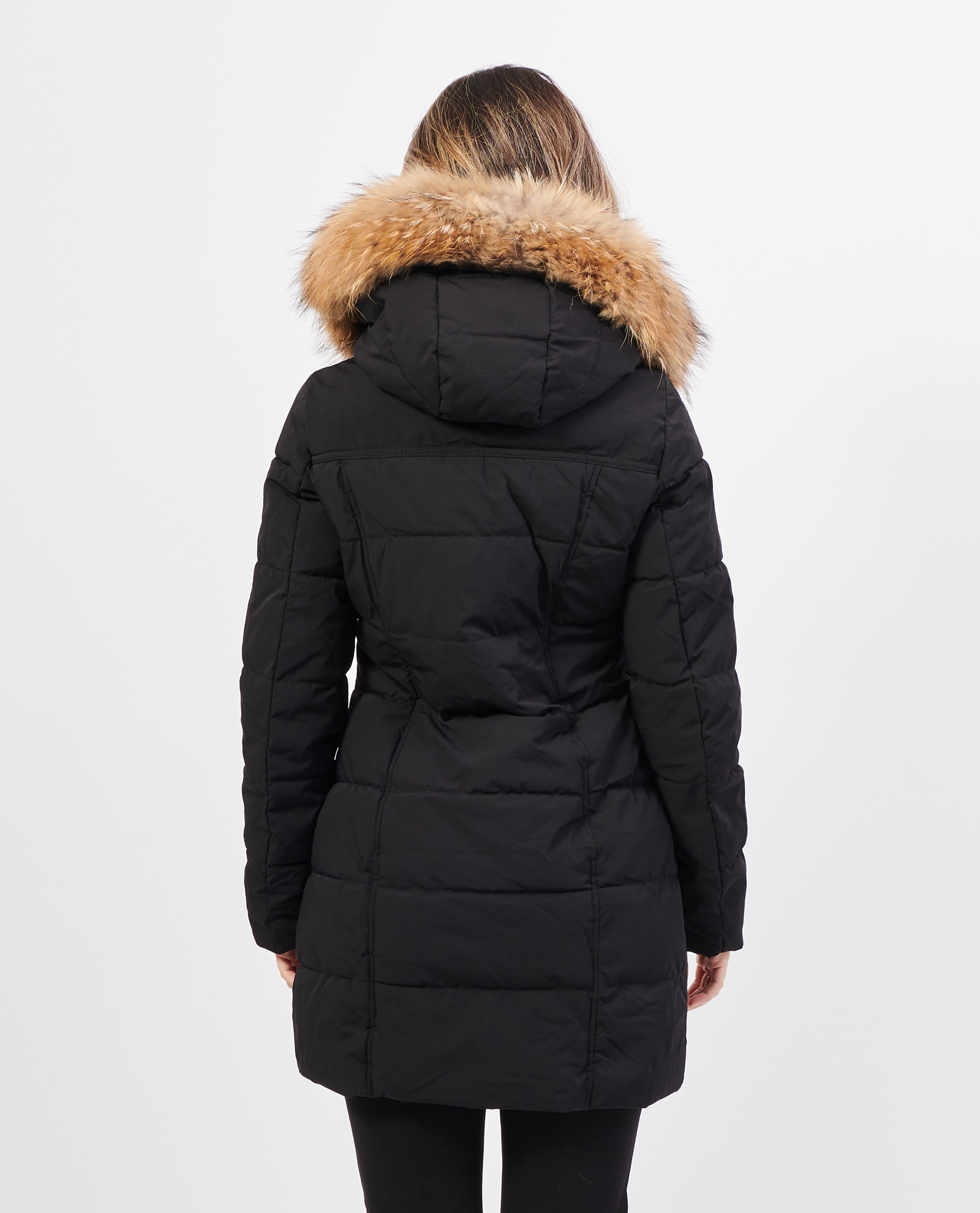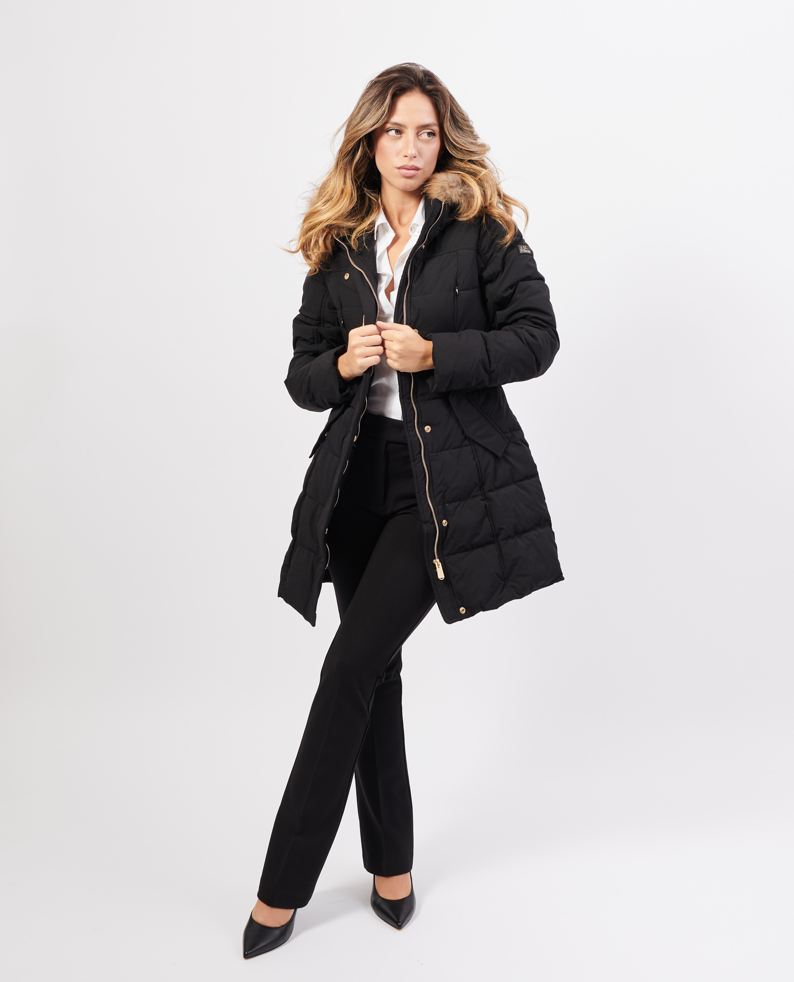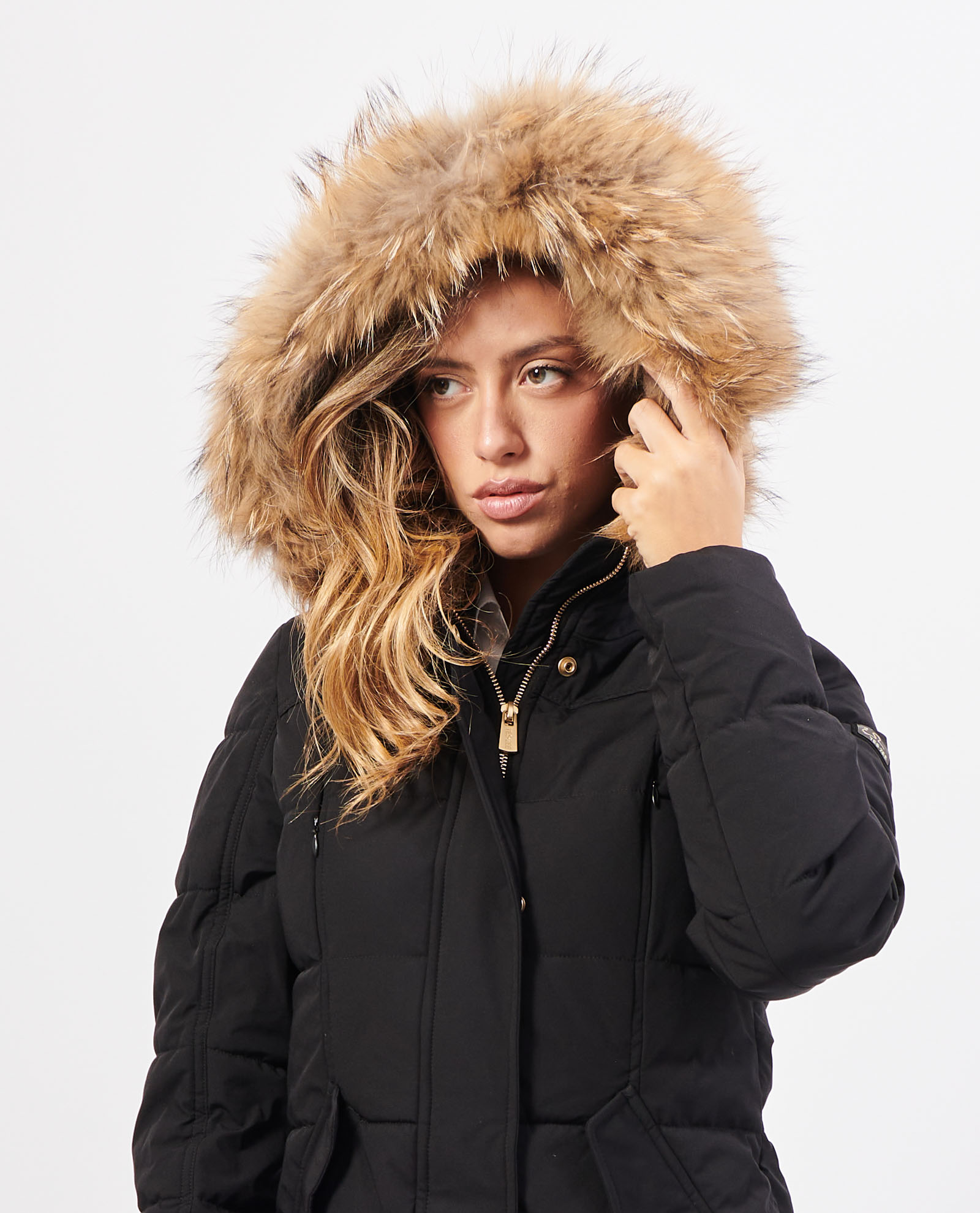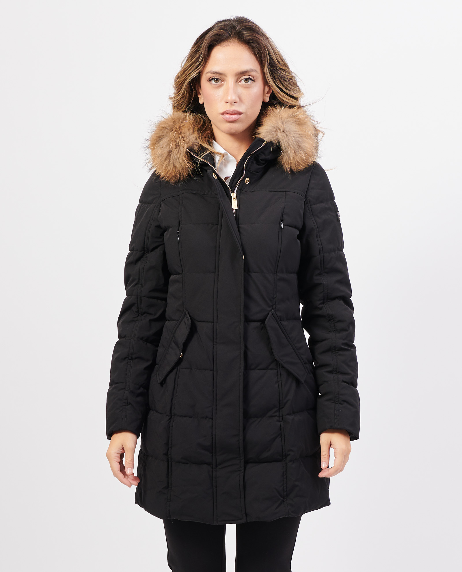 Yes Zee women's long quilted jacket with fur hood, hidden zip and button closure, 2 side pockets and 2 on the chest, logo on the arm. Model wears size S and is 165cm tall