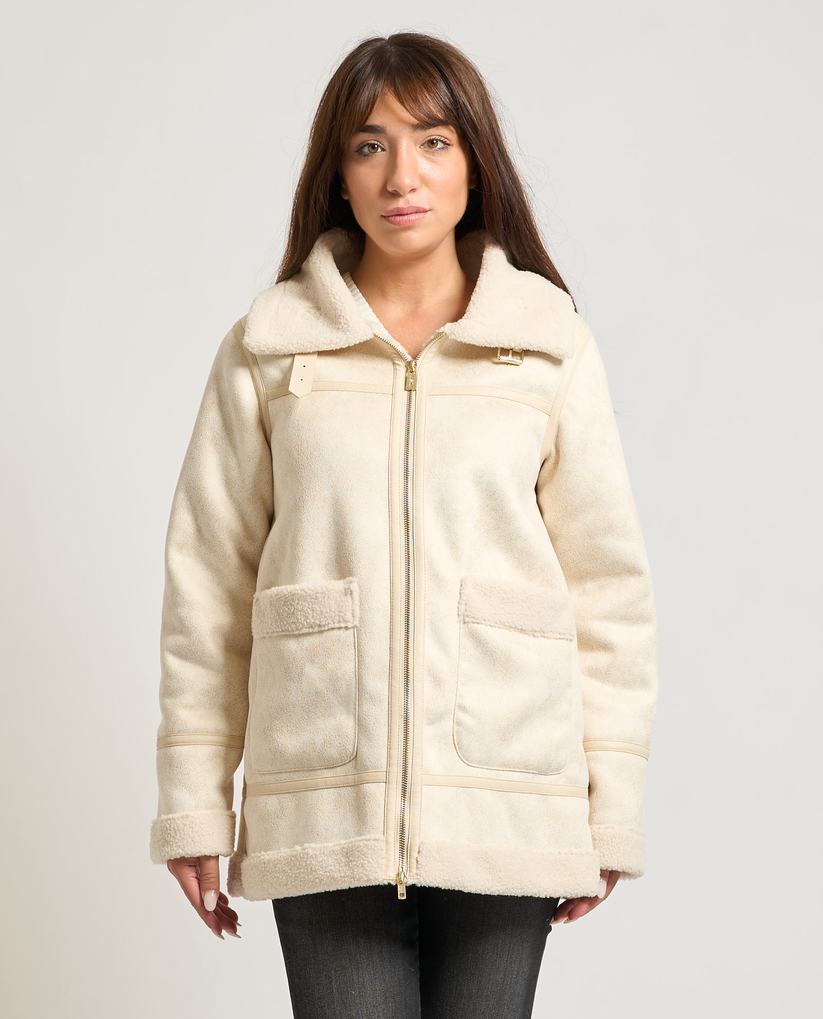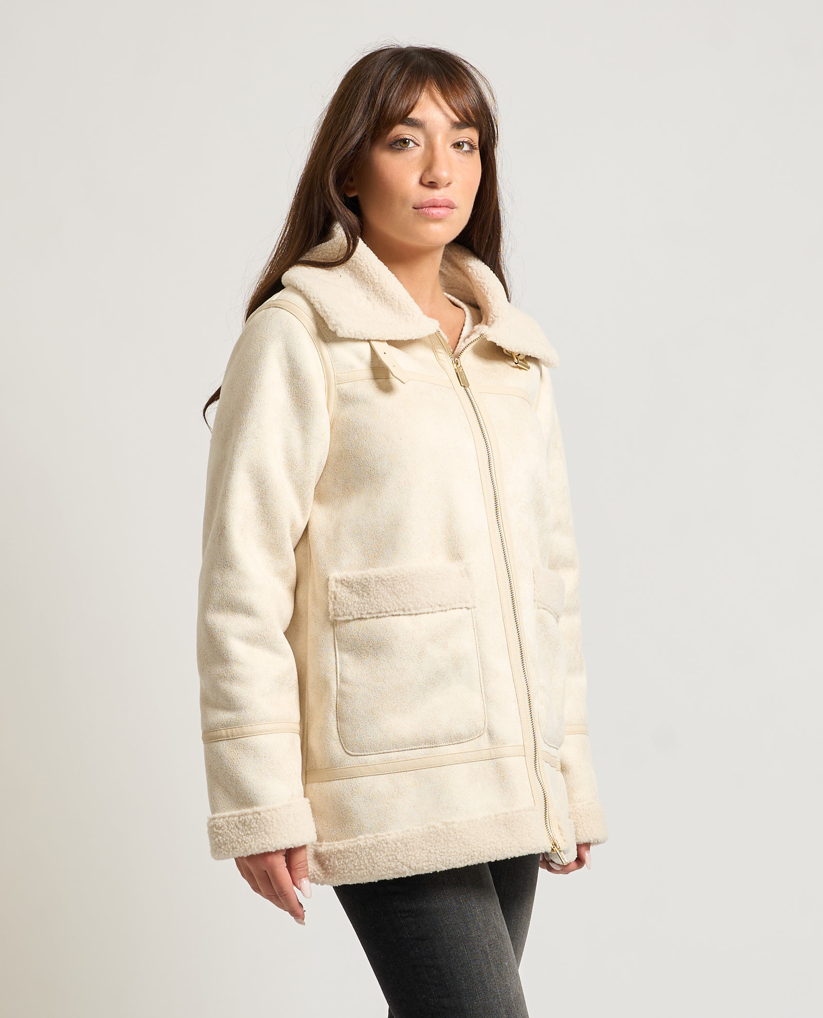 Yes Zee women's full zip coat with sheepskin exterior, ecological fur interior. Model wears size S and is 1.65m tall