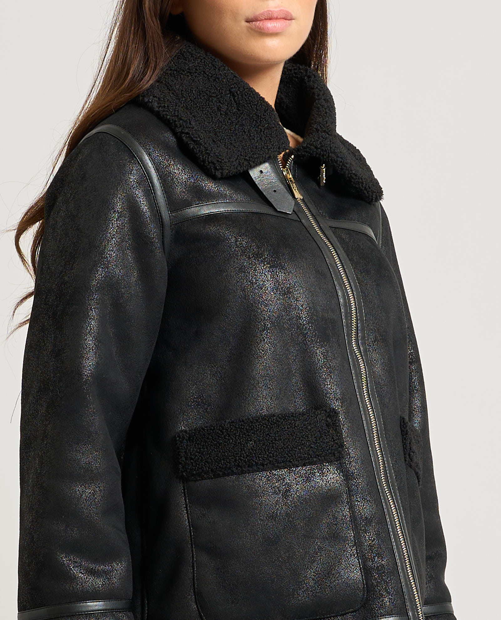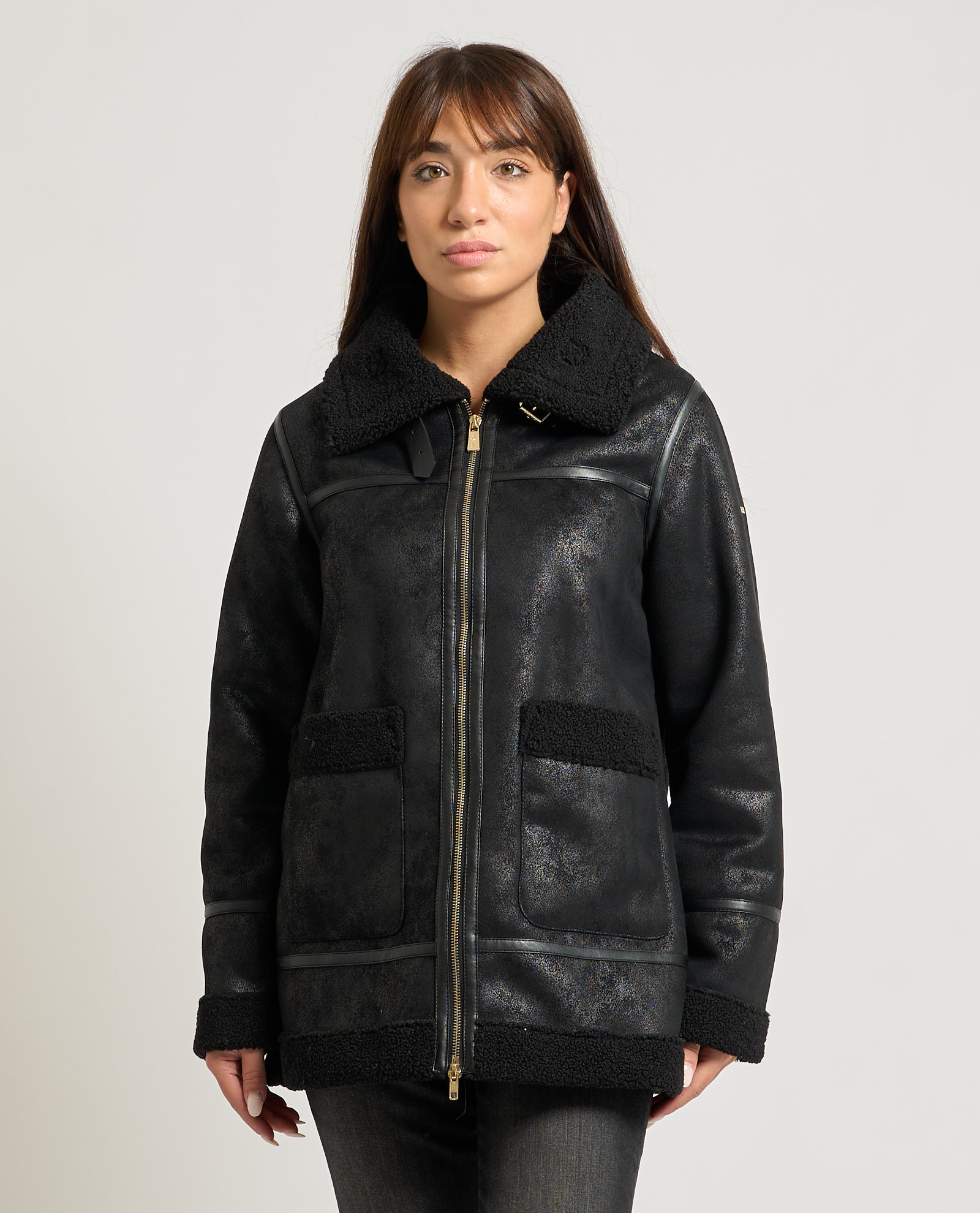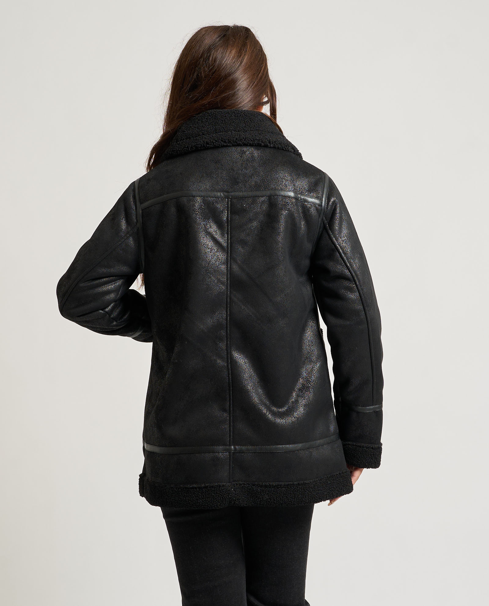 Yes Zee women's full zip coat with sheepskin exterior, ecological fur interior. Model wears size S and is 1.65m tall