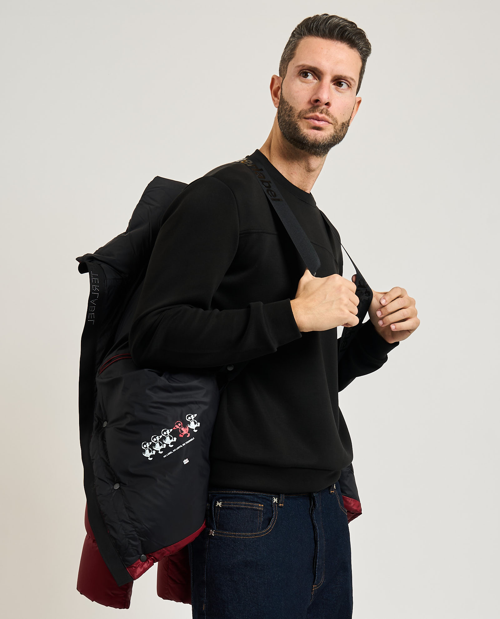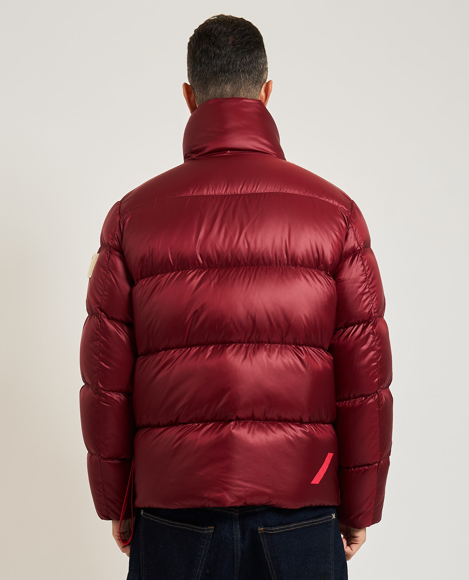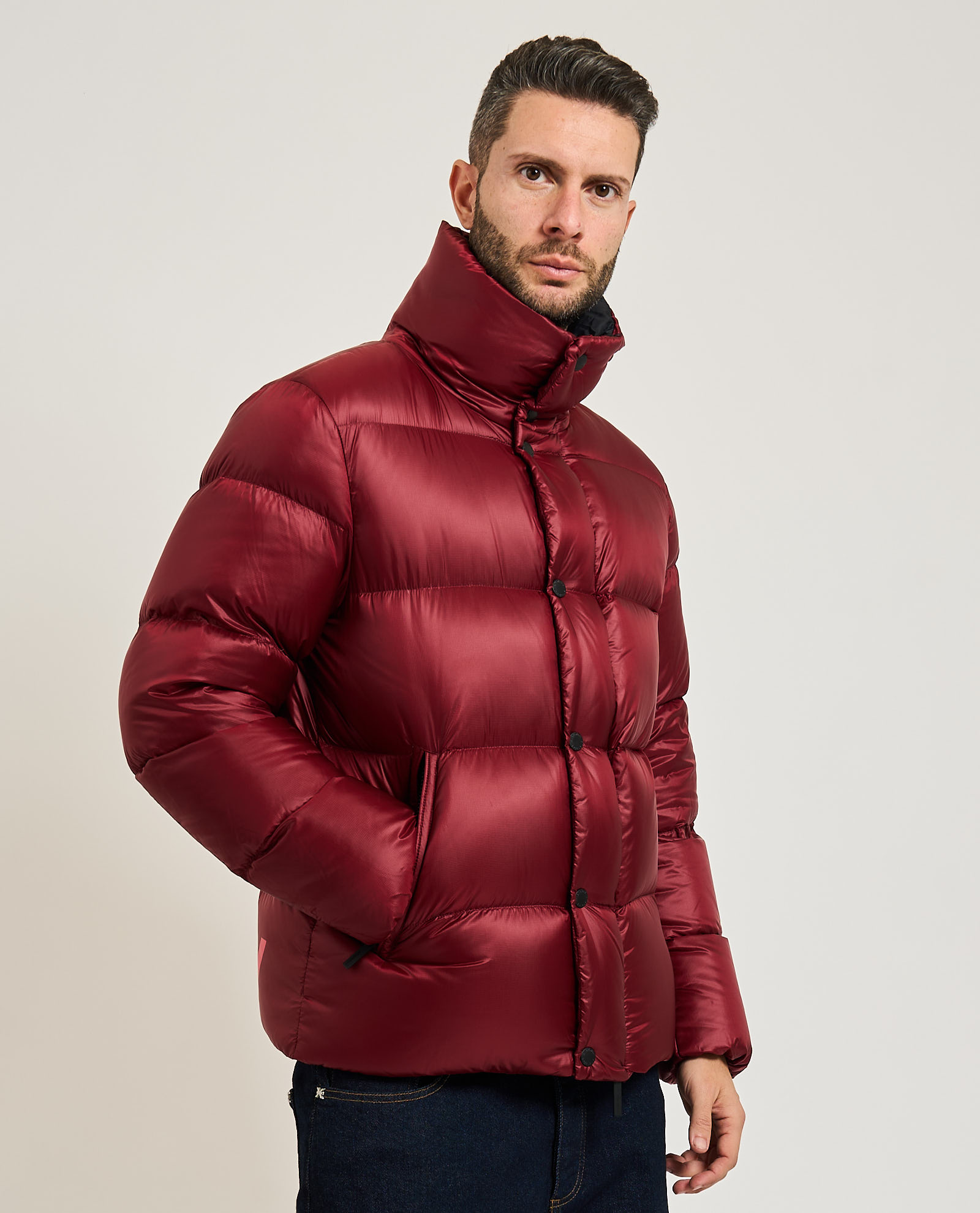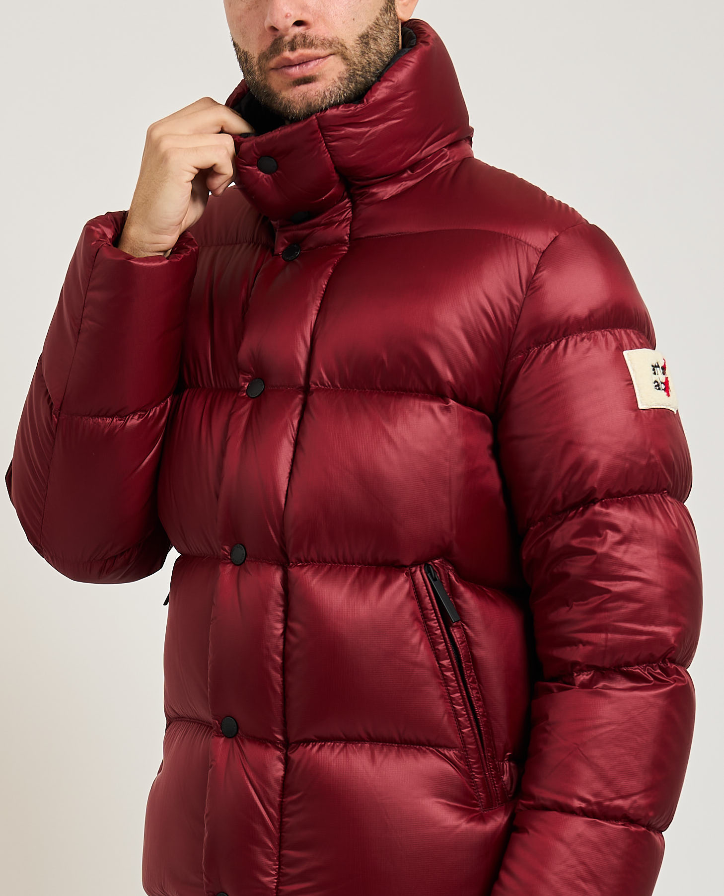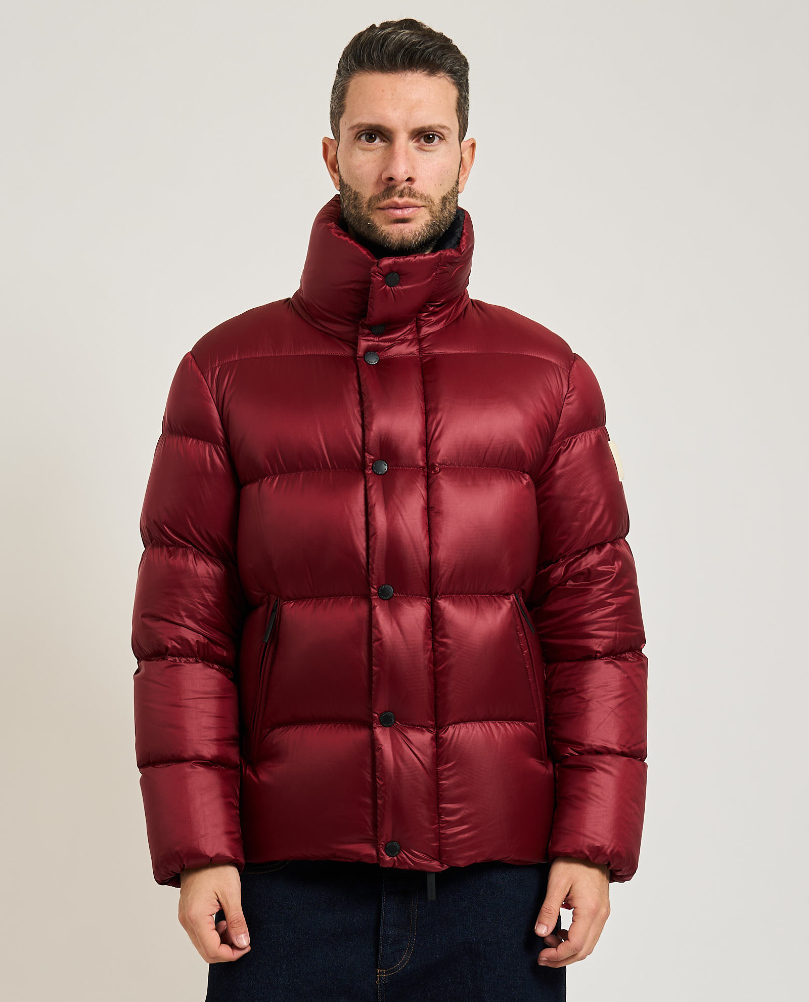 Piumino da uomo di Afterlabel in nylon stretch opaco. Chiusura frontale con zip pressofusa e paramontura con bottoni a pressione in tinta al capo. Doppia tasca a filetto, patch sulla manica sinistra. Il modello indossa una M ed è alto 1.85m