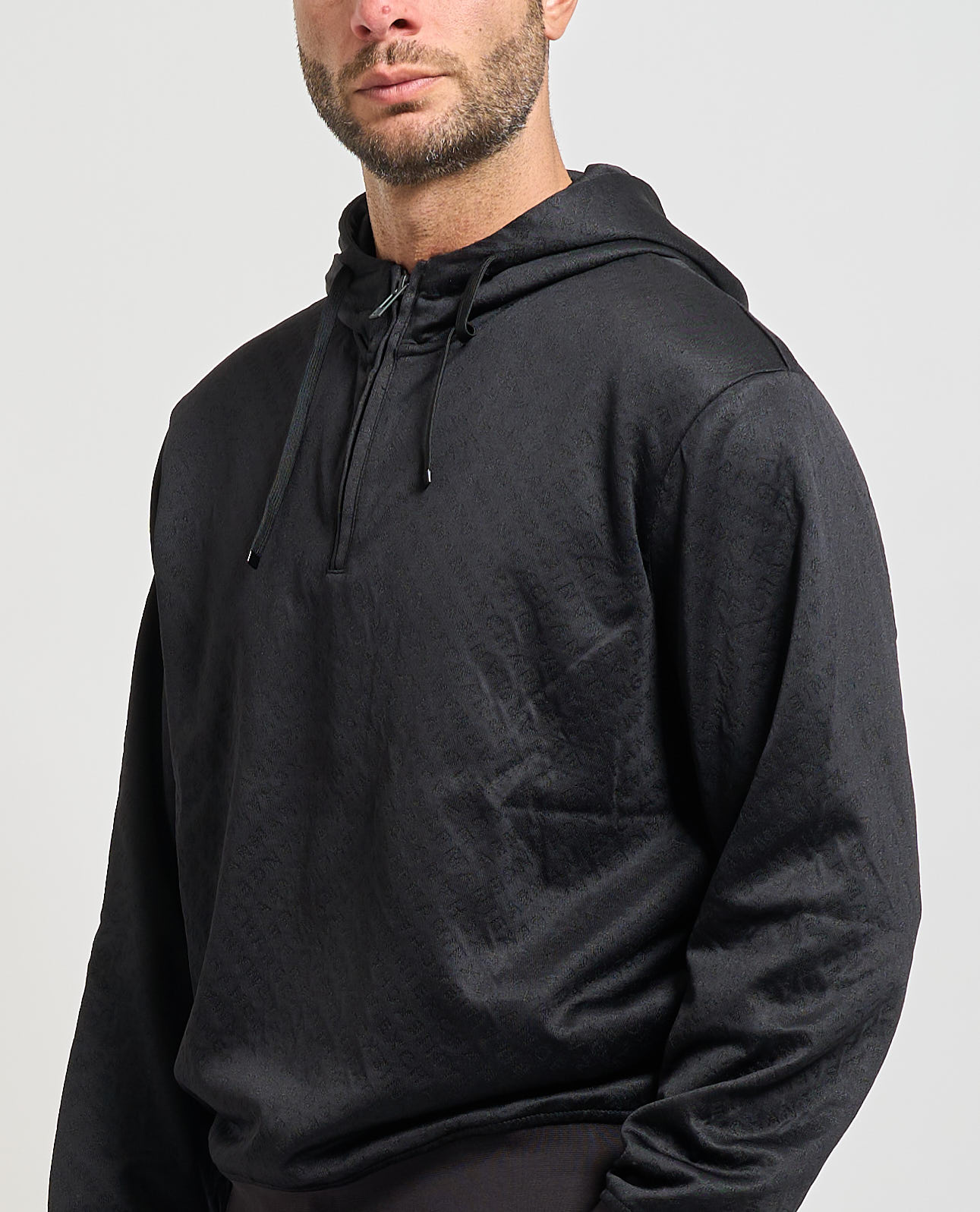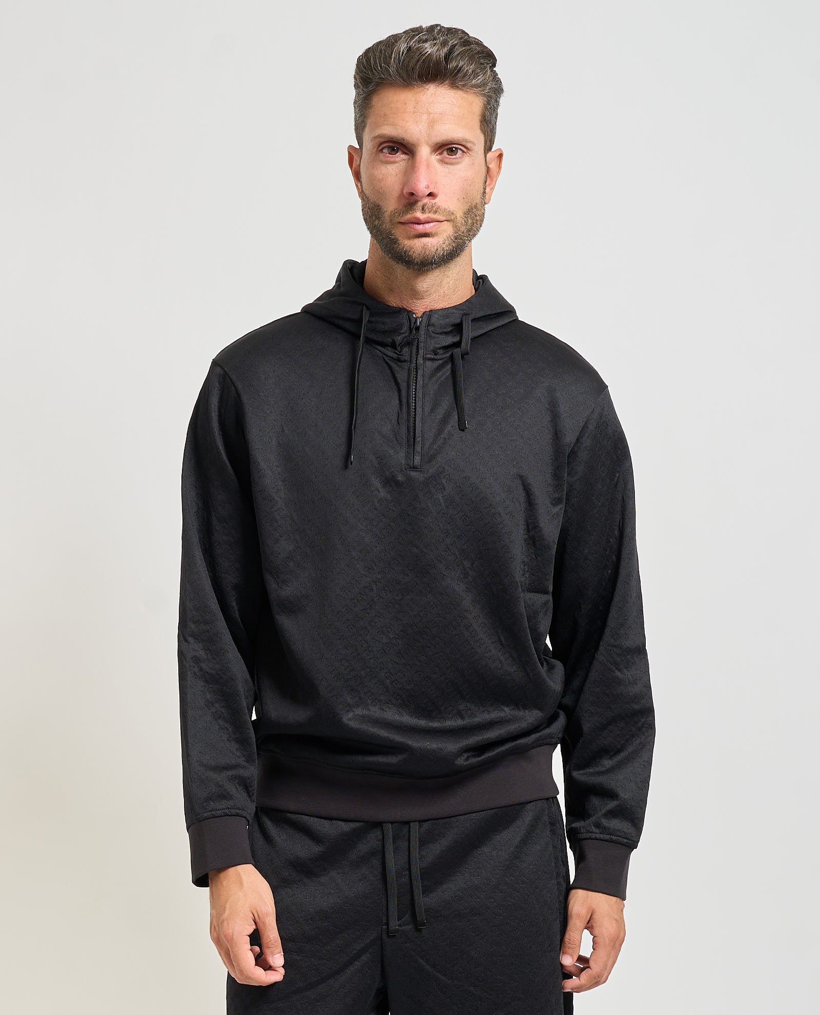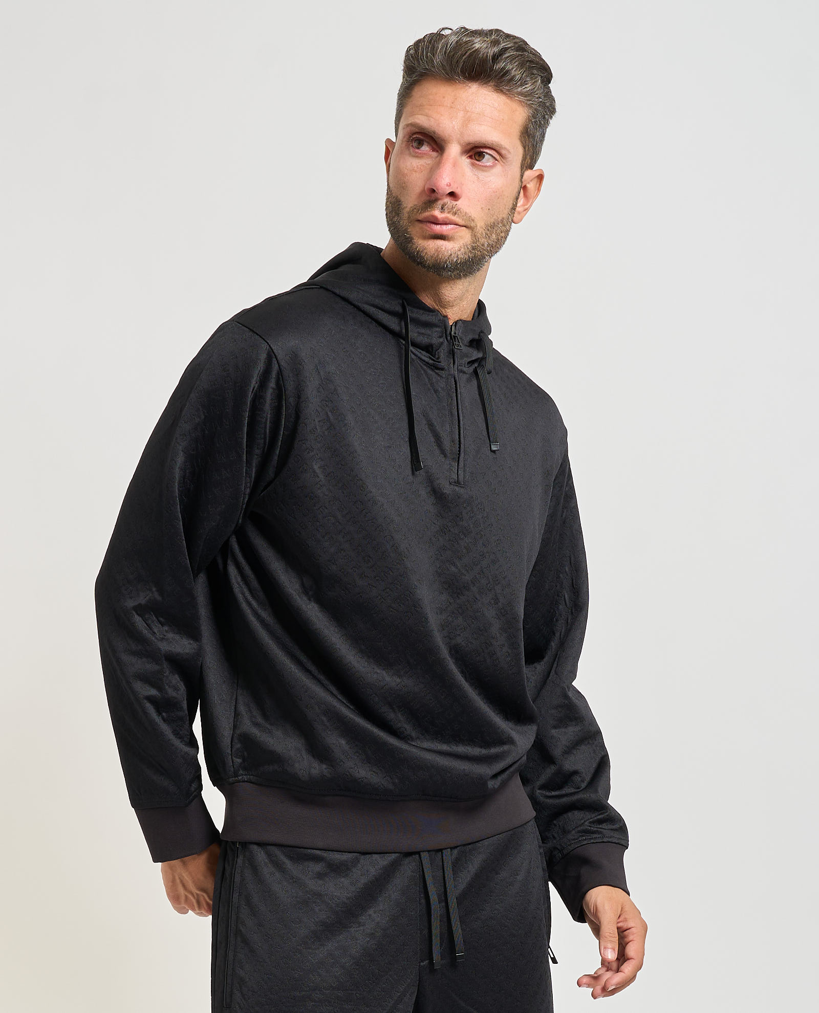 Felpa con cappuccio uomo Armani Exchange in micro texture, chiusura a mezza zip sul davanti, fondo del capo a costine e vestibilità regolare. Il modello indossa la taglia M ed è alto 185cm