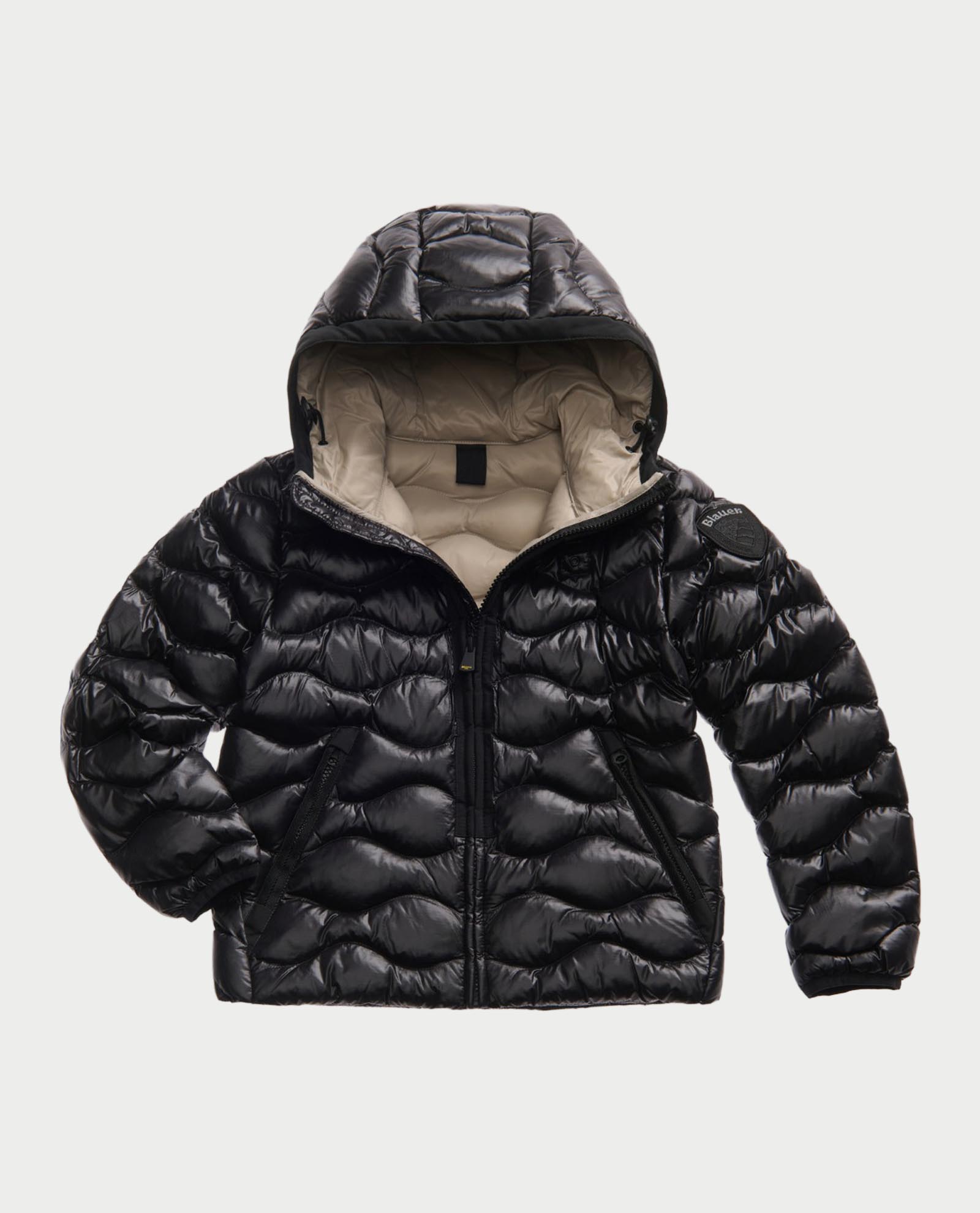 Giubbotto per bambini e ragazzi firmato Blauer con trapuntatura a onde all over. Cappuccio, chiusura e tasche fullzip, foderato in contrasto di colore. Patch e passante con logo.
