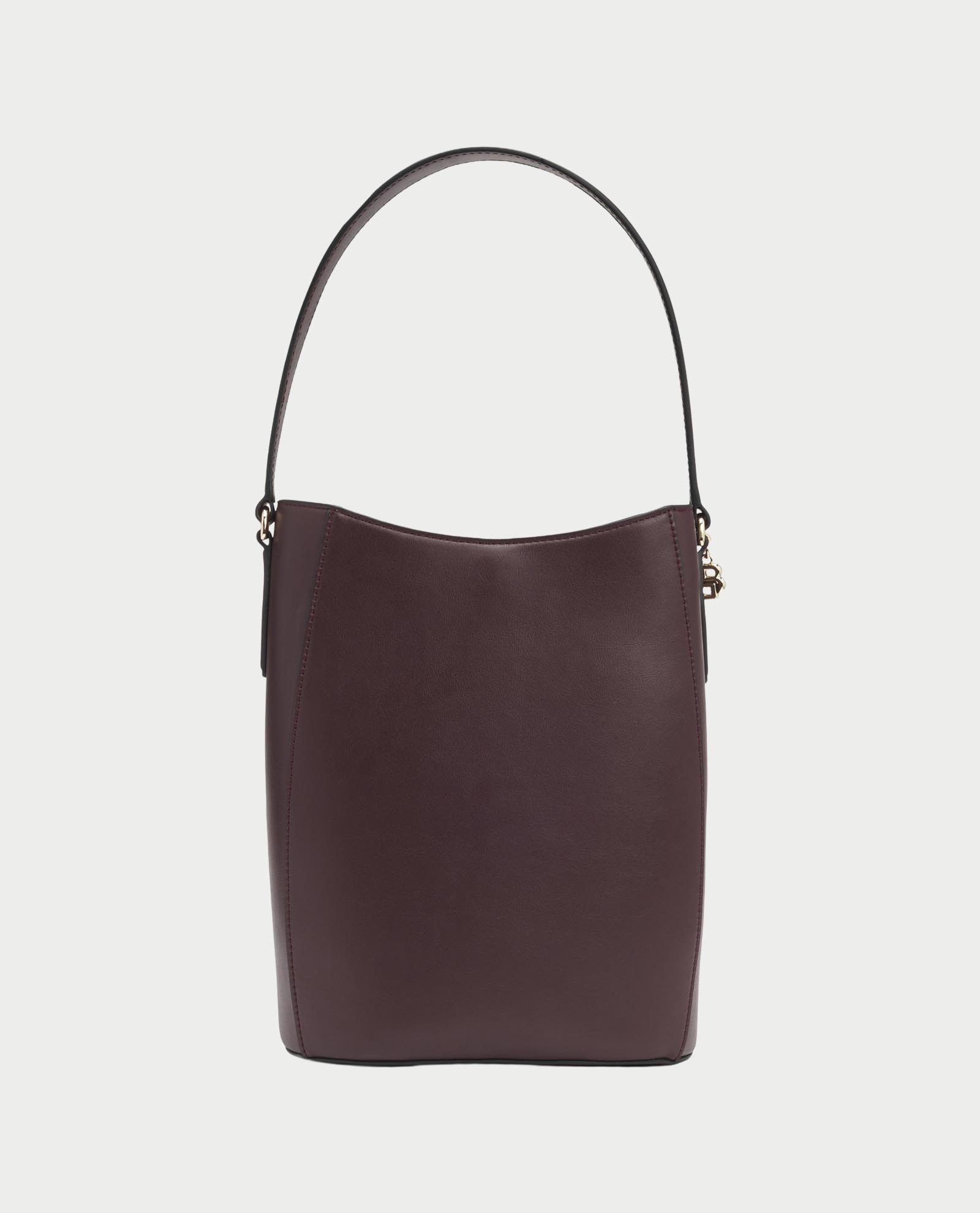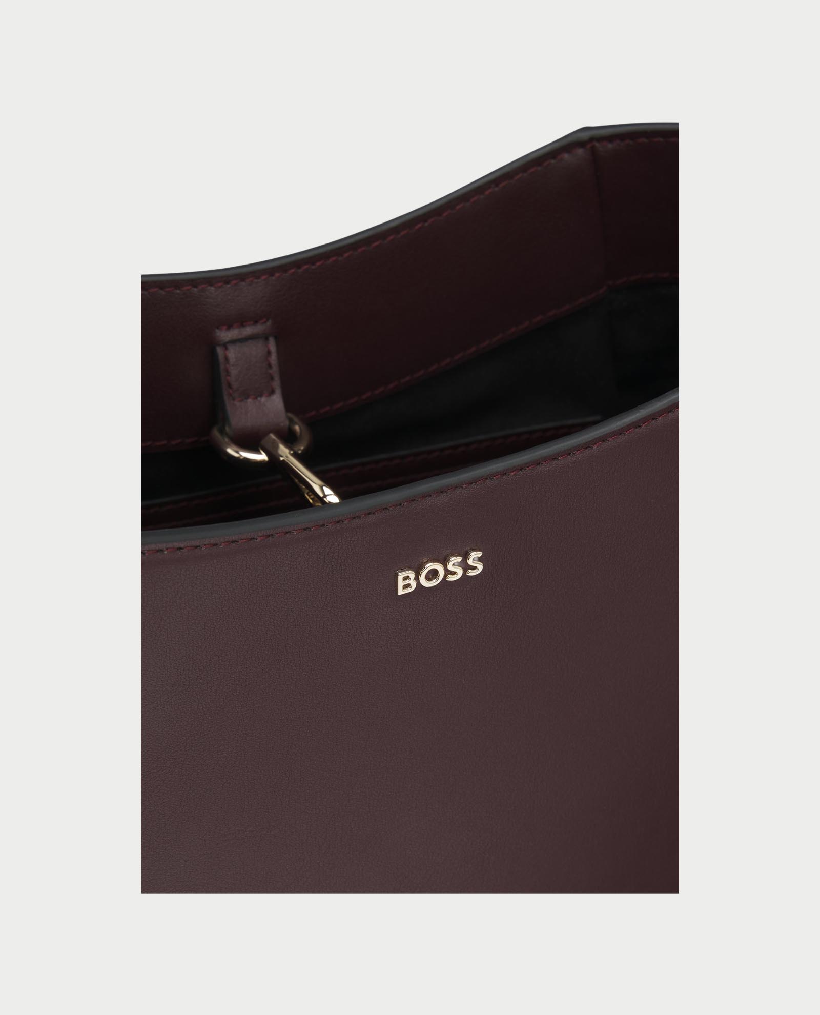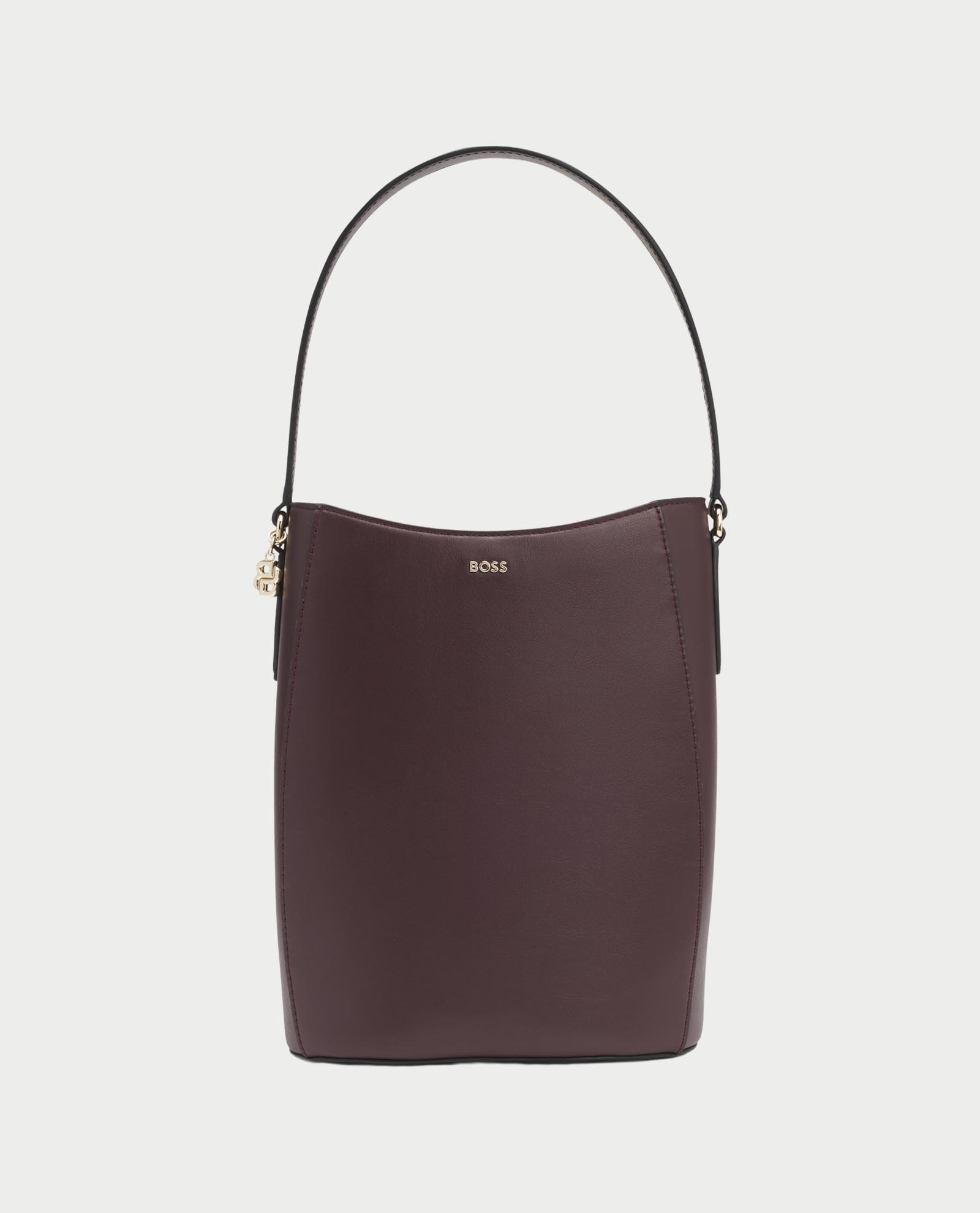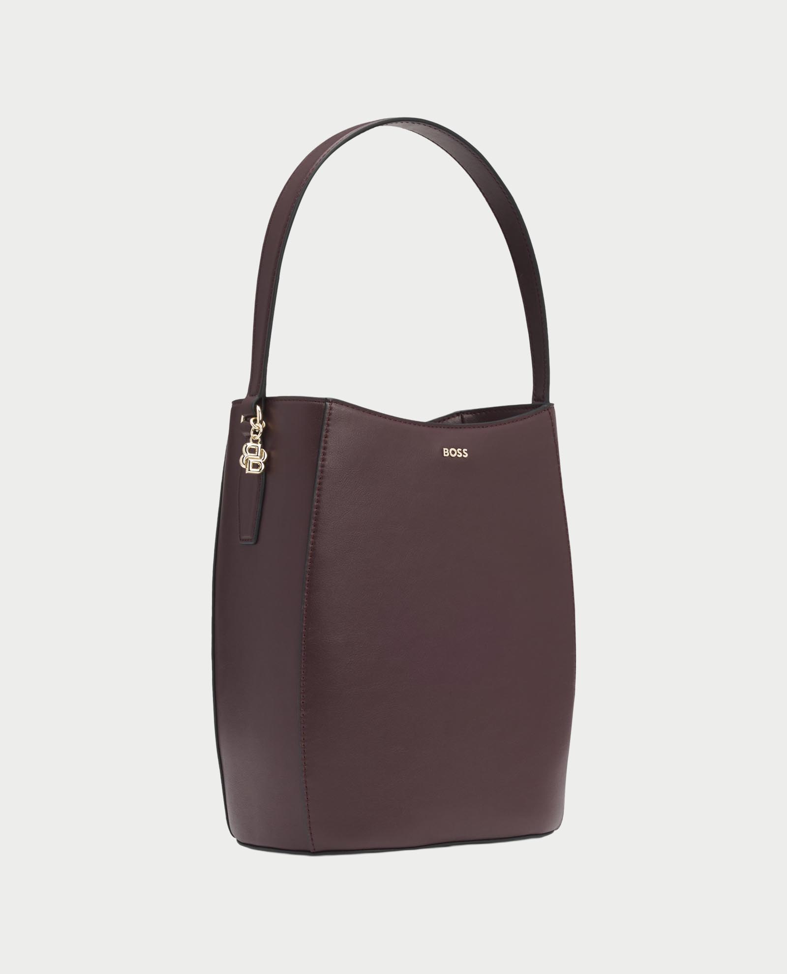 Borsa a secchiello per donna firmata Boss con ciondolo Double B monogram. Una tasca interna con zip, una tasca aperta, chiusura con gancio, dettagli metallici. Misure: 29x23x16cm