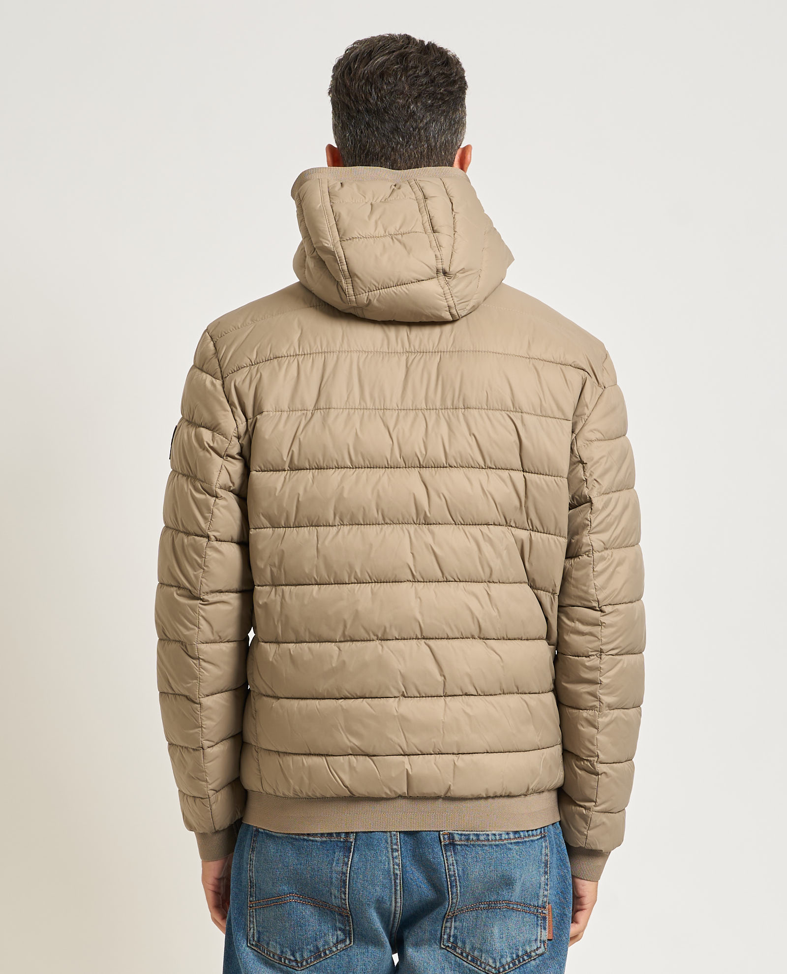 Giubbotto per uomo firmato Boss della linea Orange dal design trapuntato all over. Collo alto con cappuccio, chiusura fullzip, tasche laterali. Lunghezza standard, regular fit.