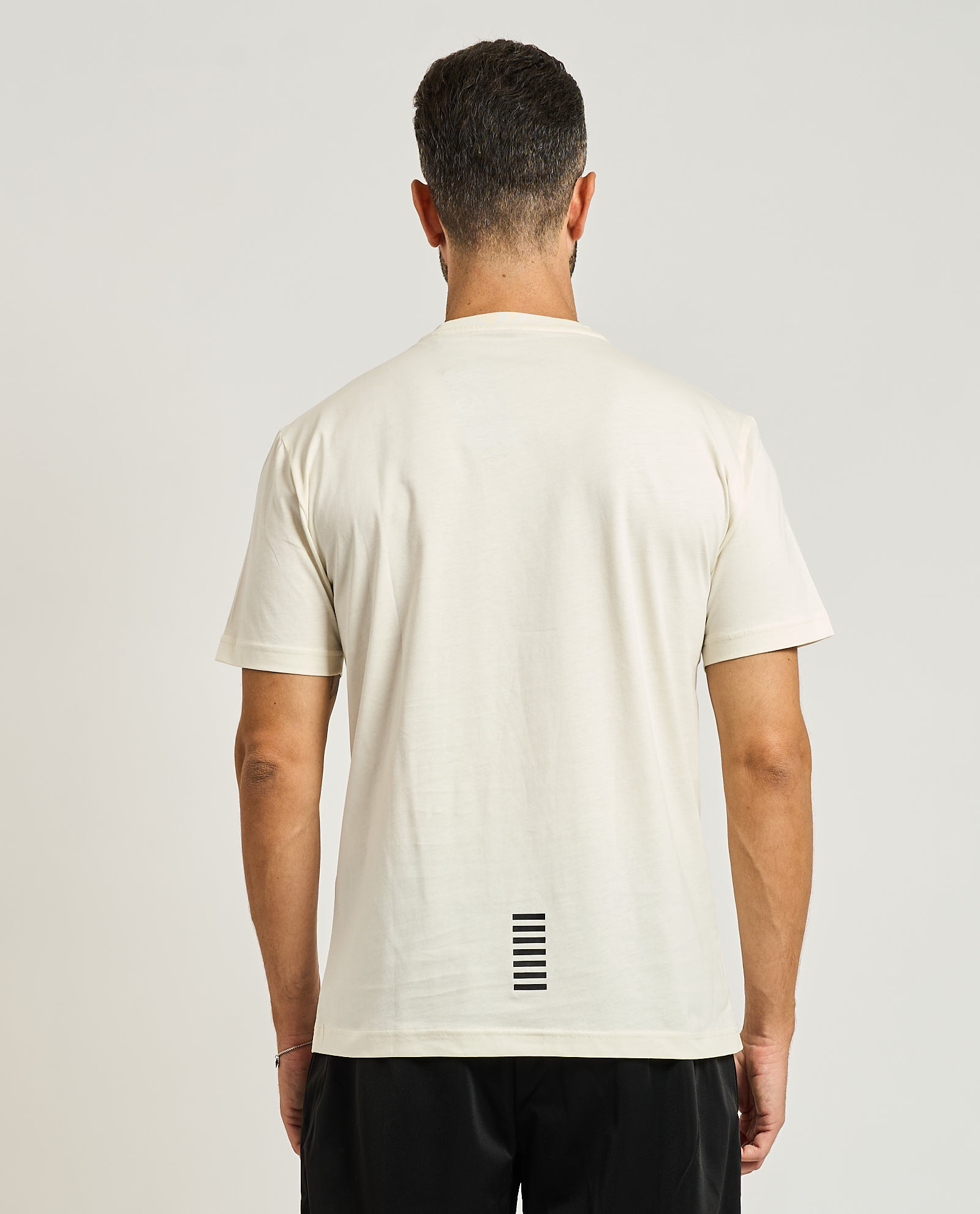 T-shirt da uomo firmata Emporio Armani EA7, basic girocollo, maniche corte, logo piccolo a contrasto sul petto. Regular fit. Il modello indossa una M ed è alto 1.85m