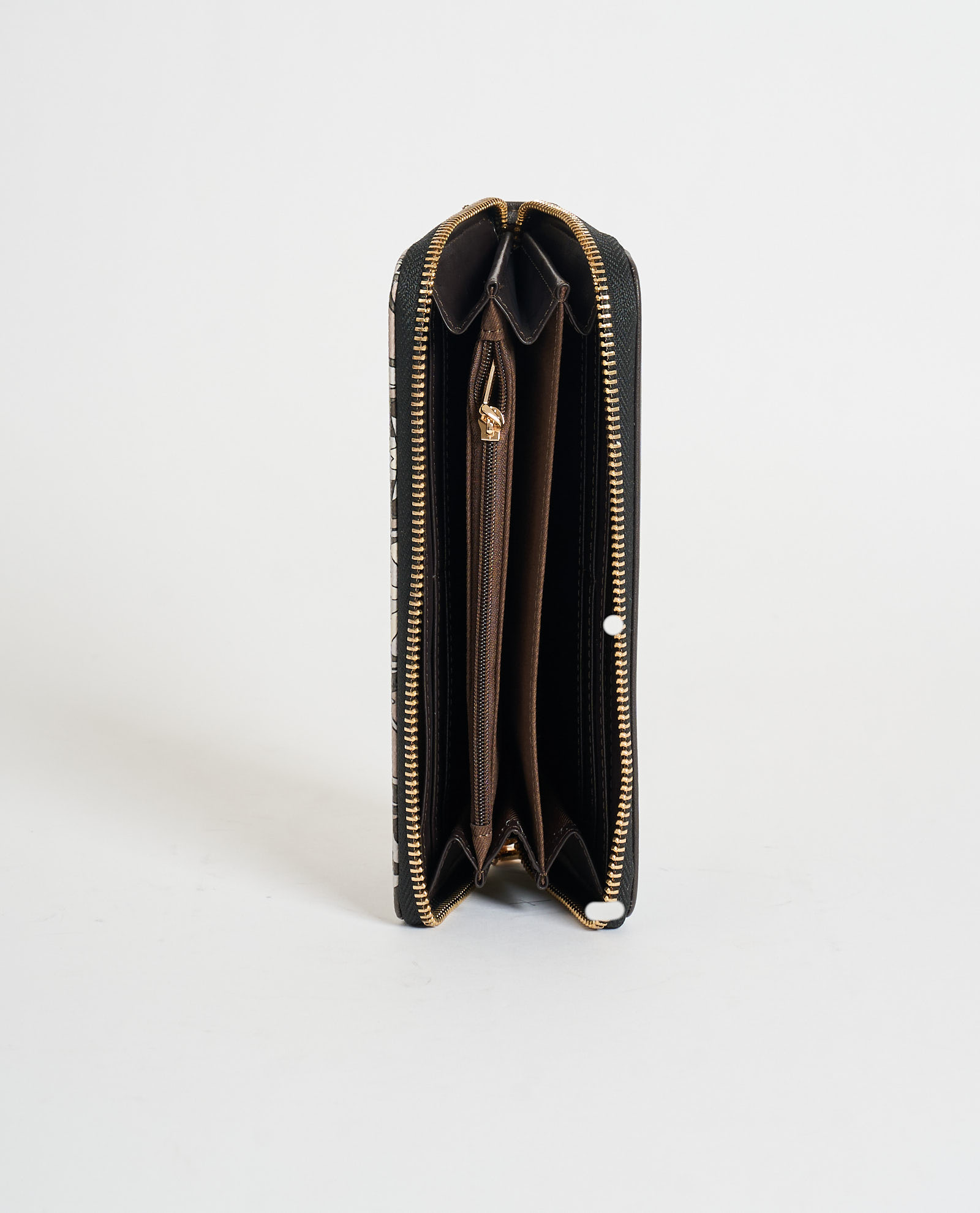 Portafogli grande zip around per donna firmato Gattinoni realizzato in pvc e con iconica fantasia Teodosia. Tasca portamonete con cerniera. Dimensioni: 18,5x2,5x10 cm