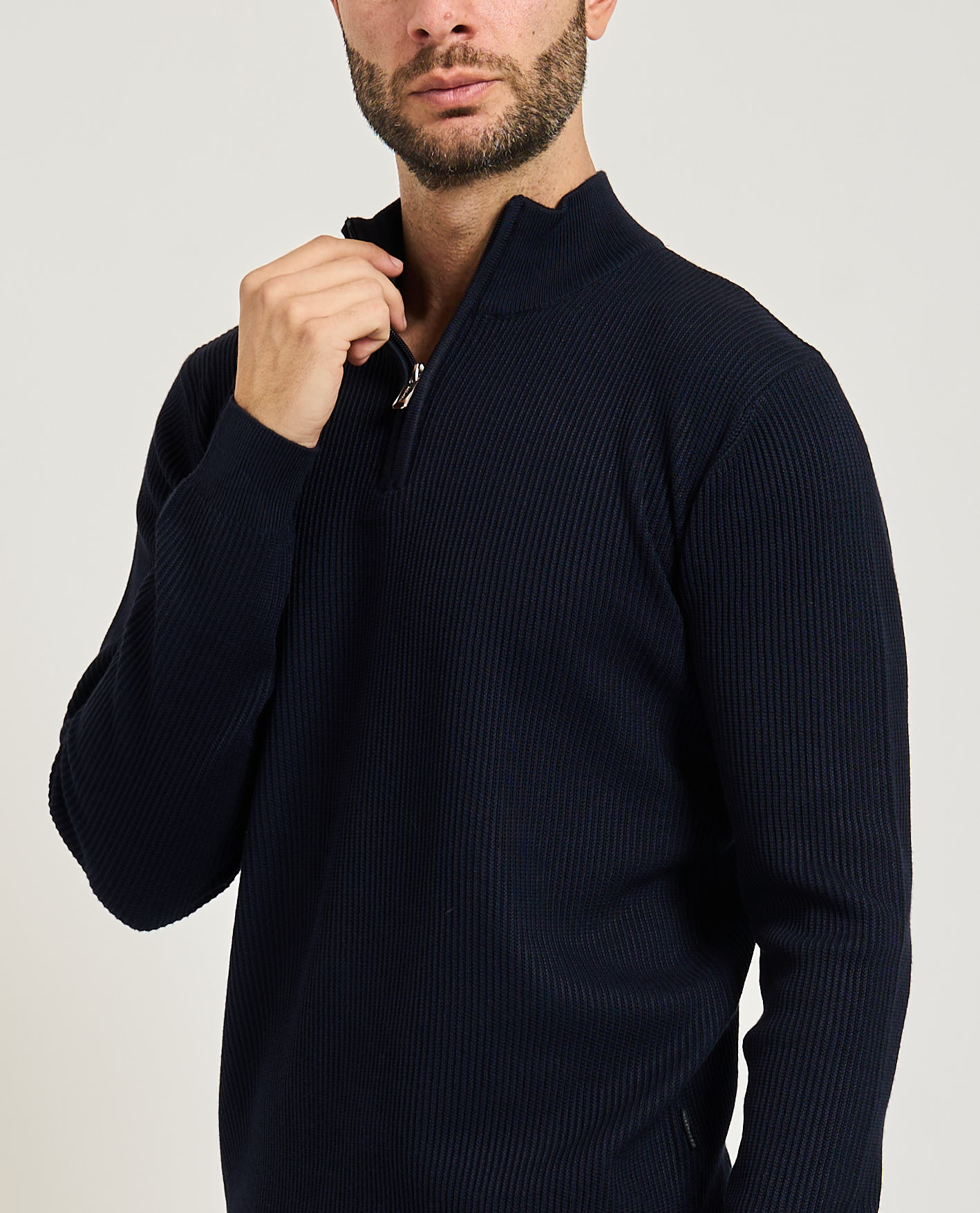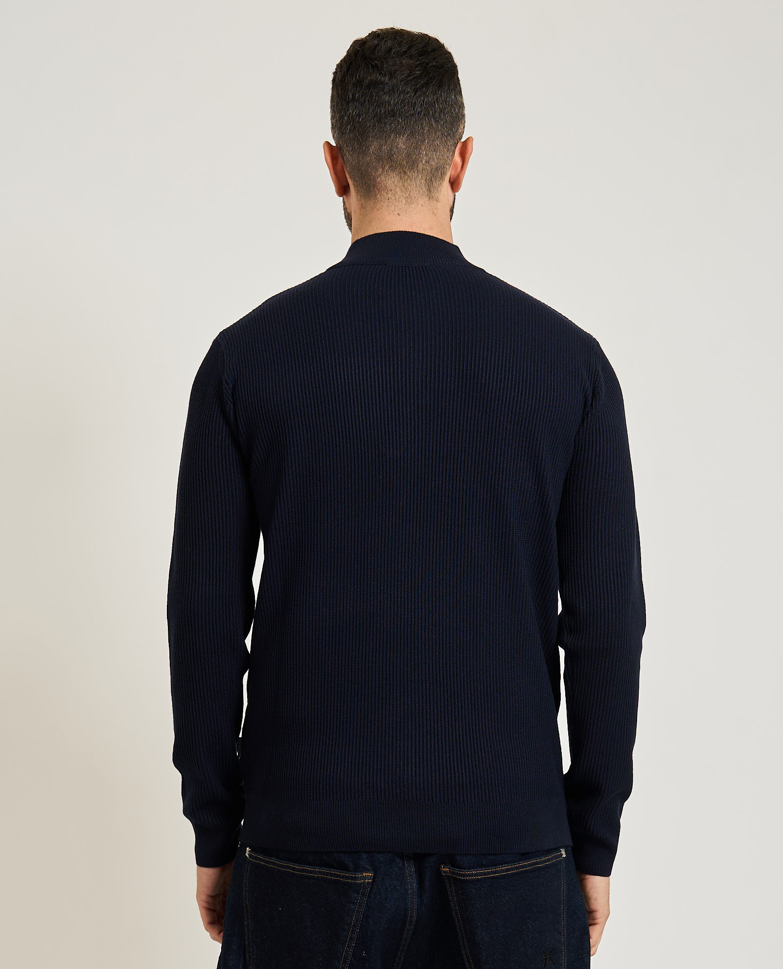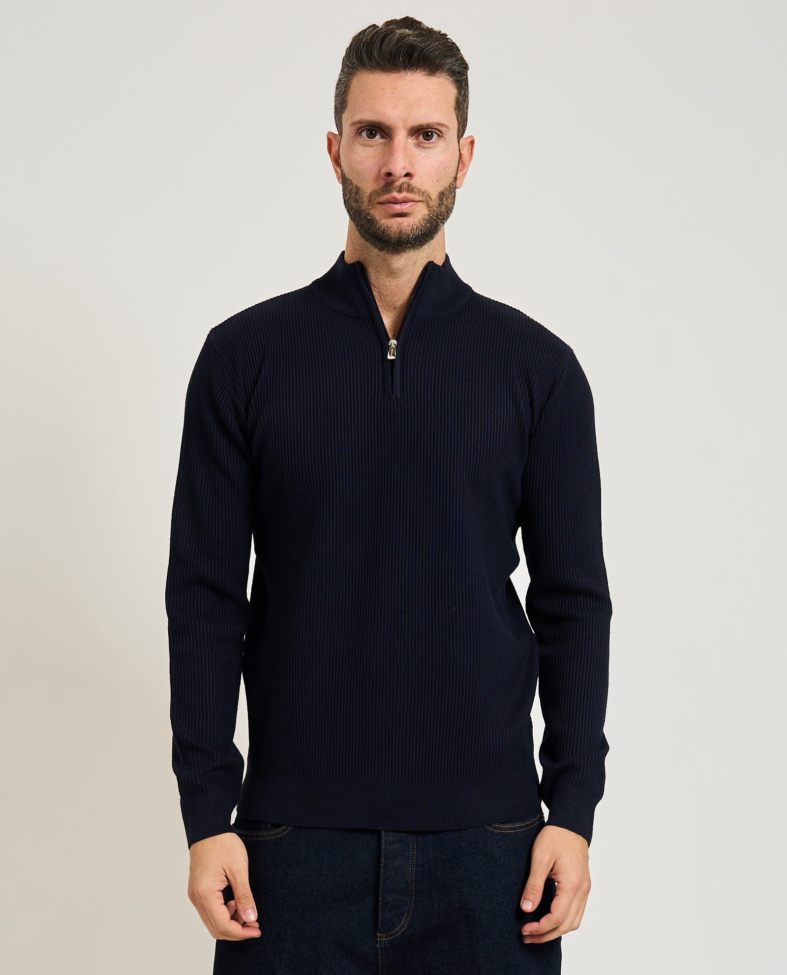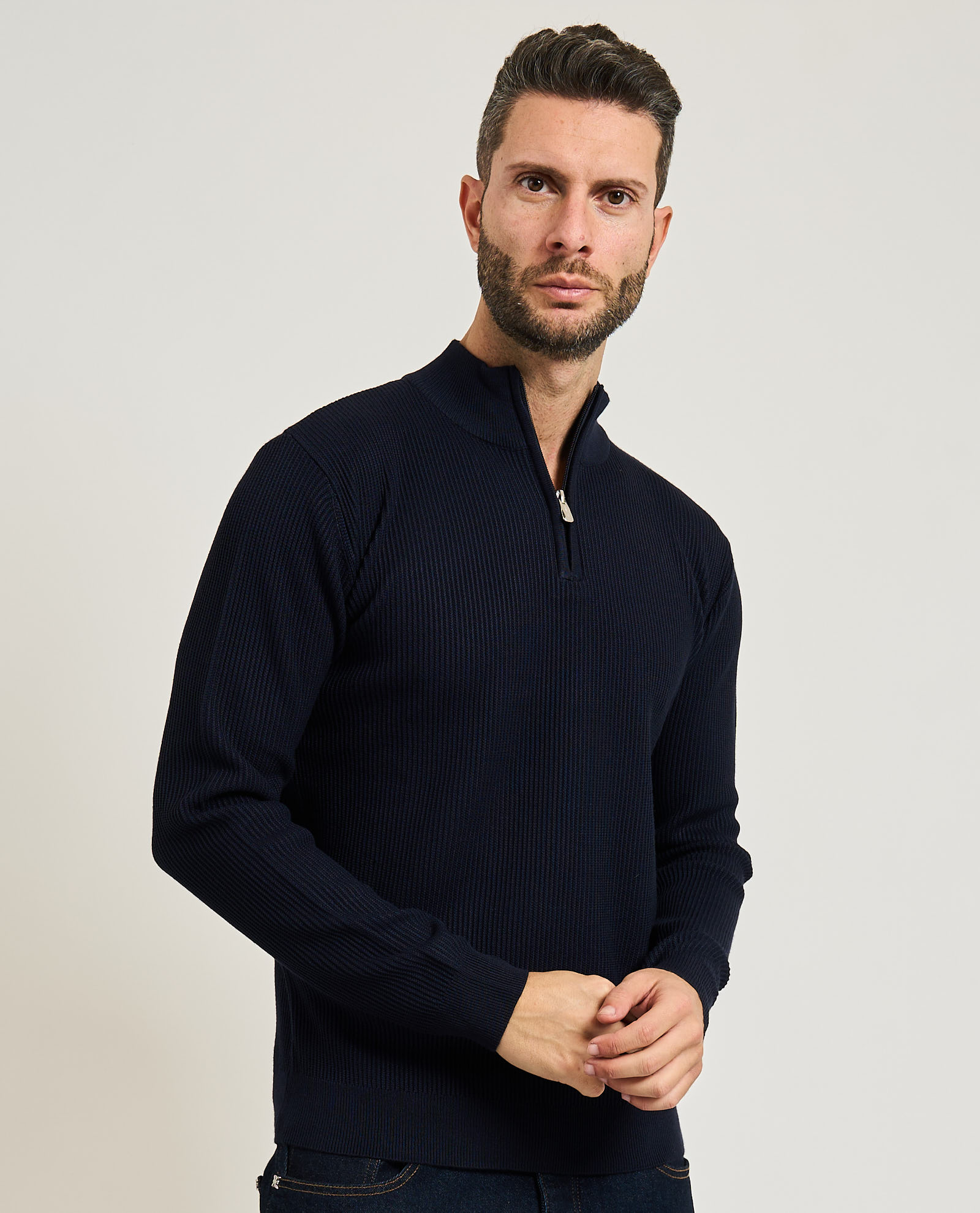 Maglione per uomo firmato Gazzarrini con lavorazione a costine verticali all over. Collo a mezza zip, maniche lunghe, regular fit. Il modello indossa una M ed è alto 1.85m