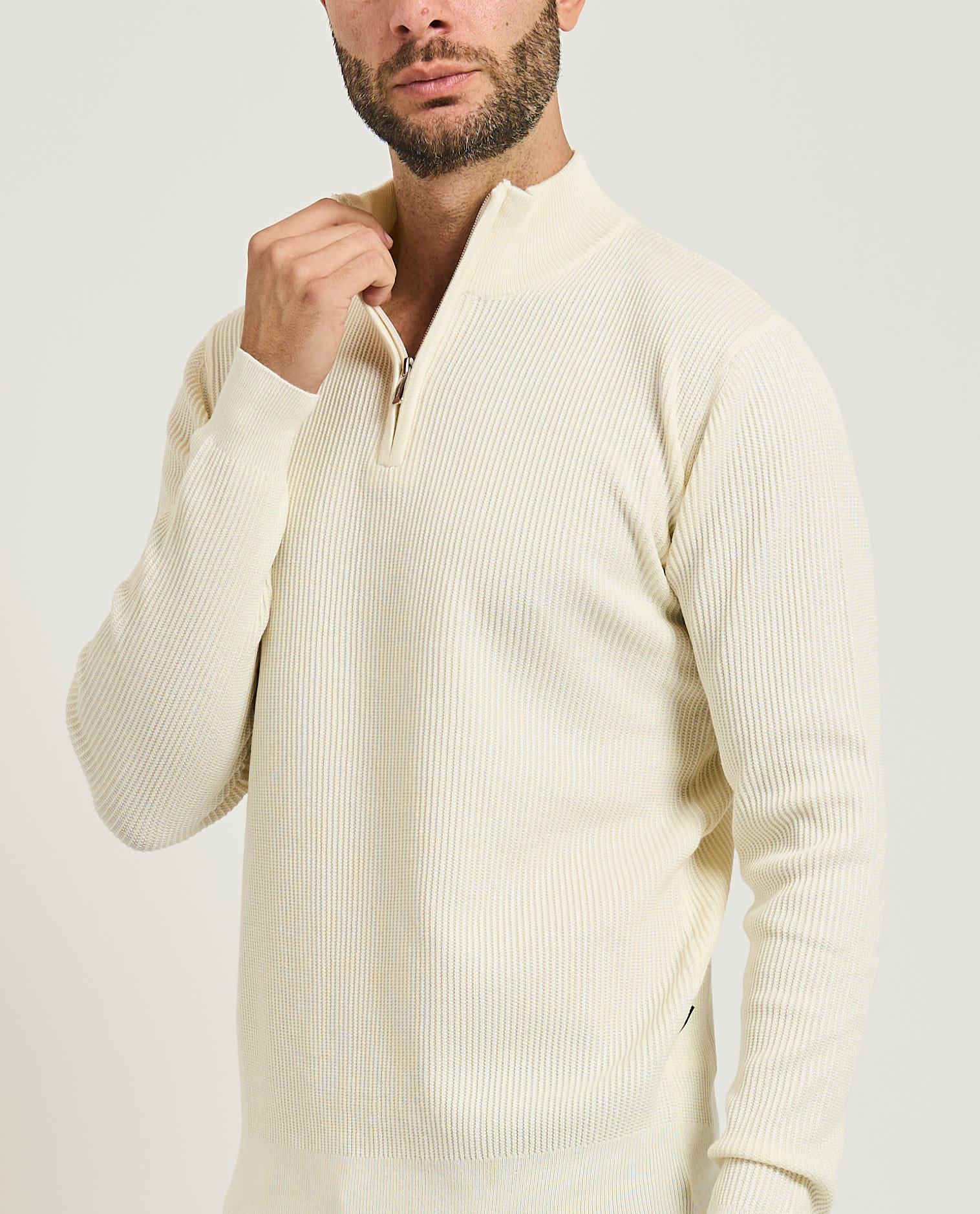 Maglione per uomo firmato Gazzarrini con lavorazione a costine verticali all over. Collo a mezza zip, maniche lunghe, regular fit. Il modello indossa una M ed è alto 1.85m