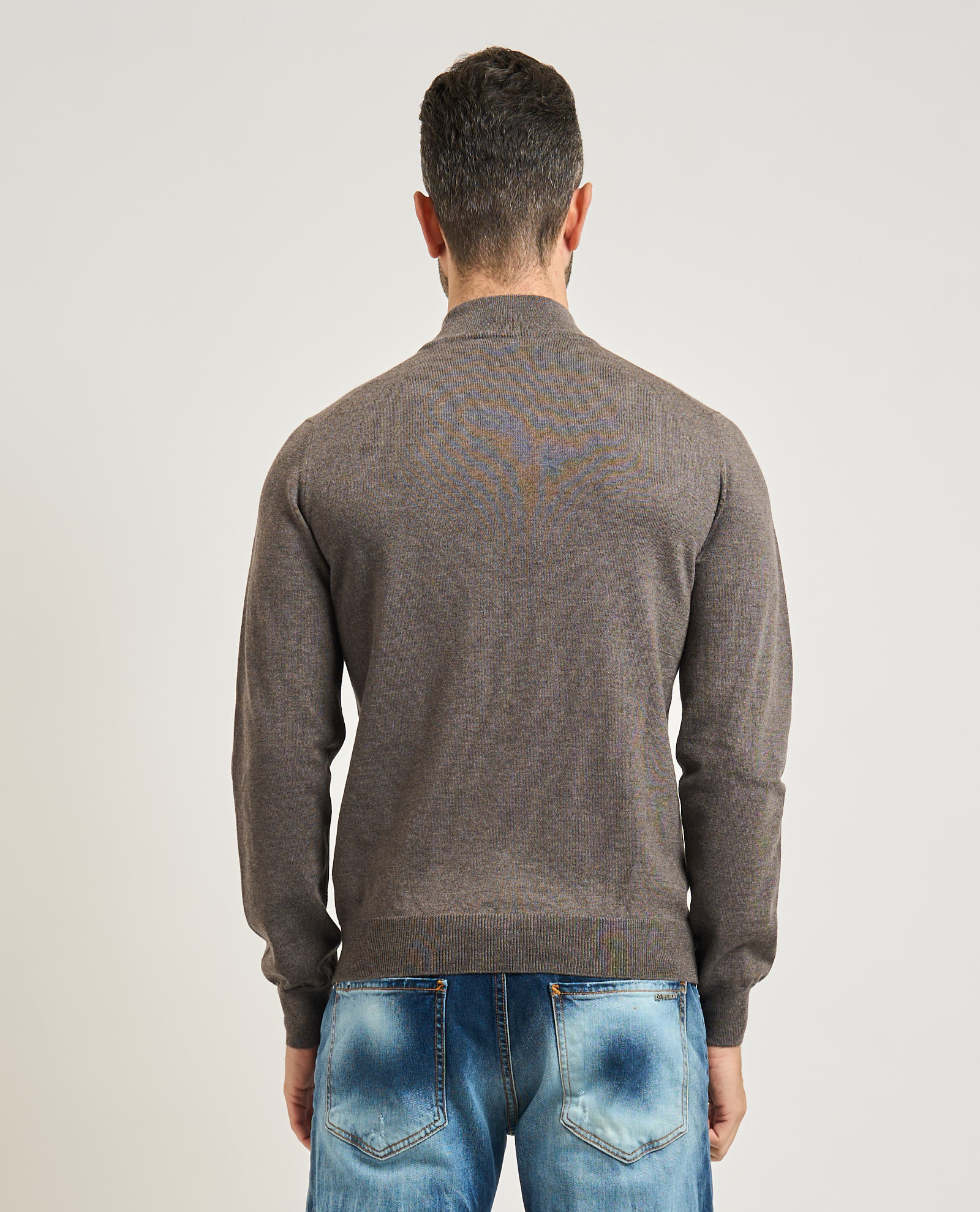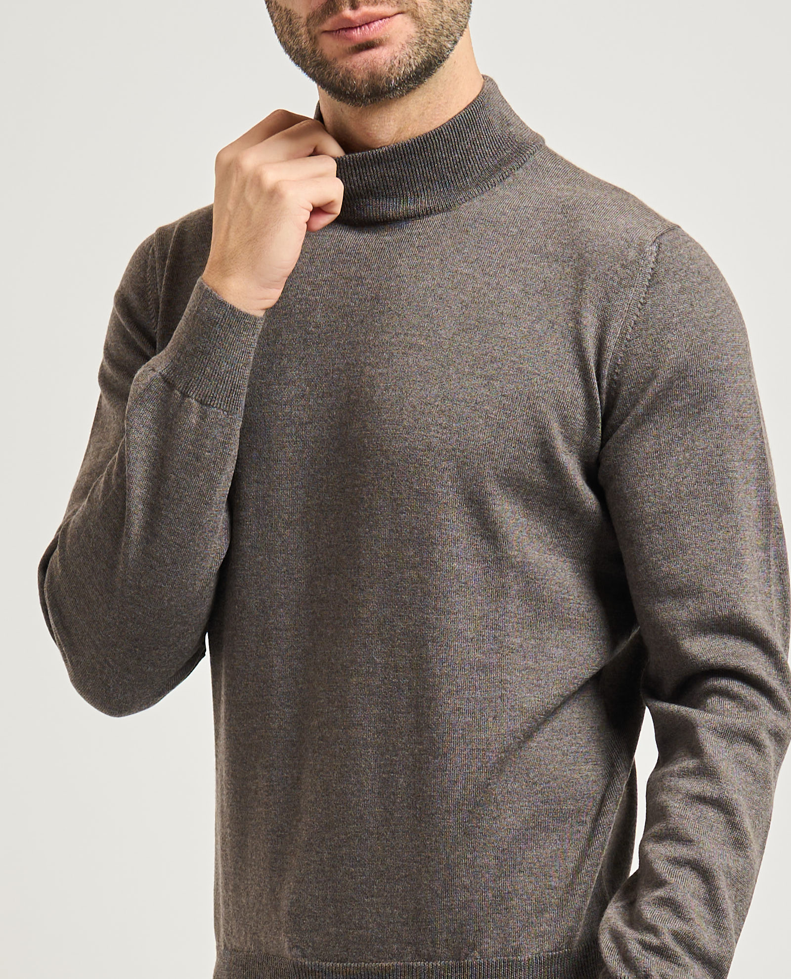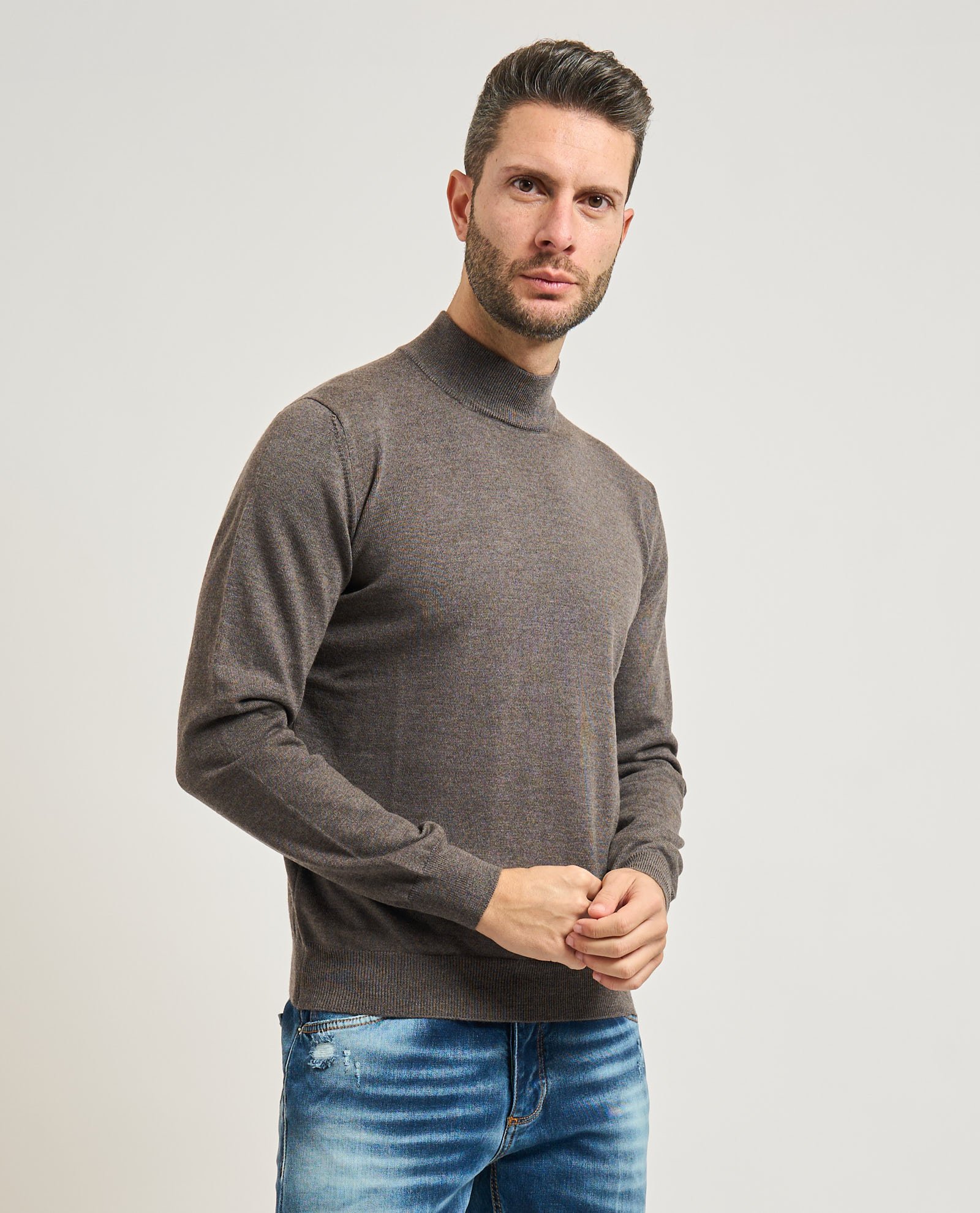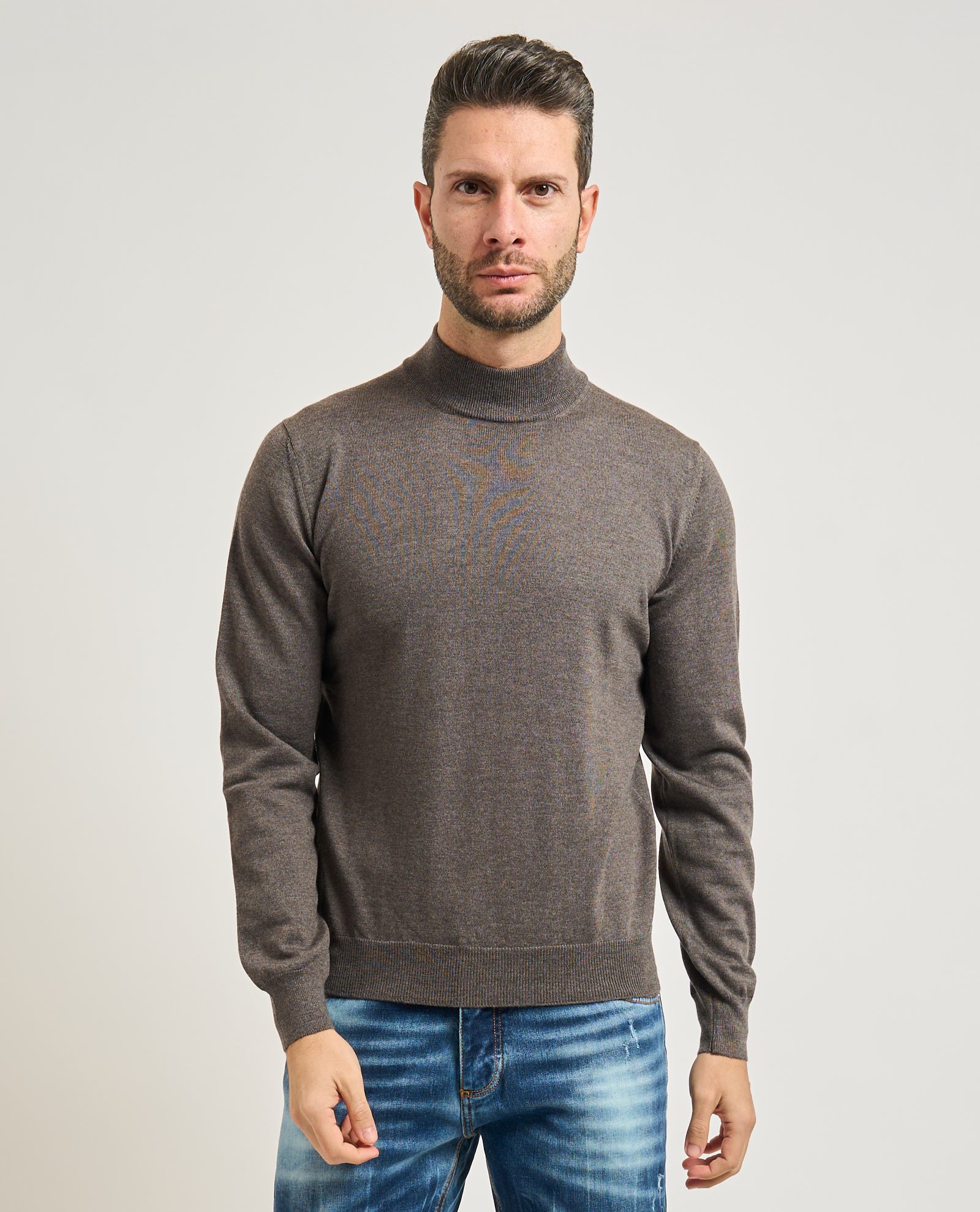 Maglione a collo alto da uomo firmato Gran Sasso in lana merinos con orli a costine, vestibilità regular e in tinta unita. Il modello indossa una taglia M ed ha un'altezza di 1.85m