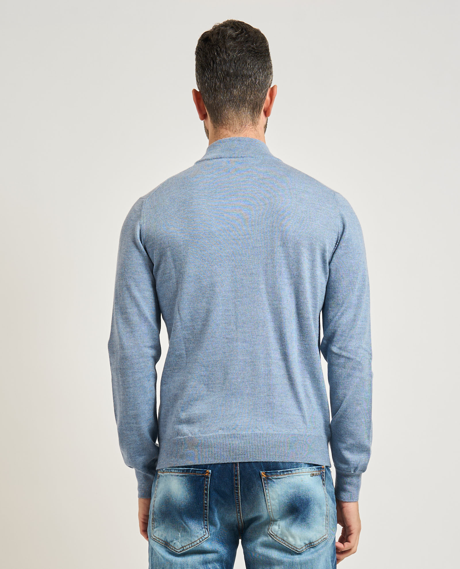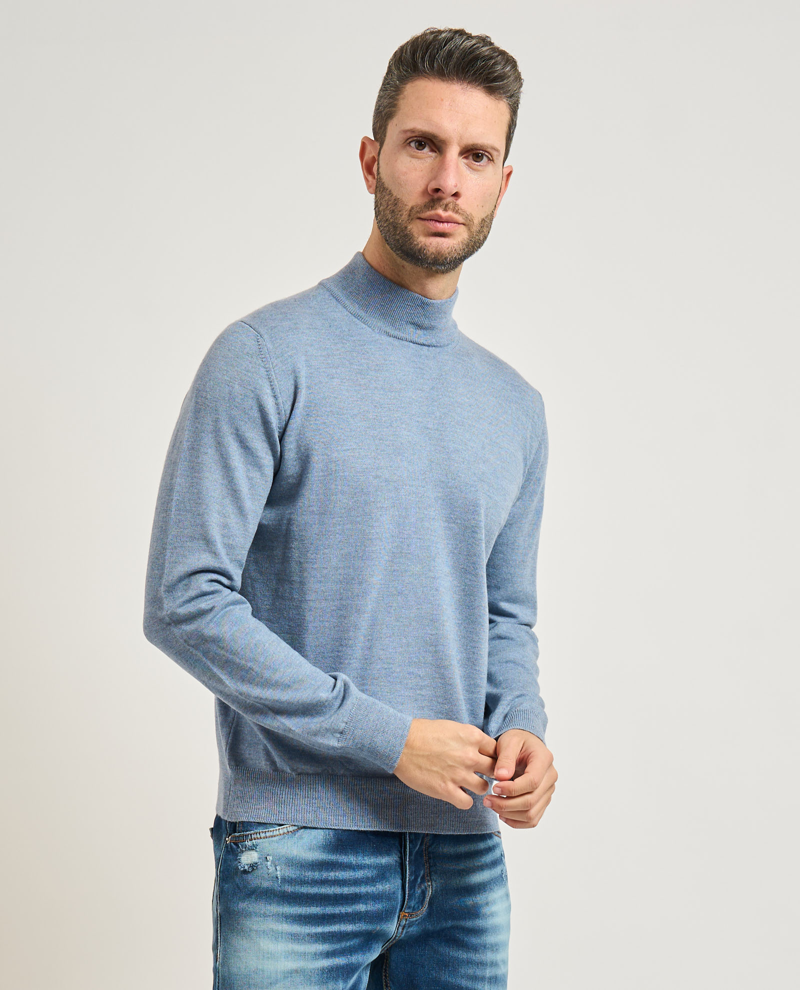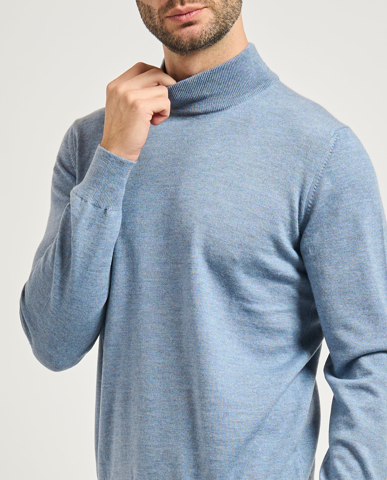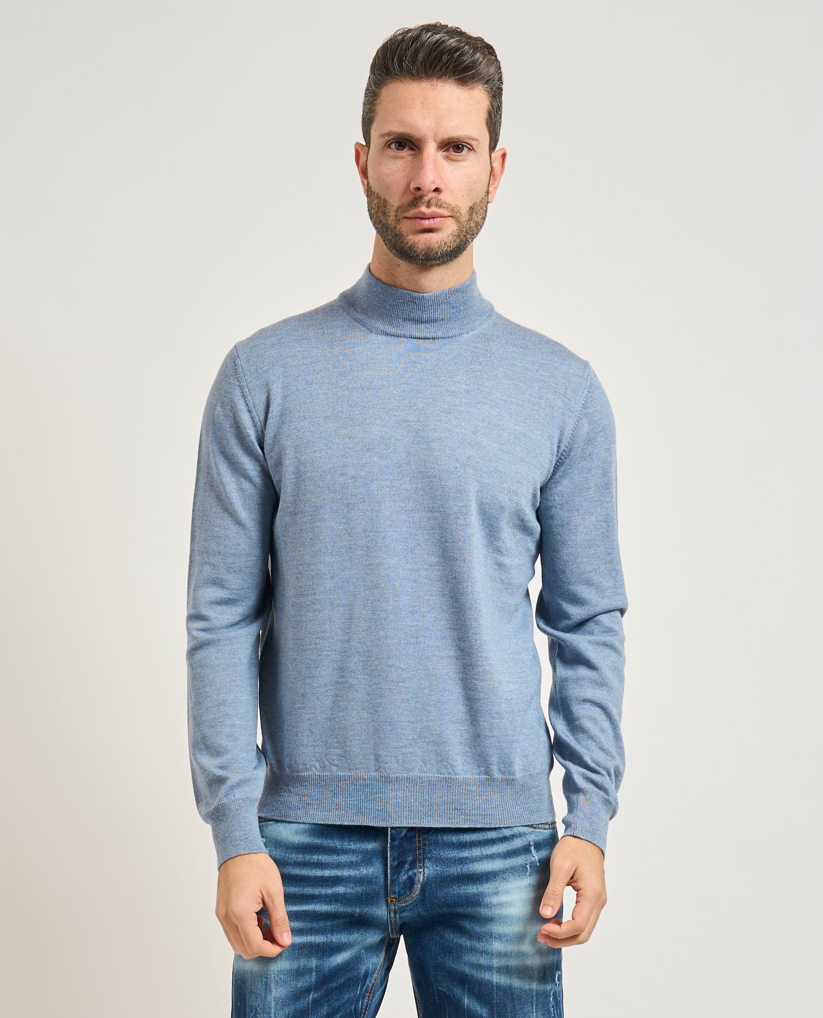 Maglione a collo alto da uomo firmato Gran Sasso in lana merinos con orli a costine, vestibilità regular e in tinta unita. Il modello indossa una taglia M ed ha un'altezza di 1.85m