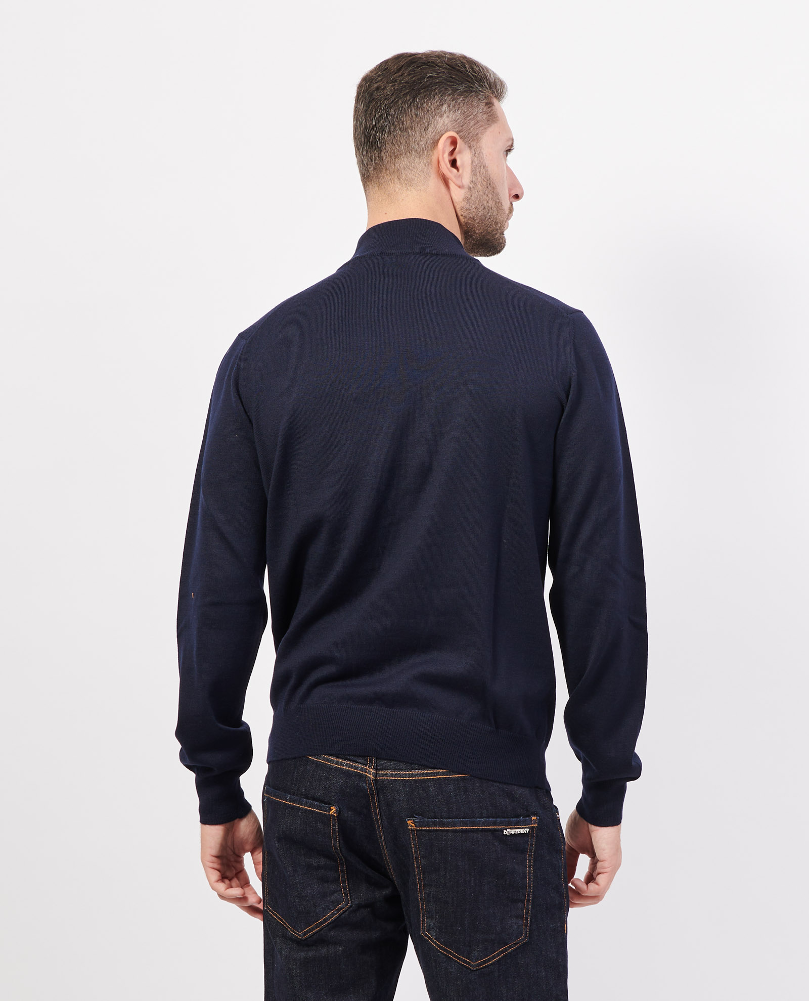 Maglione a collo alto da uomo firmato Gran Sasso in lana merinos con orli a costine, vestibilità regular e in tinta unita. Il modello indossa una taglia M ed ha un'altezza di 1.85m