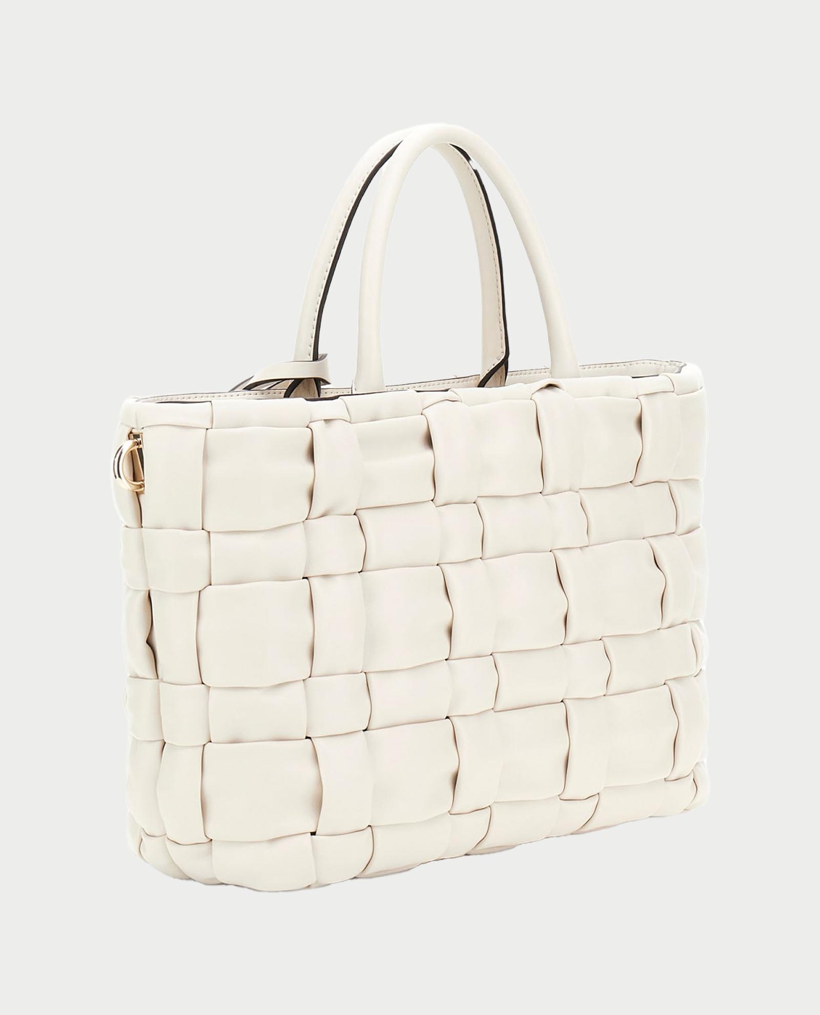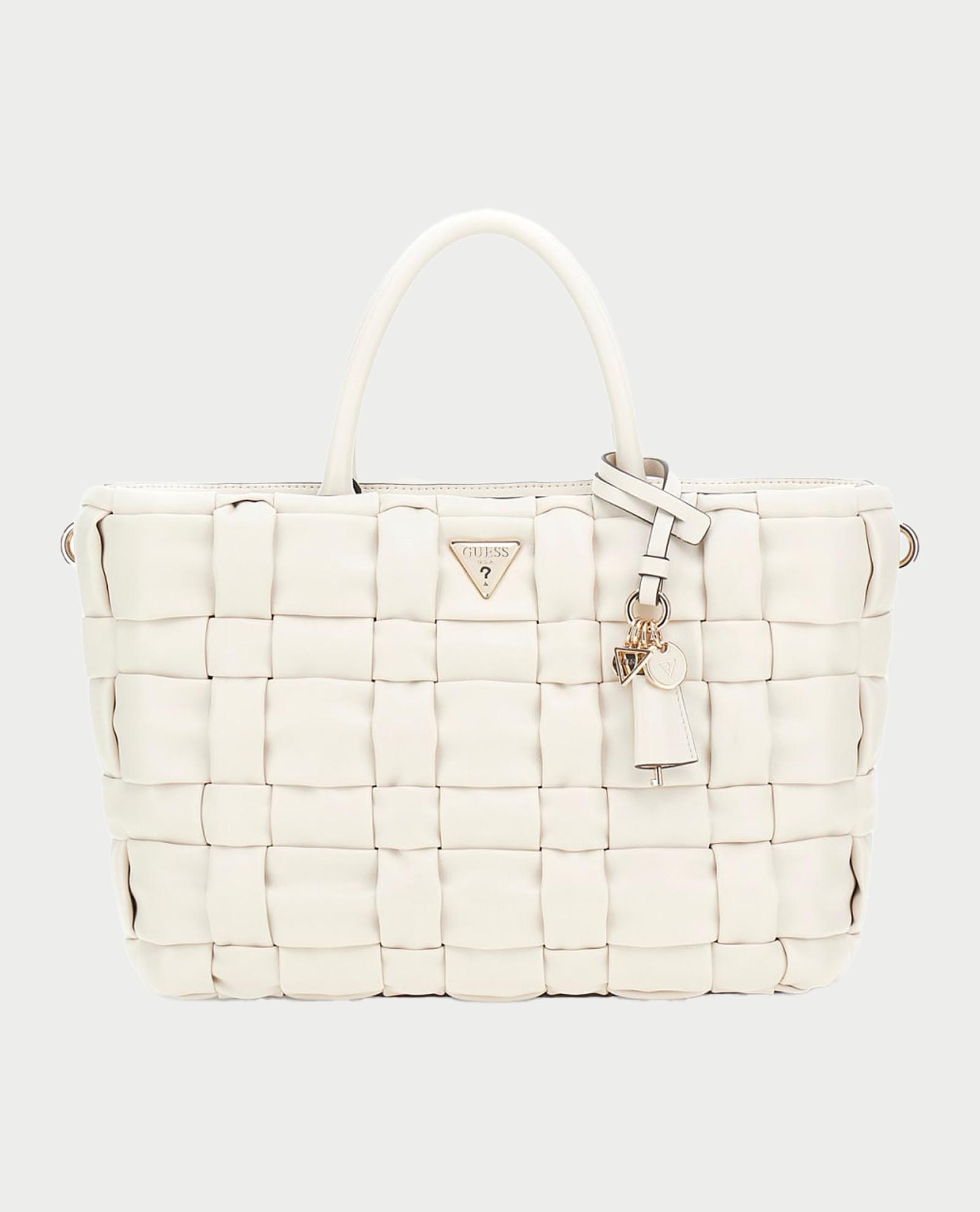 Borsa a mano per donna firmata Guess in similpelle intrecciata. Tracolla removibile, charm logato, chiusura con bottone, metallleria dorata. Misure: 23x36x11cm