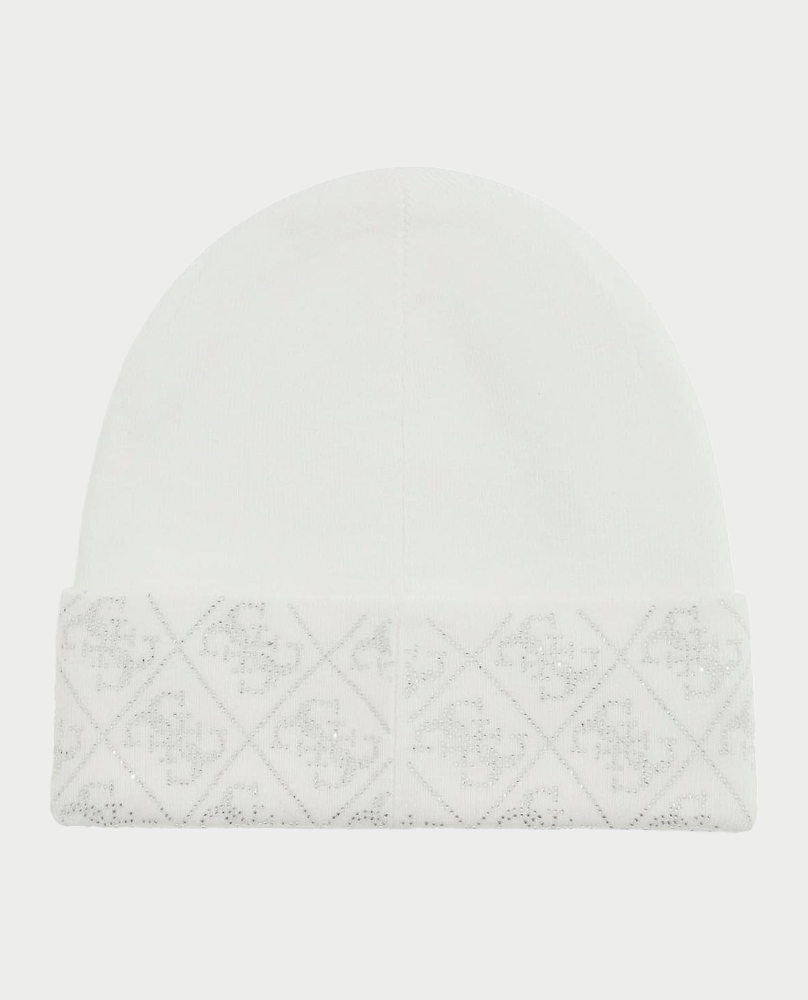 Cappello per donna firmato Guess realizzato in misto viscosa. Fantasia con logo 4G e strass.