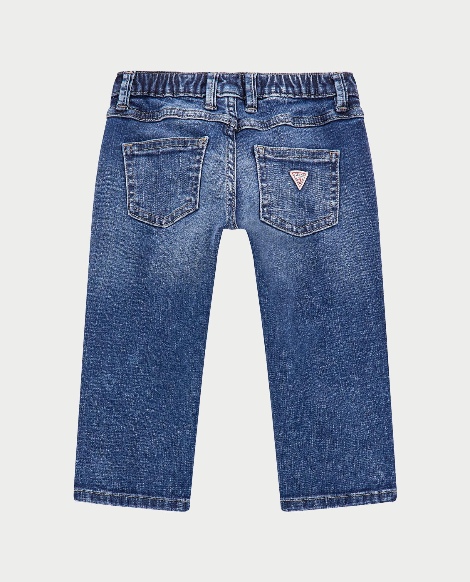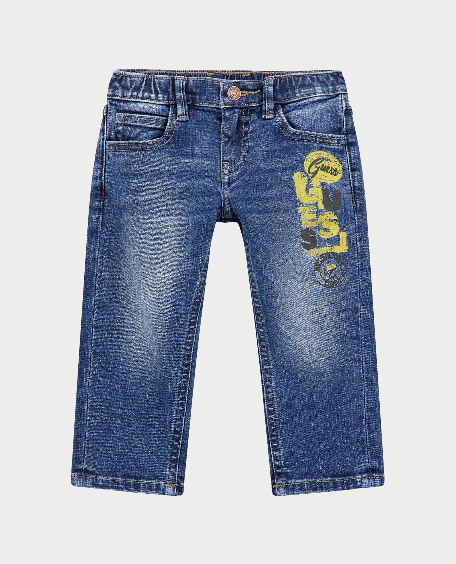 Jeans bambino Guess con patch sulla gamba, regular fit ed elastico in vita.