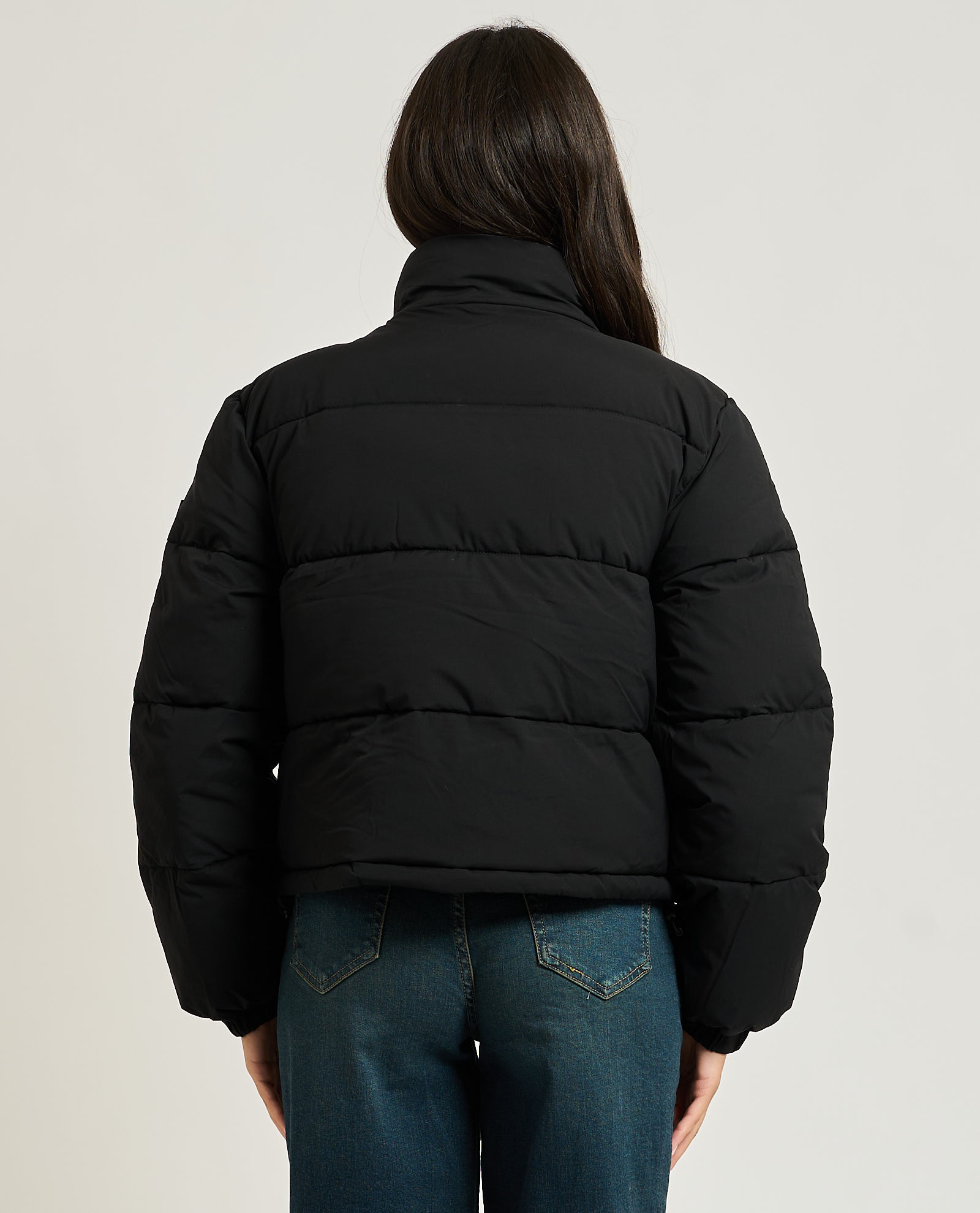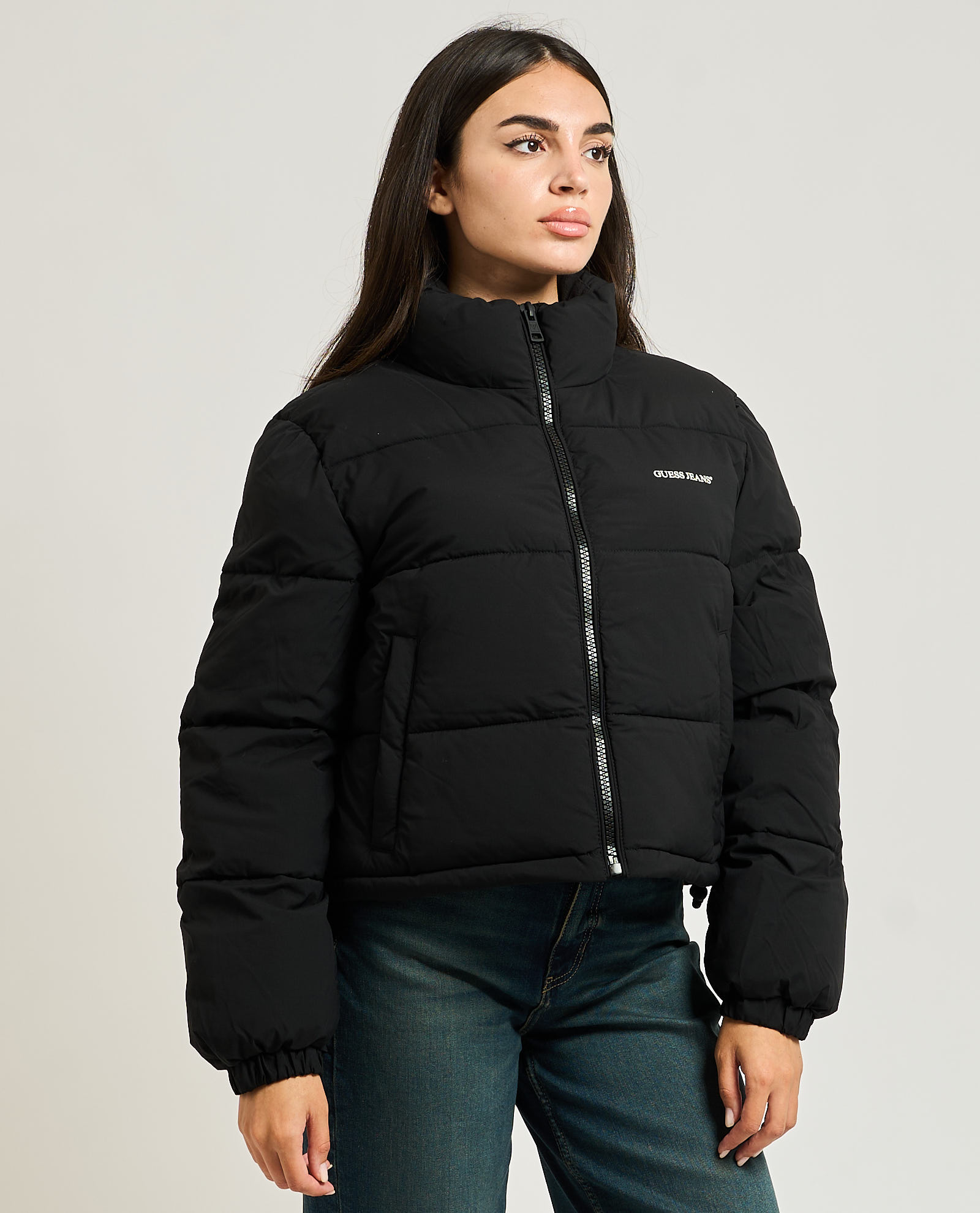 Piumino laminato trapuntato per donna firmato Guess Jeans. Collo alto, maniche lunghe, chiusura e tasche fullzip, collo sul petto.
