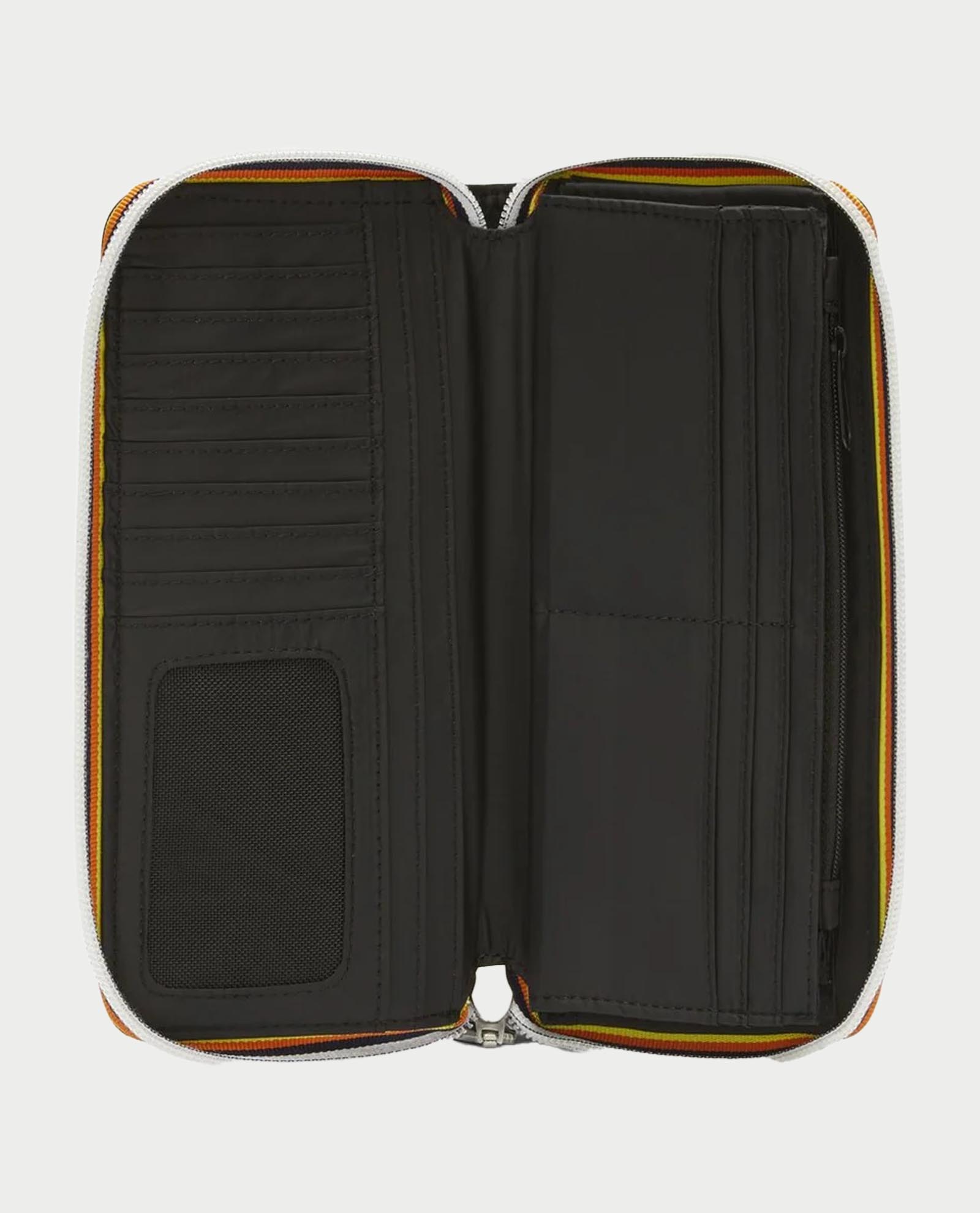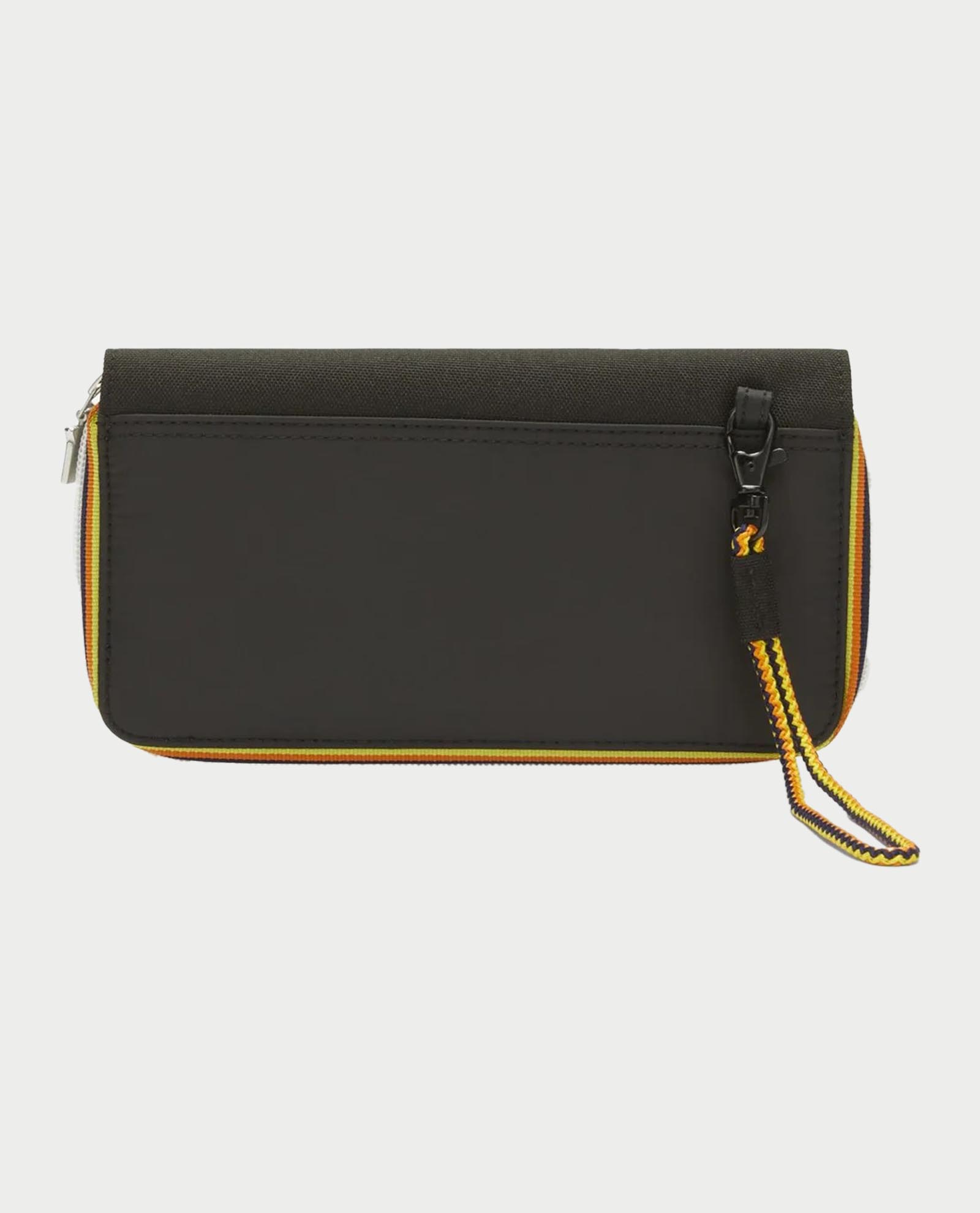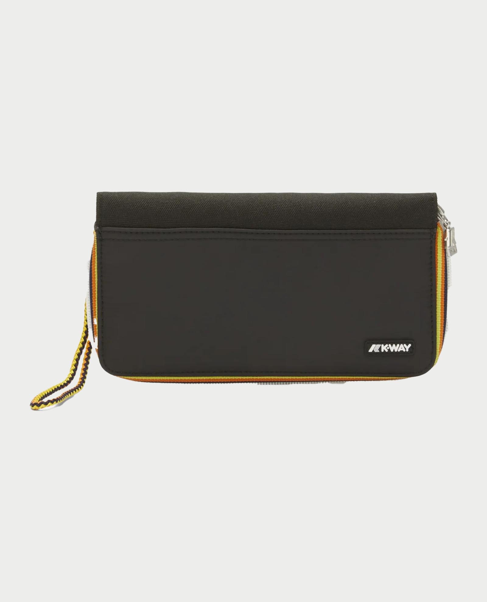 Portafogli zip around unisex di K-way in tessuto rinforzato. Scompartimenti interni porta tessere, porta foto, porta monete e porta banconote. Logo bianco in silicone. Misure: 20x10xcm