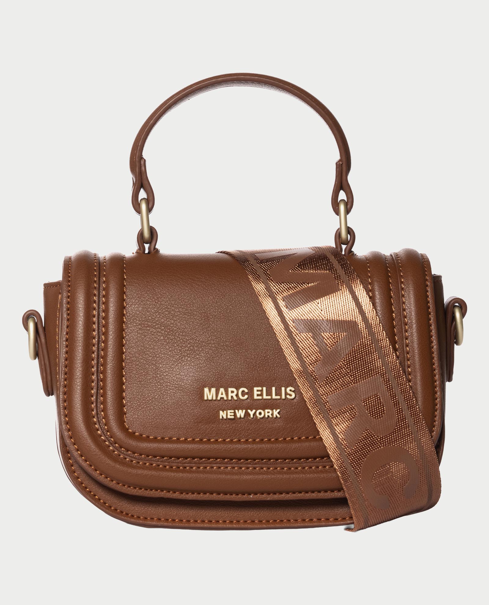 Borsa a mano per donna di Marc Ellis in similpelle. Patta frontale con chiusura magnetica, logo dorato in evidenza. Scomparto interno foderato, taschina con zip. Una tracolla sottile in ecopelle e una doppia in tessuto logato. Misure: 19x14,5x7cm